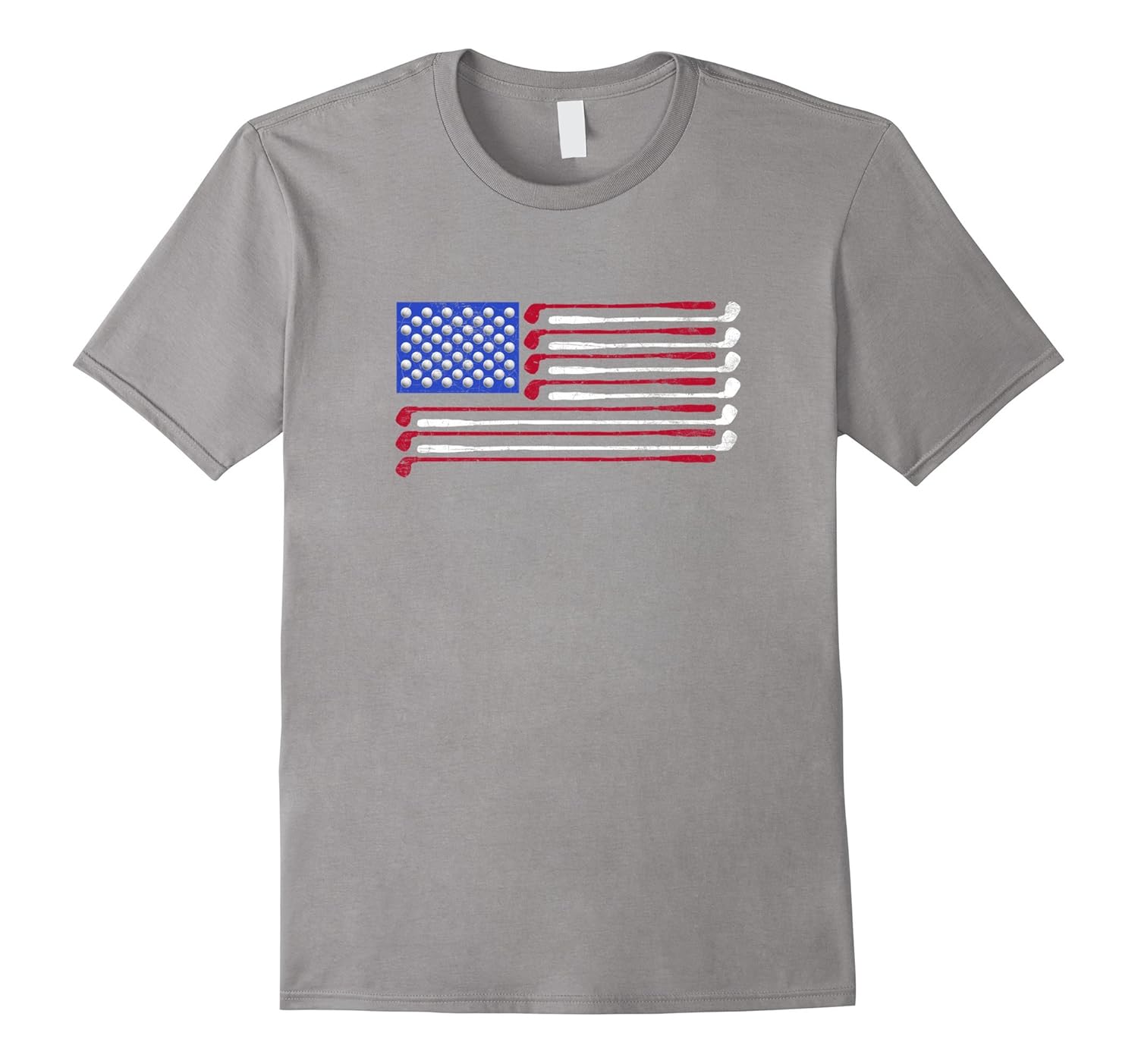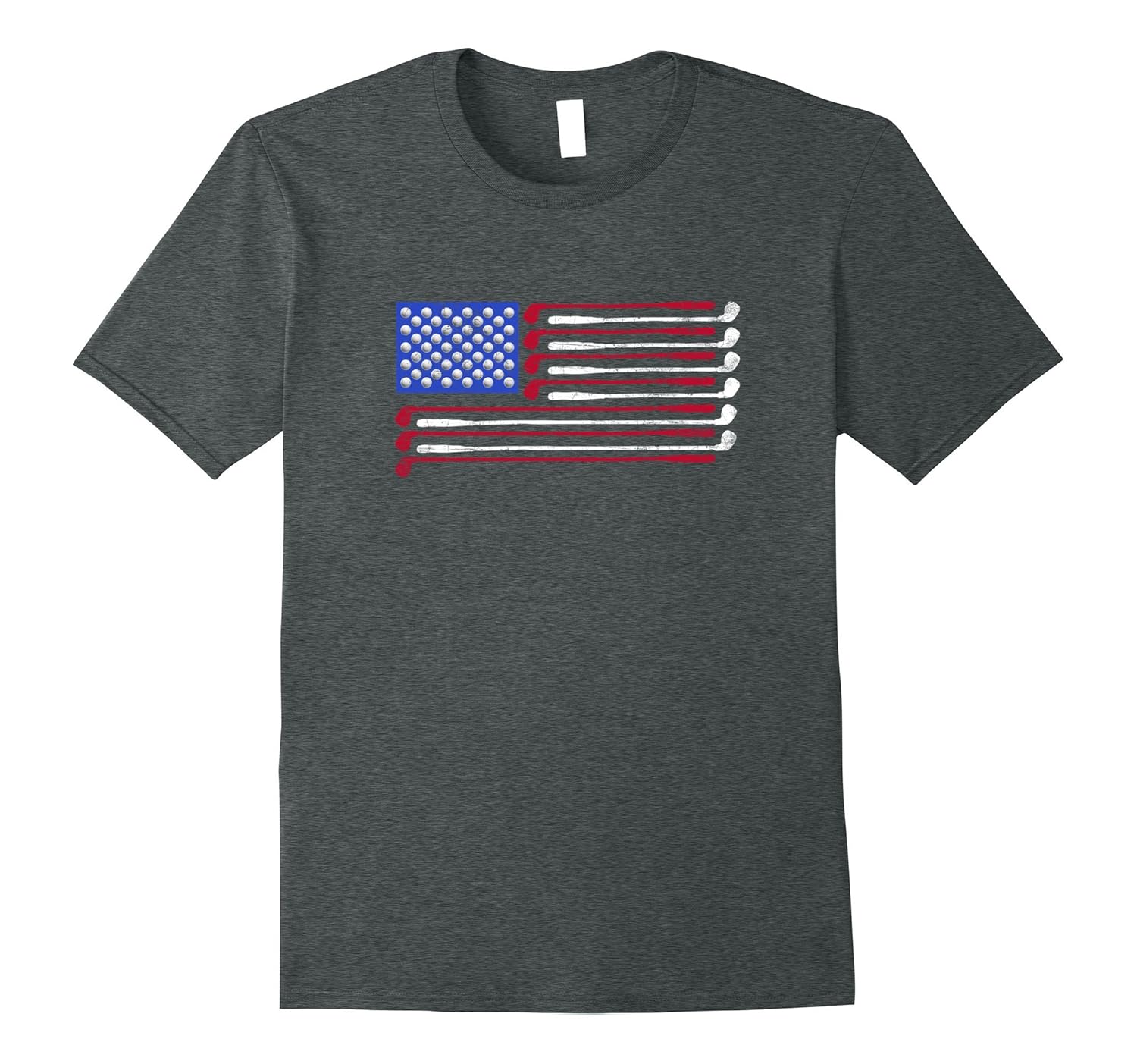 Solid colors: 100% Cotton; Heather Grey: 90% Cotton, 10% Polyester; All Other Heathers: 50% Cotton, 50% Polyester; Imported; Machine wash cold with like colors, dry low heat; Distressed golf design featuring the U.S flag with the stars replaced with golf balls Andamp; the stripes as clubs.; Check out our brand for more golf humor t shirts, funny golf shirts Andamp; golf novelty shirts. Great fathers day gift for a Golf Papa.; Lightweight, Classic fit, Double-needle sleeve and bottom hem