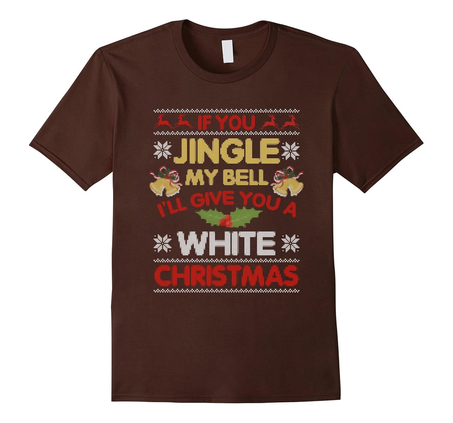 Solid colors: 100% Cotton; Heather Grey: 90% Cotton, 10% Polyester; All Other Heathers: 65% Cotton, 35% Polyester; Imported; Machine wash cold with like colors, dry low heat; Featuring snowflakes, holly and berries and two big bells. If you jingle my bells Ill give you a white Christmas. Holiday humor for adults! Ugly sweater style graphic design.; Perfect for the adult with a twisted sense of humor that loves Christmas! Great gag gift for you husband or boyfriend for the holiday season!; Lightweight, Classic fit, Double-needle sleeve and bottom hem