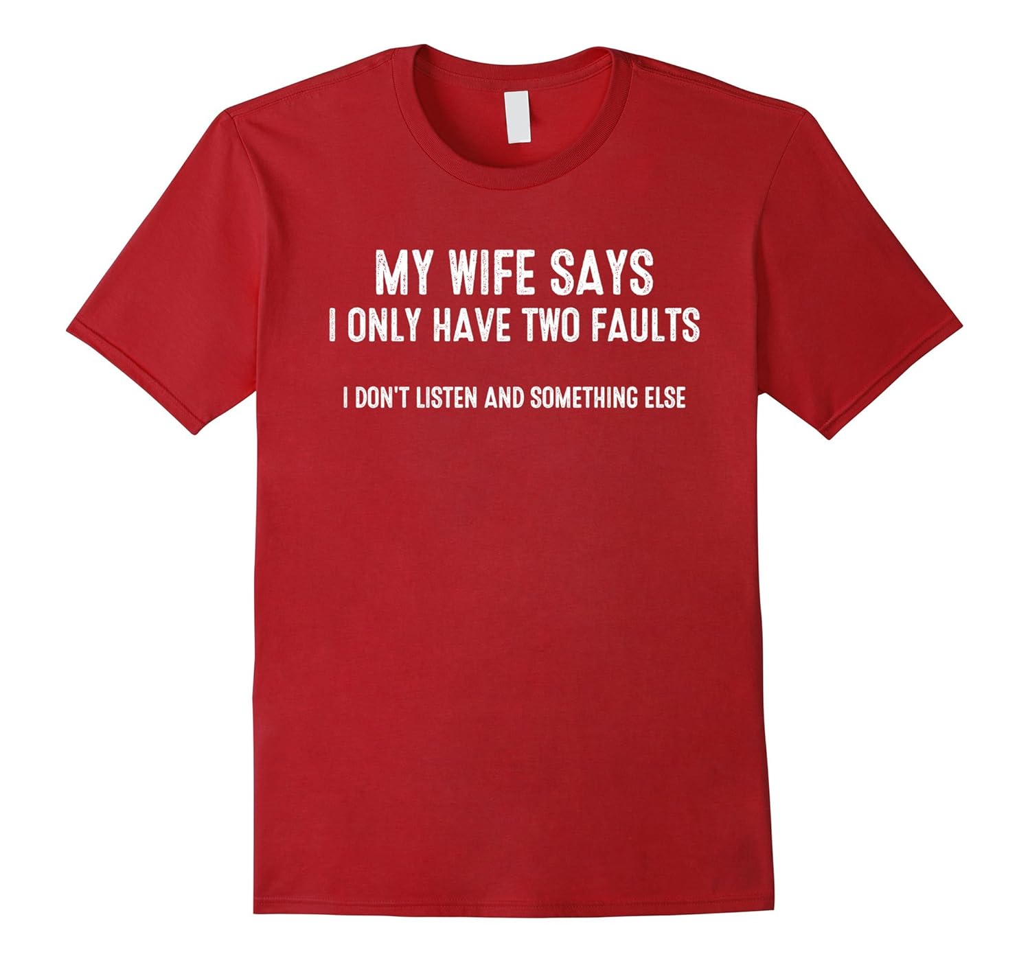 Solid colors: 100% Cotton; Heather Grey: 90% Cotton, 10% Polyester; All Other Heathers: 65% Cotton, 35% Polyester, Imported, Machine wash cold with like colors, dry low heat, MY WIFE SAYS I ONLY HAVE TWO FAULTS I DON”T LISTEN AND SOMETHING ELSE, MY WIFE SAYS I ONLY HAVE TWO FAULTS I DON”T LISTEN AND SOMETHING ELSE FUNNY T-SHIRT, Lightweight, Classic fit, Double-needle sleeve and bottom hem
