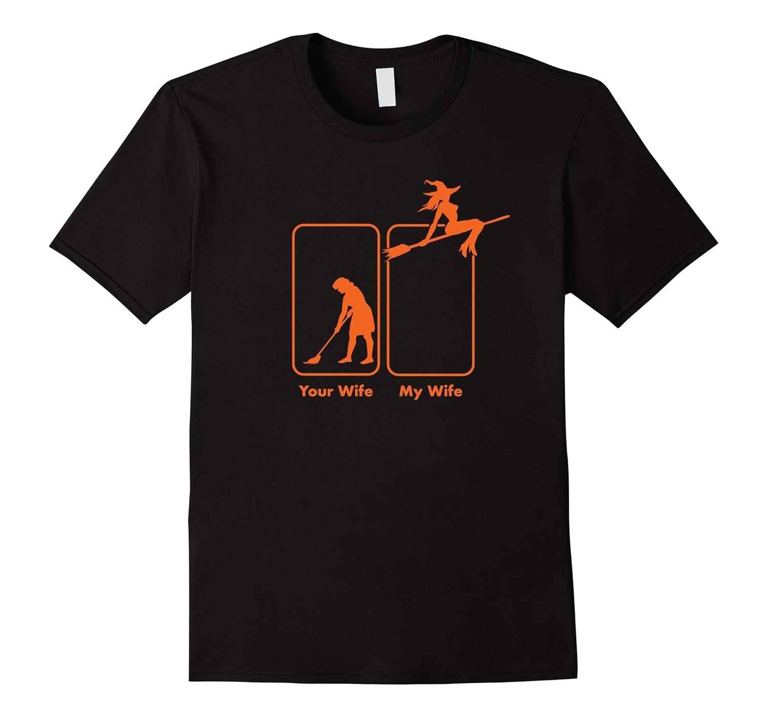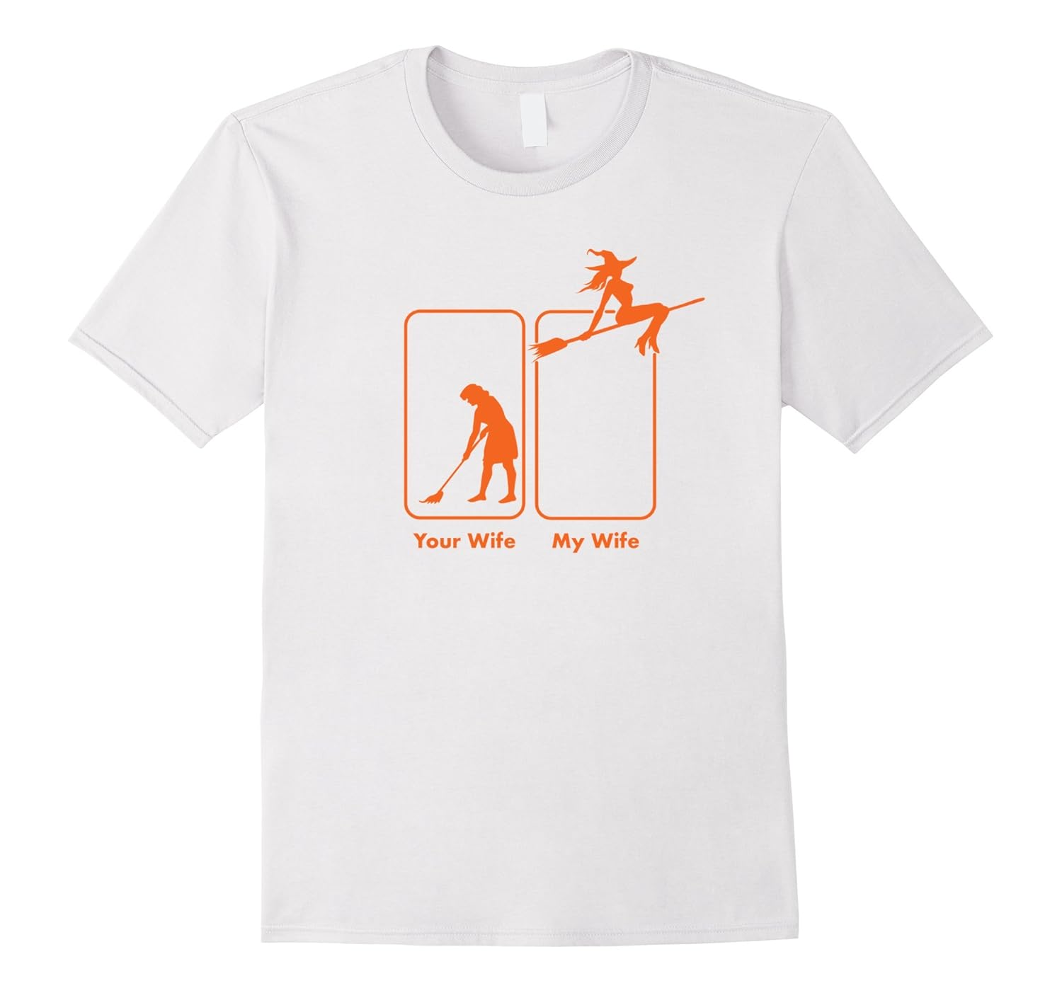 Solid colors: 100% Cotton; Heather Grey: 90% Cotton, 10% Polyester; All Other Heathers: 65% Cotton, 35% Polyester, Imported, Machine wash cold with like colors, dry low heat, This hilarious t-shirt contrasts a normal wife sweeping with a broom and a sexy looking witch wife, riding a broomstick. This tshirt is a joke and is intended to be a gift from a wife to a husband, or a husband may buy it on his own. Either way, his wife will enjoy this humorous gift this Halloween. Lightweight, Classic fit, Double-needle sleeve and bottom hem