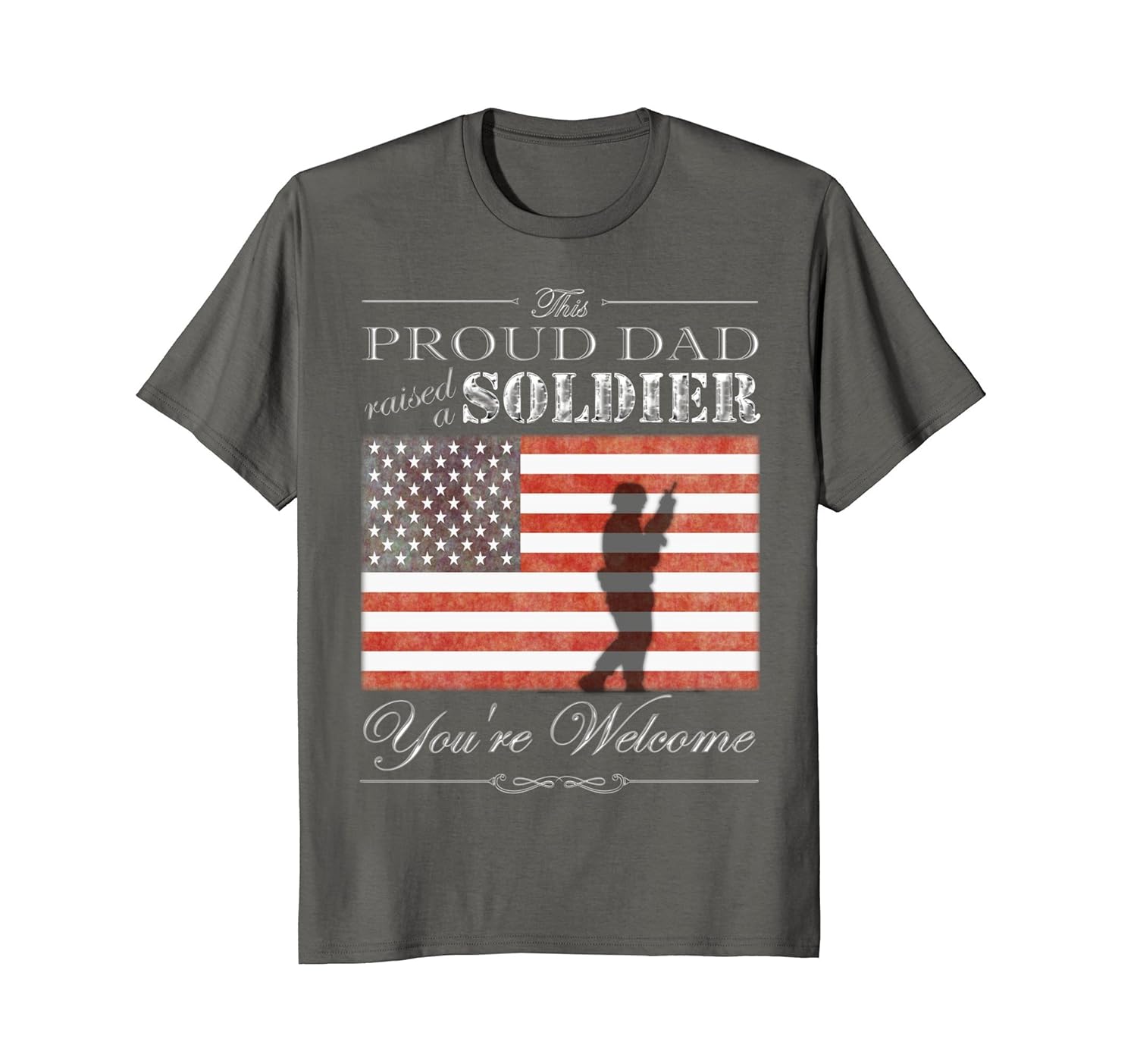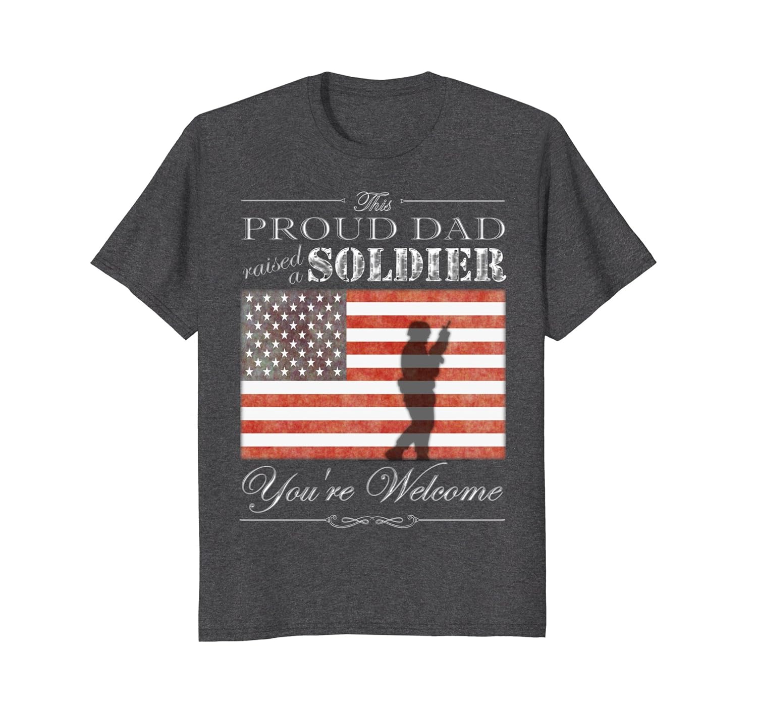 Solid colors: 100% Cotton; Heather Grey: 90% Cotton, 10% Polyester; All Other Heathers: 50% Cotton, 50% Polyester; Imported; Machine wash cold with like colors, dry low heat; Proud dad raised a soldier, youre welcome. Thank Andamp; honor armed forces, fallen heroes, Gold Star family father stepdad grandpa. Brave kids serve protect defend country, freedom. Vintage stars Andamp; stripes salute deployed active duty, reserve officer, veteran; Proud dad tee, military dad tshirt, soldier dad shirt for Fathers Day (dont forget grandpa!), Memorial Day, July 4th/Independence Day, holidays to support our troops, remember the fallen, honor your son/daughter, thank all our hero children; Lightweight, Classic fit, Double-needle sleeve and bottom hem
