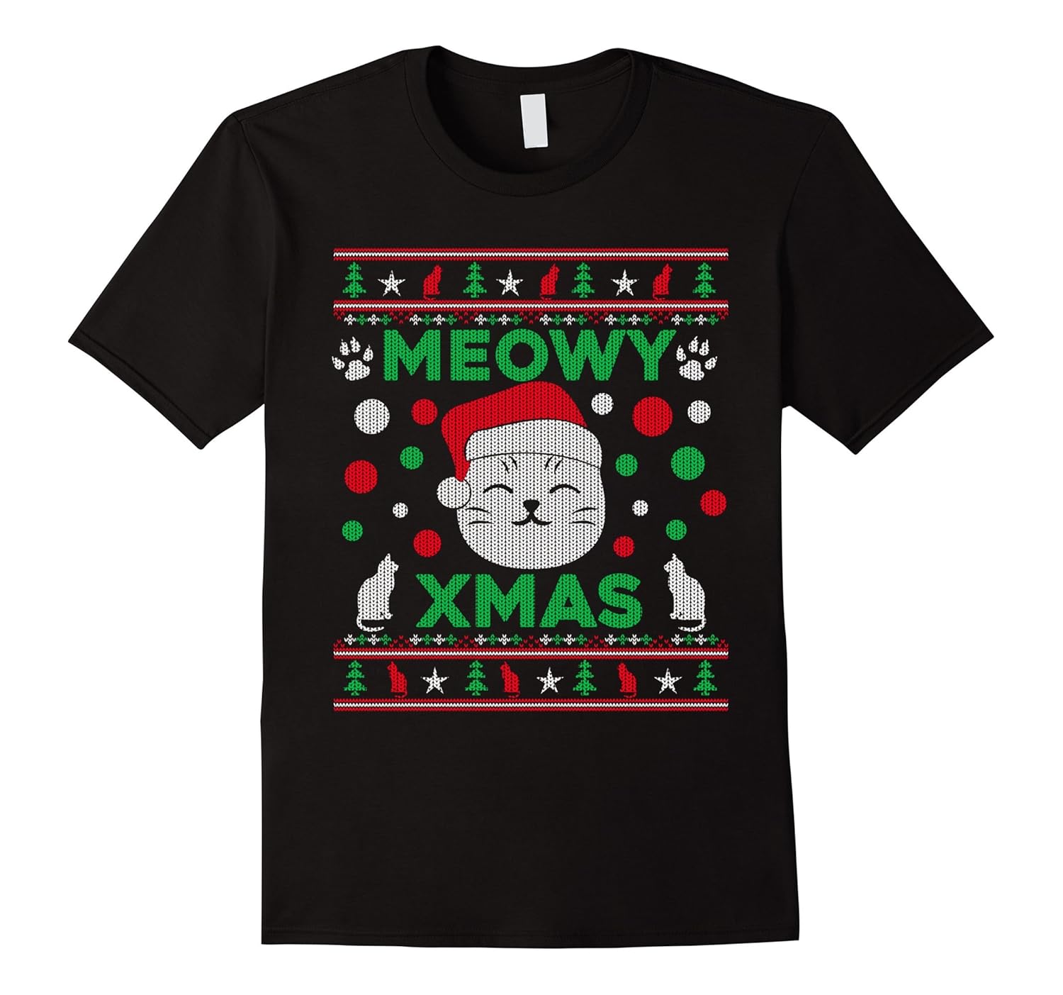 Solid colors: 100% Cotton; Heather Grey: 90% Cotton, 10% Polyester; All Other Heathers: 65% Cotton, 35% Polyester; Imported; Machine wash cold with like colors, dry low heat; Meowy Xmas Ugly Christmas Sweater Style T-Shirt With Cat – Love those ugly Christmas sweaters but dont want something so heavy? These ugly Christmas sweater style shirts have great artwork with a stitching effect. Get yours today.; Do you love Christmas? Favorite holiday of the year? Love Christmas trees, lights, presents, gifts, white snow? Plus Santa, his workshop, elves and the north pole. Maybe even a little eggnog and mistletoe? This great shirt makes a great Xmas gift!; Lightweight, Classic fit, Double-needle sleeve and bottom hem