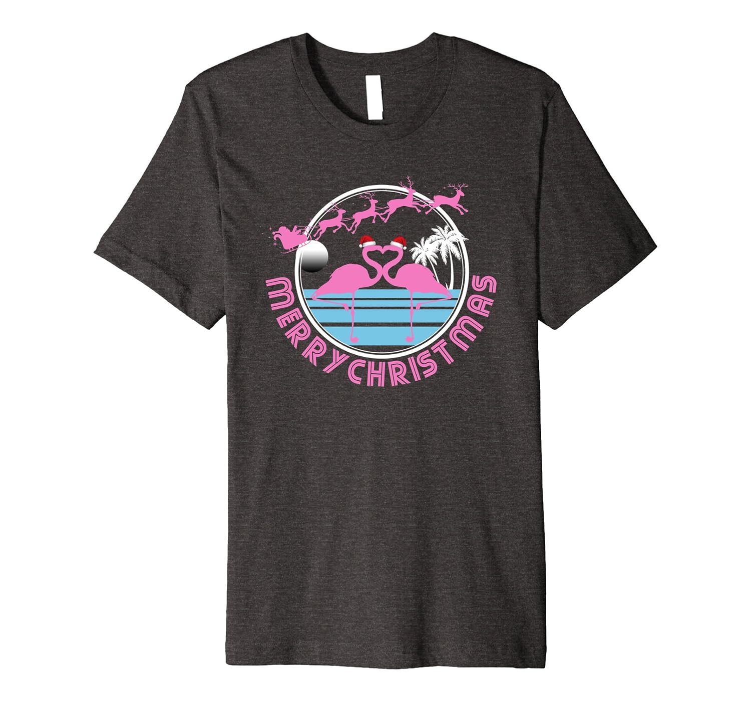 Solid colors: 100% Cotton; Heather Grey: 90% Cotton, 10% Polyester; All Other Heathers: 58% Cotton, 42% Polyester; Imported; Machine wash cold with like colors, dry low heat; Cute flamingos Merry Christmas tshirt. A holiday jersey for men, women Andamp; kids Andamp; tropical Christmas vacation tee shirt for winter beach goers.; Fit: Slim (consider ordering a larger size for a looser fit); 70s Andamp; 80s vintage style Flamingo accessories Andamp; Christmas clothes for boys, girls or the whole family. Christmas apparel featuring pink flamingos, Santa, a sleigh, xmas hats Andamp; palm trees.; This premium t-shirt is made of lightweight fine jersey fabric