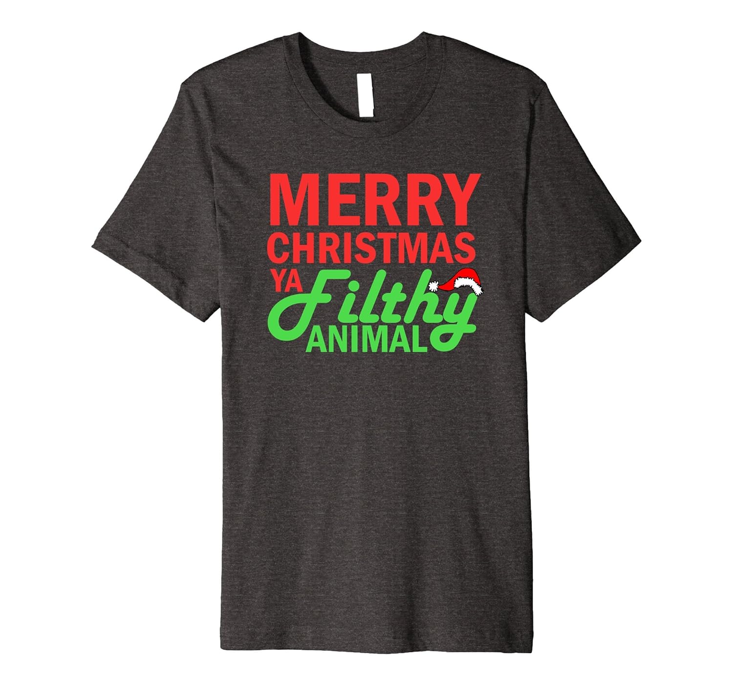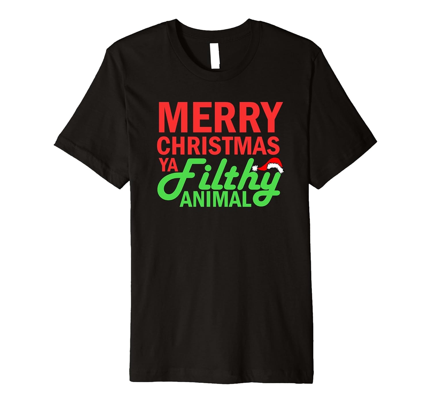 Solid colors: 100% Cotton; Heather Grey: 90% Cotton, 10% Polyester; All Other Heathers: 58% Cotton, 42% Polyester; Imported; Machine wash cold with like colors, dry low heat; Merry Christmas Ya Filthy Animal; Fit: Slim (consider ordering a larger size for a looser fit); Holiday Season, Festive, Cute, Holidays, Xmas; This premium t-shirt is made of lightweight fine jersey fabric