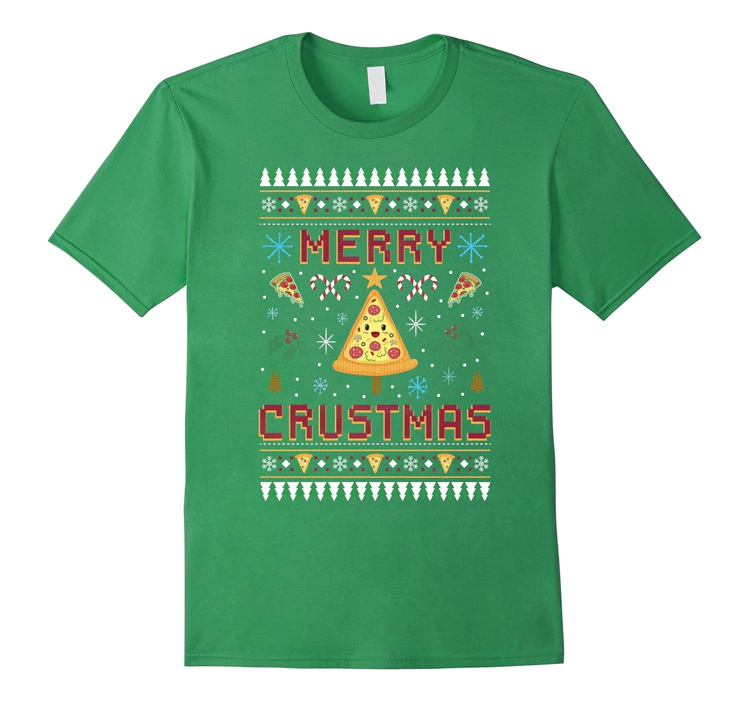 Solid colors: 100% Cotton; Heather Grey: 90% Cotton, 10% Polyester; All Other Heathers: 65% Cotton, 35% Polyester; Imported; Machine wash cold with like colors, dry low heat; Dress up this Christmas holiday with this awesome cartoon tee saying Merry Crustmas decorated in tacky ugly sweater pattern with pizza, bells, mistletoes, candy canes, snowflakes Andamp; pine trees! If you love to eat pizza, you need this hilarious outfit!; Makes a cool x-mas present or a gag birthday gift idea who loves funny pun quotes! Get compliments Andamp; good laughs when you wear this sarcastic tshirt to a pizza party or happy season greetings! Get your fat pants on, stay warm Andamp; have fun eating!; Lightweight, Classic fit, Double-needle sleeve and bottom hem