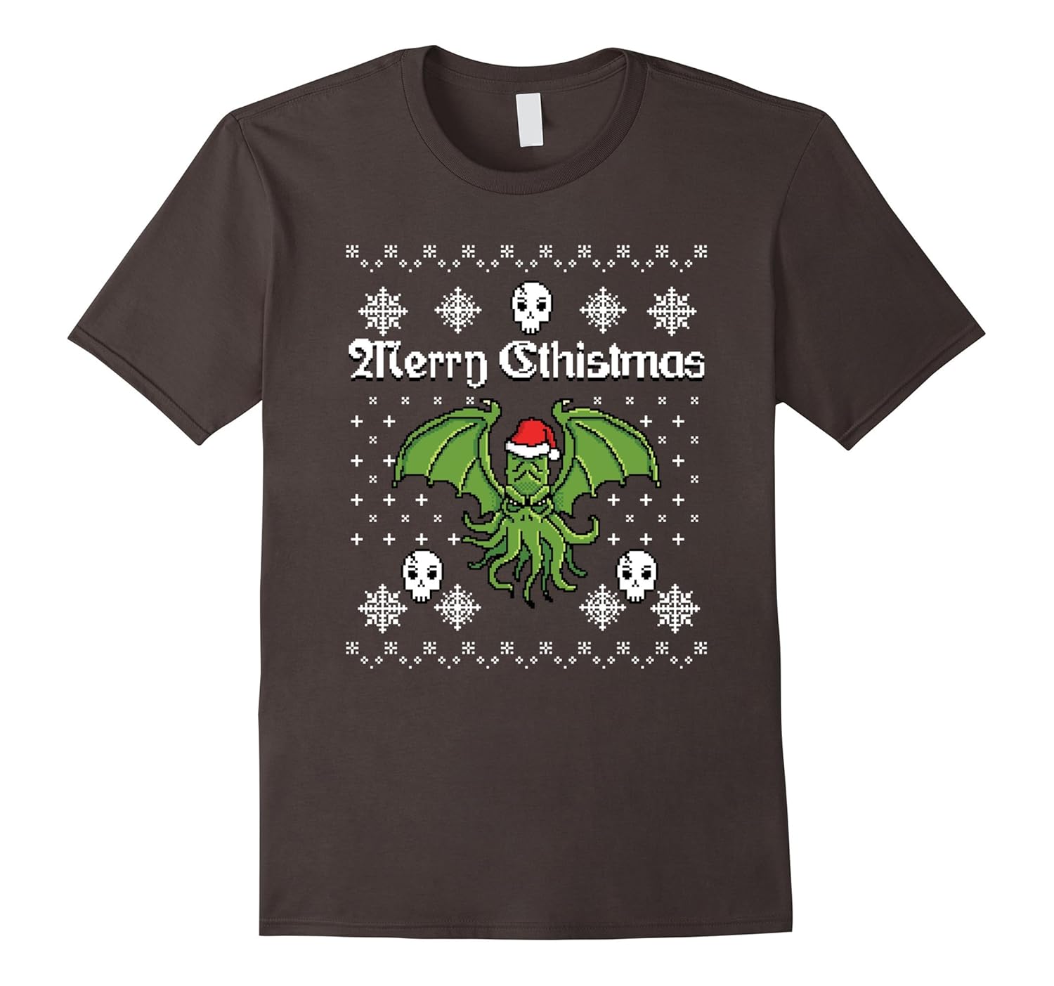 Solid colors: 100% Cotton; Heather Grey: 90% Cotton, 10% Polyester; All Other Heathers: 65% Cotton, 35% Polyester; Imported; Machine wash cold with like colors, dry low heat; Original ugly christmas sweater graphic tee design featuring our dark lord Cthulhu wearing a santa hat and skulls and snowflakes.; Designed for lovers of lovecrafts work, cthulhu, the necronomicon, christmas, the holidays, skulls, the occult, dark scary goth things and a fair dose of holiday irony.; Lightweight, Classic fit, Double-needle sleeve and bottom hem