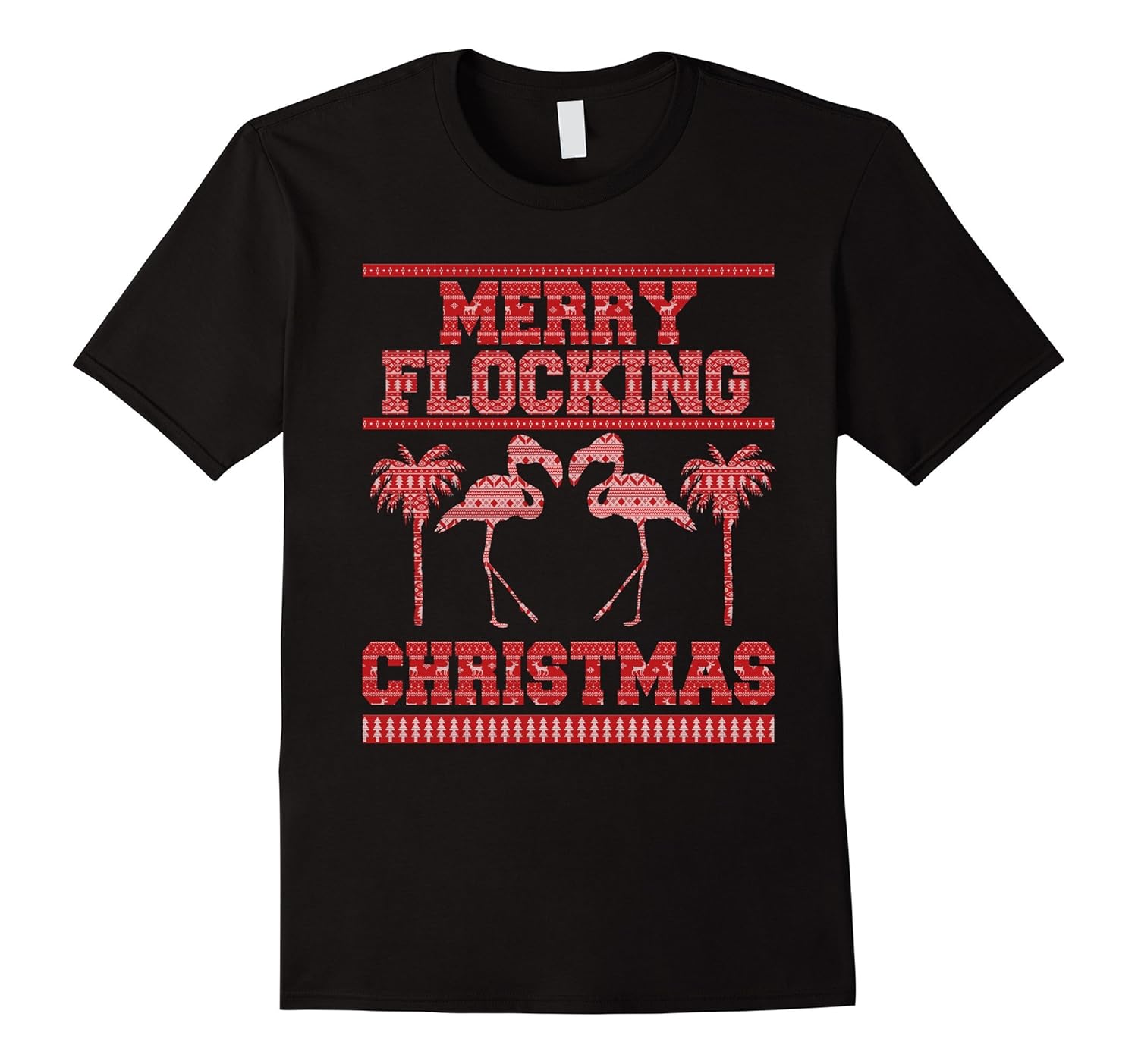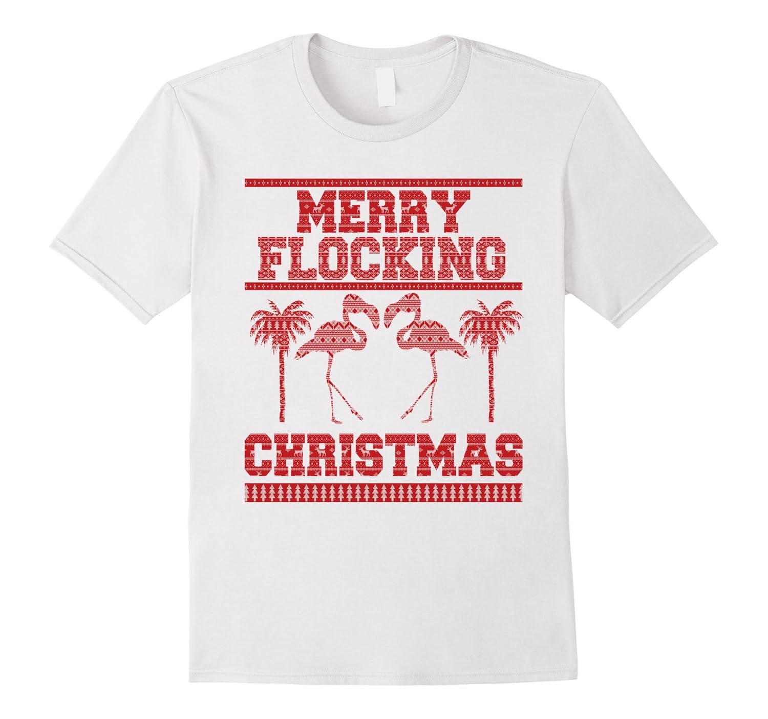Solid colors: 100% Cotton; Heather Grey: 90% Cotton, 10% Polyester; All Other Heathers: 65% Cotton, 35% Polyester, Imported, Machine wash cold with like colors, dry low heat, Funny tee shirt for an ugly Christmas sweater party. Features flamingos and palm trees. Xmas tree, reindeer, snowflake and snow stitch pattern. Lightweight, Classic fit, Double-needle sleeve and bottom hem