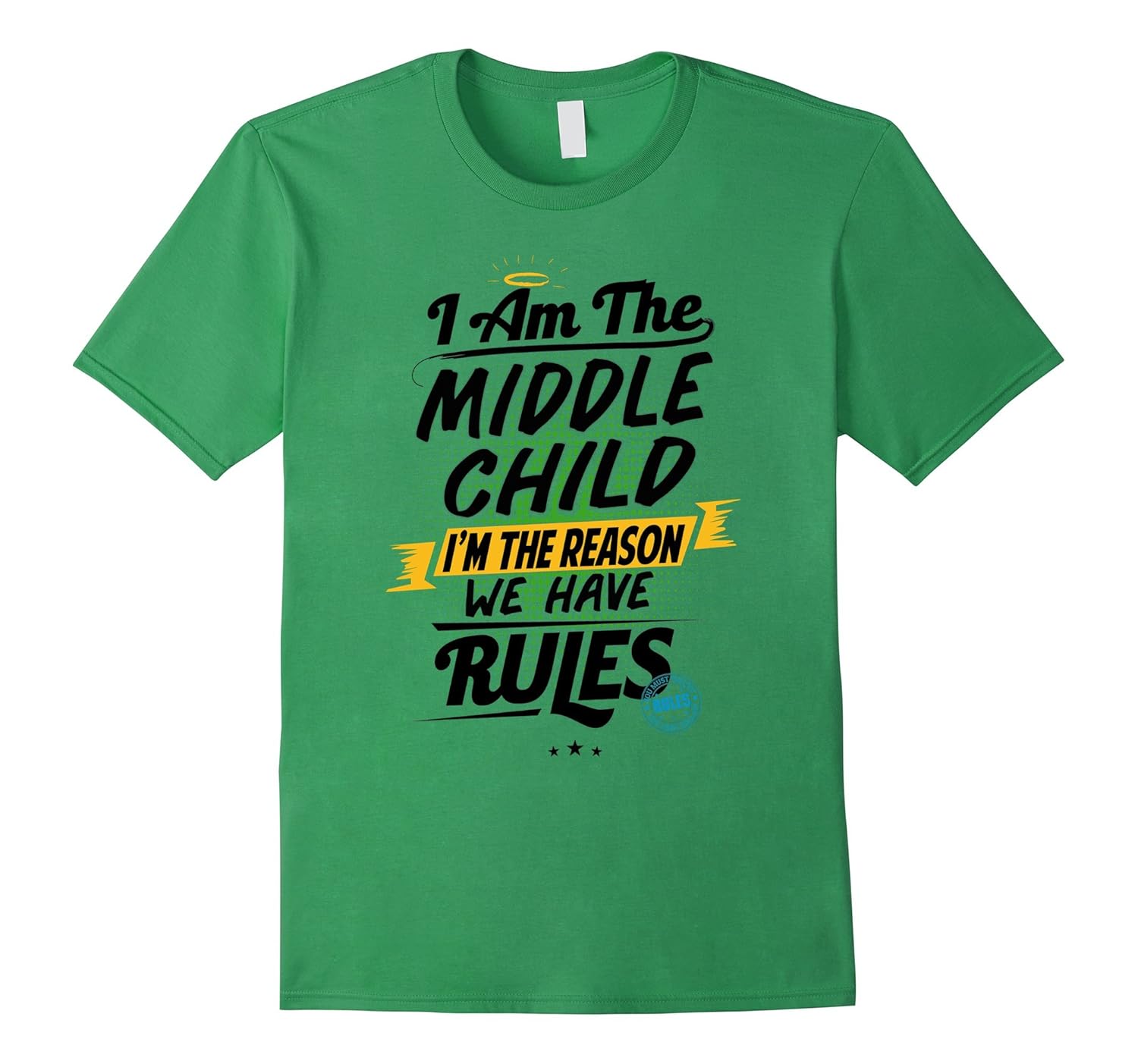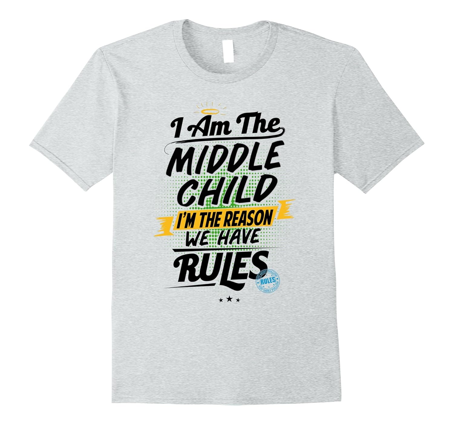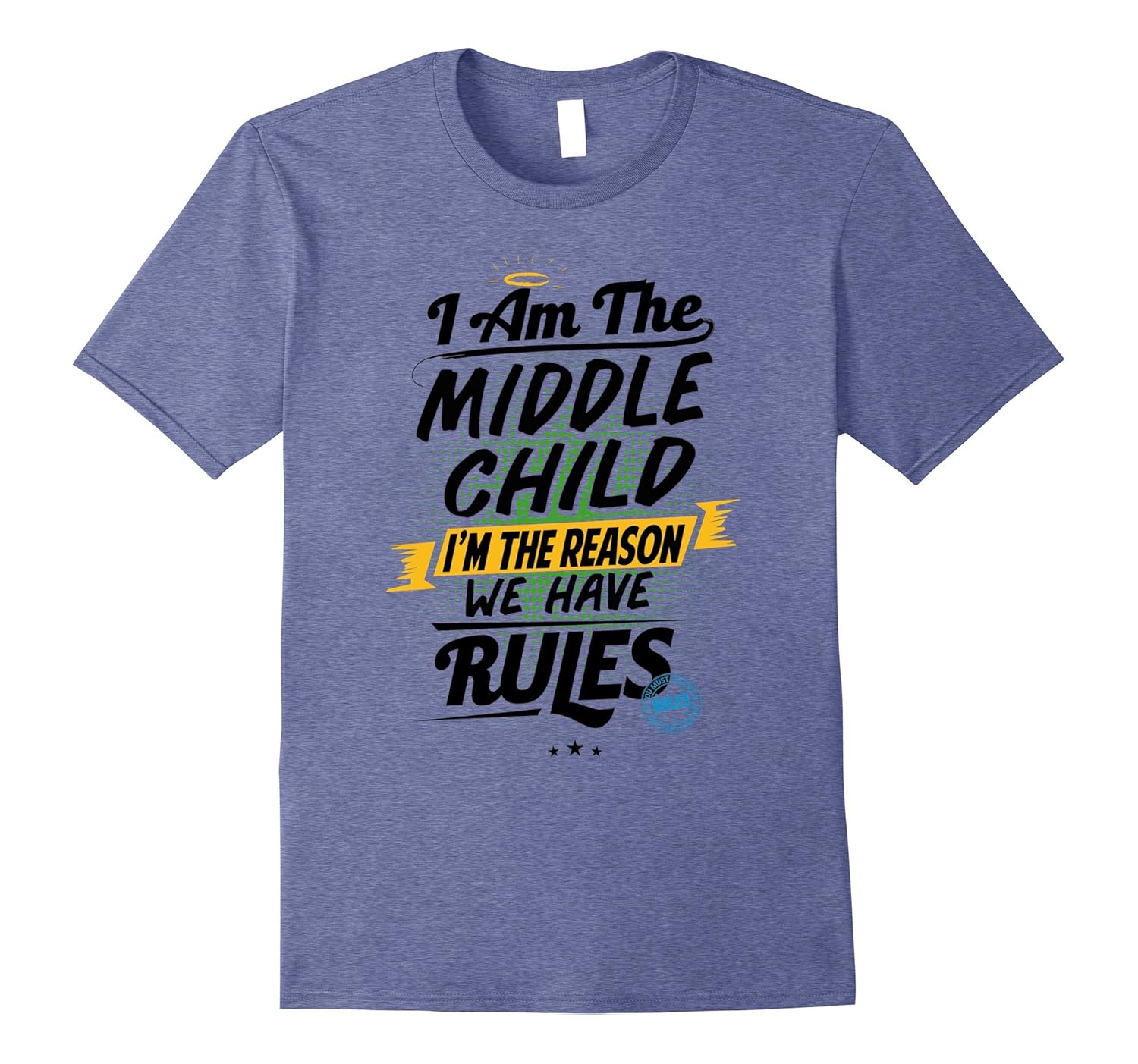 Solid colors: 100% Cotton; Heather Grey: 90% Cotton, 10% Polyester; All Other Heathers: 65% Cotton, 35% Polyester, Imported, Machine wash cold with like colors, dry low heat, Put your humor mode on with this awesome tshirt that reads I Am The Middle Child, I”m The Reason We Have Rules in colorful text with an angel ring on top. Have fun looking after your spoiled younger sibling and; ruled by your eldest bossy one!, Whether you”re a mom or dad looking for a fun child shirt for the oldest or youngest child, this funny design will become their favorite outfit! Comfortable and; stylish to wear during any occasion, parties, events, family gatherings and; back to school!, Lightweight, Classic fit, Double-needle sleeve and bottom hem