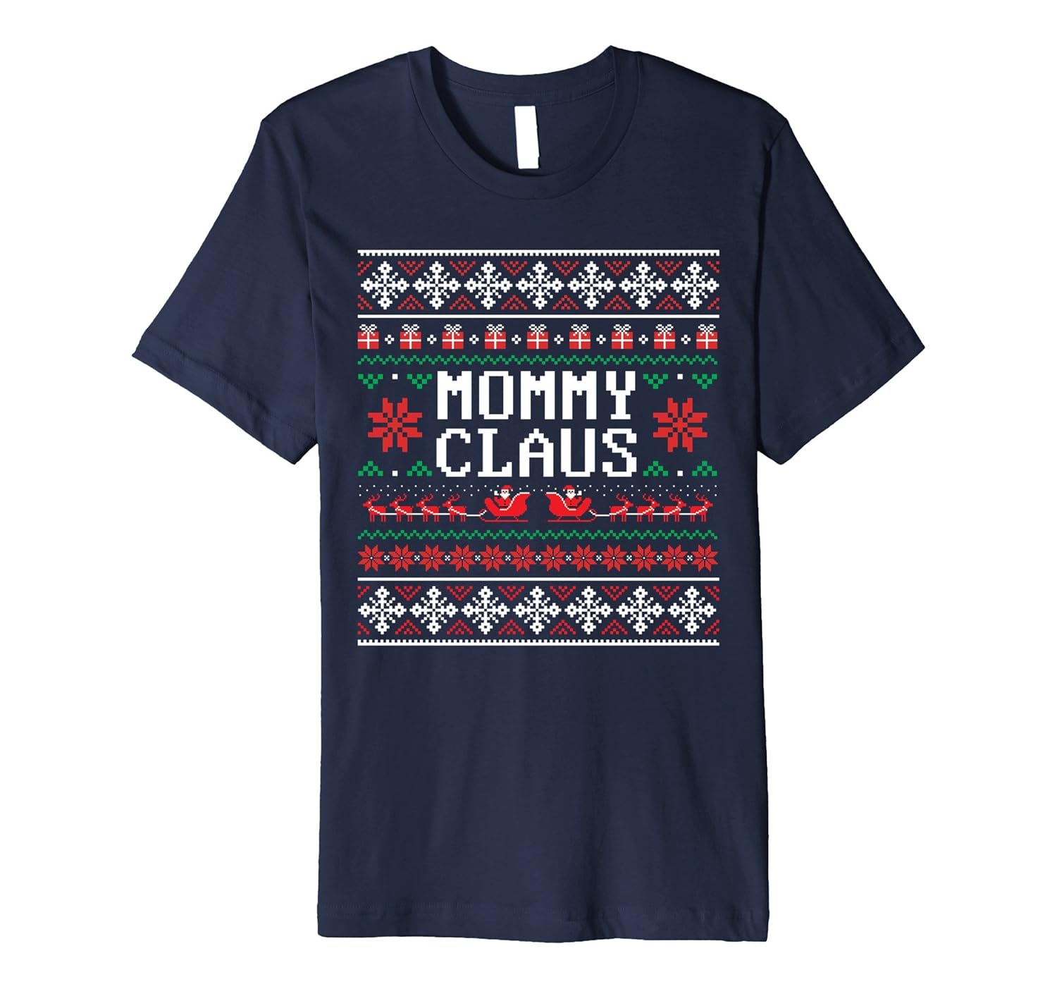 Solid colors: 100% Cotton; Heather Grey: 90% Cotton, 10% Polyester; All Other Heathers: 58% Cotton, 42% Polyester; Imported; Machine wash cold with like colors, dry low heat; Get on a family celebration with this Mommy Claus Ugly Christmas Sweater Couple T-Shirt! Have this classic design on a feast during the yuletide season! Share it with your partner and have a good time and celebrate during the festive holidays!; Fit: Slim (consider ordering a larger size for a looser fit); This tee is a perfect gift idea for a mama, mother, wife or a sister! Great addition for a birthday, Thanksgiving, Christmas, or any other gift giving occasion! This witty sweater design tshirt comes in Mens, Womens, and youth kids sizes.; This premium t-shirt is made of lightweight fine jersey fabric