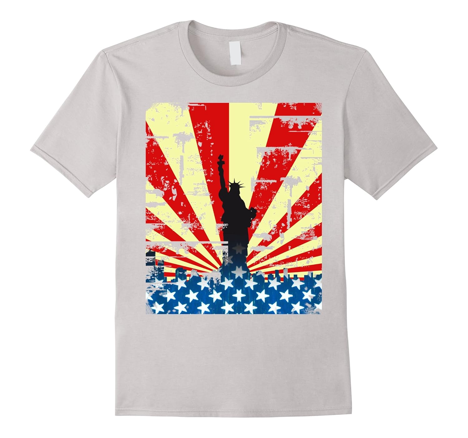 Solid colors: 100% Cotton; Heather Grey: 90% Cotton, 10% Polyester; All Other Heathers: 65% Cotton, 35% Polyester, Imported, Machine wash cold with like colors, dry low heat, On Veterans Day we respect those service men and women who showed bravery in battle in the Iraq Afghanistan, Vietnam, Korean war Gulf or world wars. Wear this tee to celebrate our brave armed forces and those who have served in them. This shirt has an image of the statue of liberty in silhouette, laid over the american flag designed to look like wartime spotlights shining at the sky. Wear one or gift one this veterans day. Lightweight, Classic fit, Double-needle sleeve and bottom hem