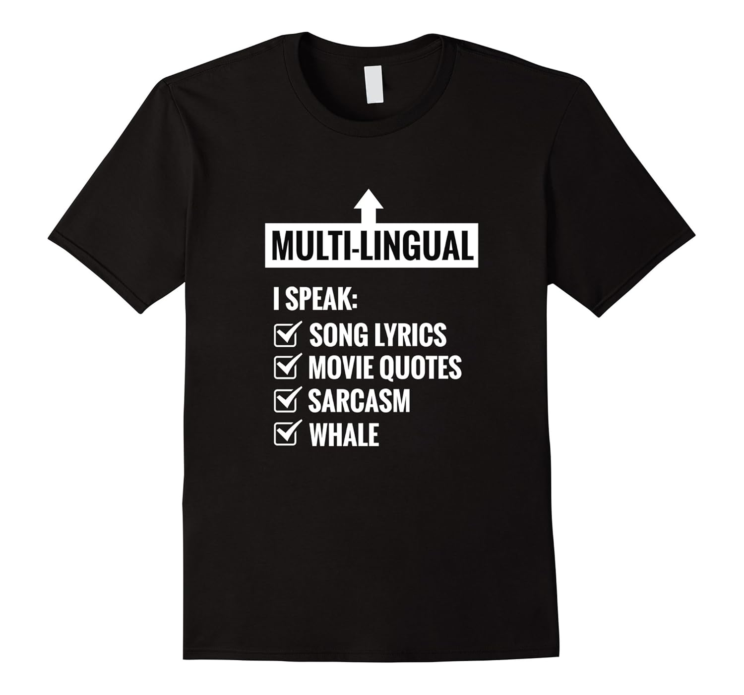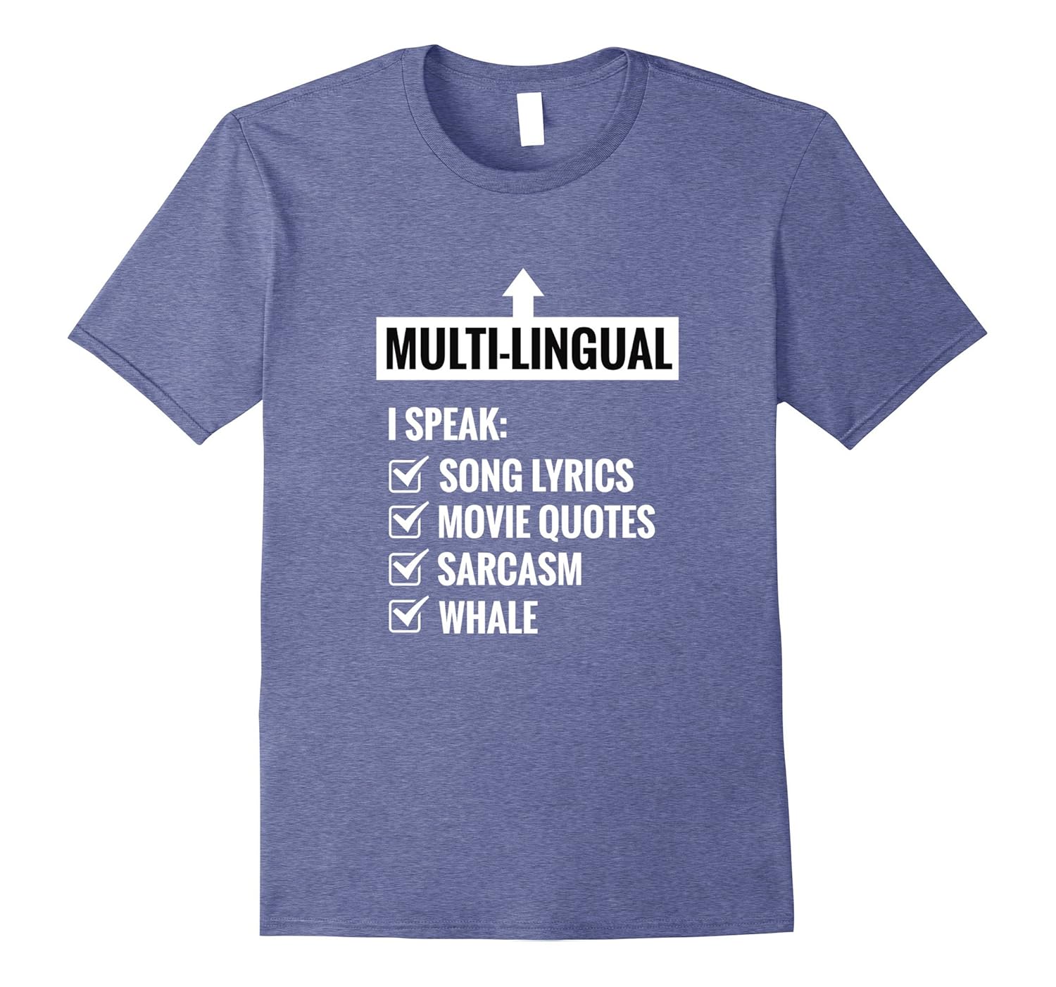 Solid colors: 100% Cotton; Heather Grey: 90% Cotton, 10% Polyester; All Other Heathers: 65% Cotton, 35% Polyester, Imported, Machine wash cold with like colors, dry low heat, This t-shirt features the words “Multilingual I speak song lyrics movie quotes sarcasm whale” on the front with check boxes. Lightweight, Classic fit, Double-needle sleeve and bottom hem