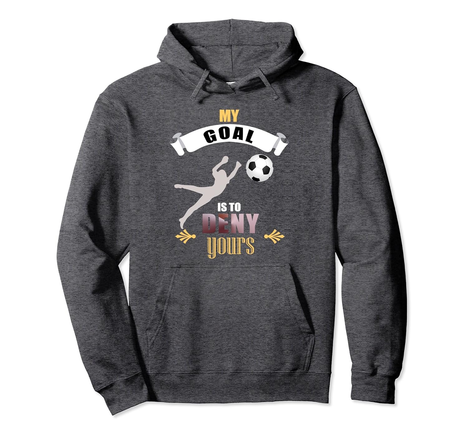 Solid colors: 80% Cotton, 20% Polyester; Heather Grey: 78% Cotton, 22% Poly; Dark Heather: 50% Cotton, 50% Polyester; Imported; Machine wash cold with like colors, dry low heat; My Goal Is To Deny Yours Soccer Goalie Hoodie: This awesome soccer goalie hoodie is perfect for any young or old soccer player who loves diving and stopping shots!; Great Gift for Soccer Goalies: This cute soccer hoodie is a perfect gift idea for the loved one in your life who plays goalkeeper on the soccer team!; 8.5 oz, Classic fit, Twill-taped neck