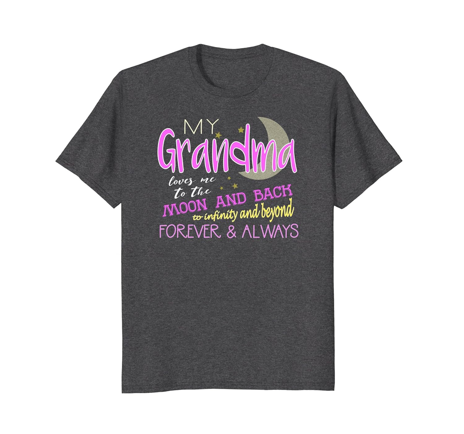 Solid colors: 100% Cotton; Heather Grey: 90% Cotton, 10% Polyester; All Other Heathers: 50% Cotton, 50% Polyester; Imported; Machine wash cold with like colors, dry low heat; My grandma loves me to the moon and back, to infinity and beyond, forever and always. Grandparent themed t-shirt is perfect for your grandchild, granddaughter or grandson.; People who love grandchildren (grandbabies, grandkids, etc.) will enjoy this tee shirt. These are super fun shirts with cool sayings, funny graphics, and grandmother themes.; Lightweight, Classic fit, Double-needle sleeve and bottom hem