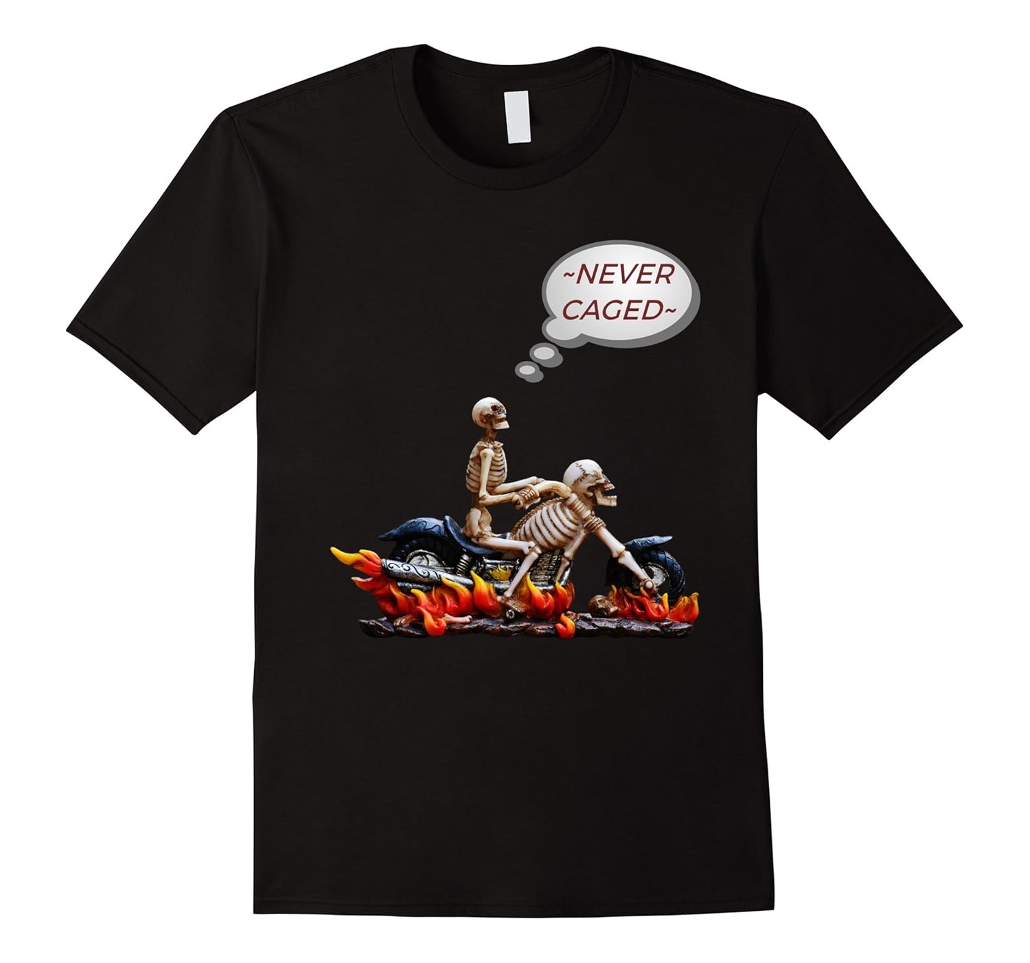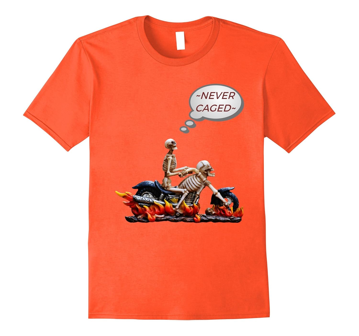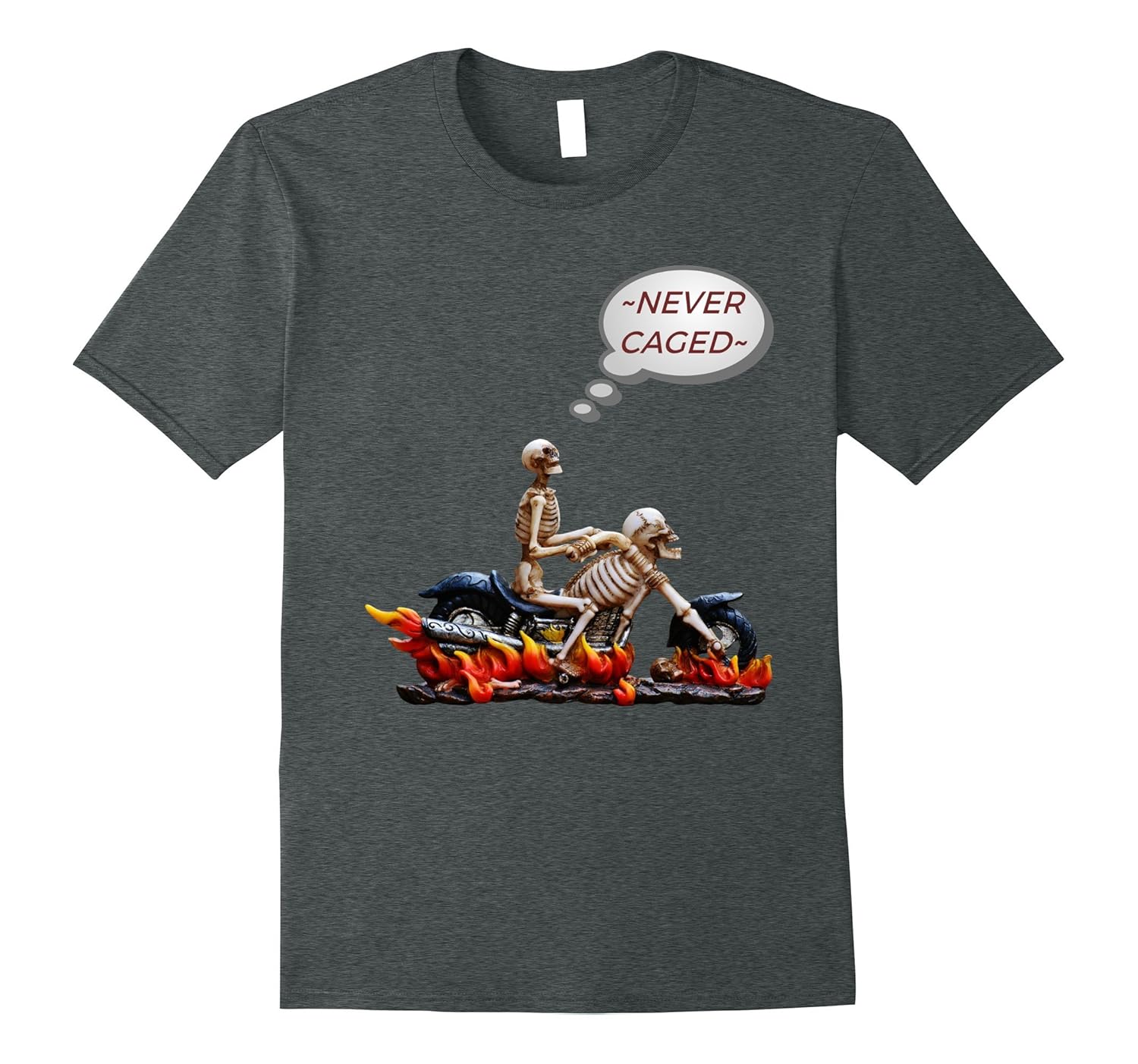 Solid colors: 100% Cotton; Heather Grey: 90% Cotton, 10% Polyester; All Other Heathers: 65% Cotton, 35% Polyester, Imported, Machine wash cold with like colors, dry low heat, Are you someone who”s never been caged. You know, stuck in a car or truck with a cage around you. If you”re a free spirit and will always be cage free, this is the T shirt for you!, Maybe you know a lucky person who”s never been caged, what a perfect gift this biker shirt would make!, Lightweight, Classic fit, Double-needle sleeve and bottom hem