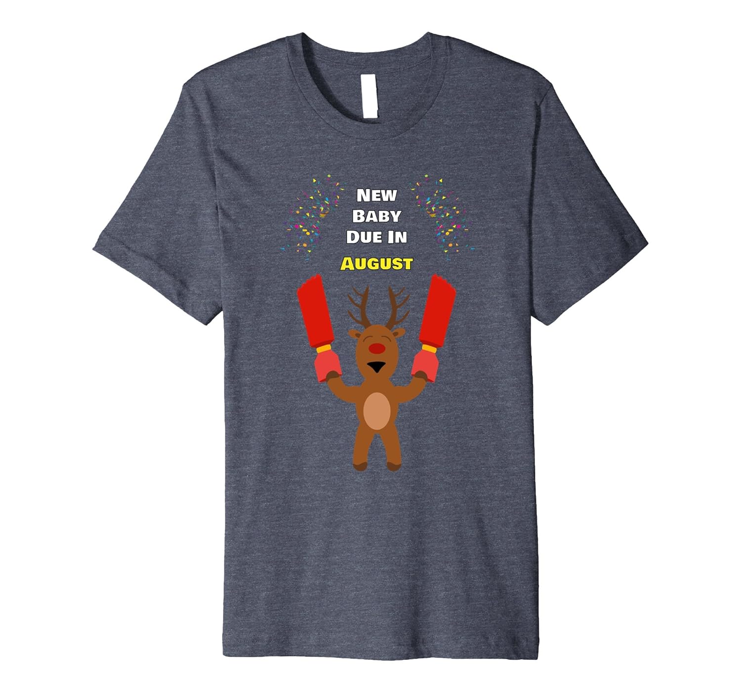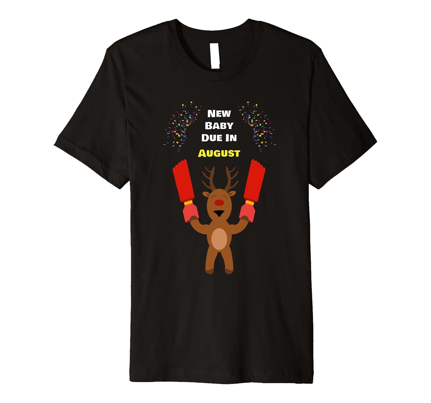 Solid colors: 100% Cotton; Heather Grey: 90% Cotton, 10% Polyester; All Other Heathers: 58% Cotton, 42% Polyester; Imported; Machine wash cold with like colors, dry low heat; New Baby Due In August 2018 TShirt is the best way to celebrate a baby due in the New Year.; Fit: Slim (consider ordering a larger size for a looser fit); Wear this tee at a baby shower and throughout the holidays with this xmas themed Happy Reindeer and Christmas Cracker with confetti.; This premium t-shirt is made of lightweight fine jersey fabric