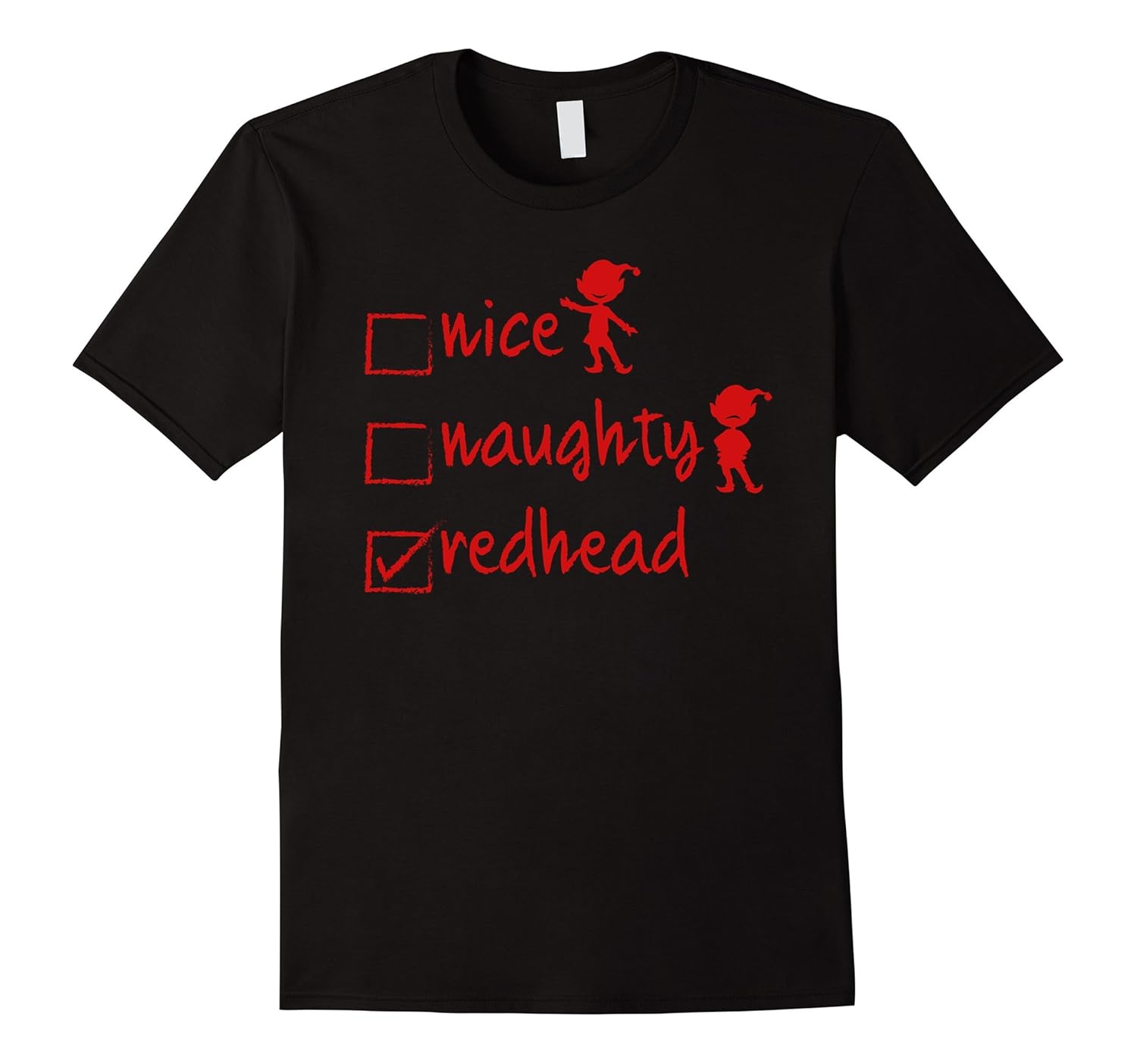 Solid colors: 100% Cotton; Heather Grey: 90% Cotton, 10% Polyester; All Other Heathers: 65% Cotton, 35% Polyester; Imported; Machine wash cold with like colors, dry low heat; Dont worry about being on Santas Naughty or Nice List this Christmas holidays, if you have red hair, auburn hair or even a red wig then youll love this fun Christmas shirt. If you love Christmas jokes, youll love this tee! For loose fit, order size up.; This funny Christmas shirt is an excellent Christmas gift idea for kids Andamp; adults like a redhead girl, red headed woman with red hair or ginger hair, beautiful redheads, hot redheads, natural redhead women, your redhead wife, redhead daughter or redhead mom; Lightweight, Classic fit, Double-needle sleeve and bottom hem