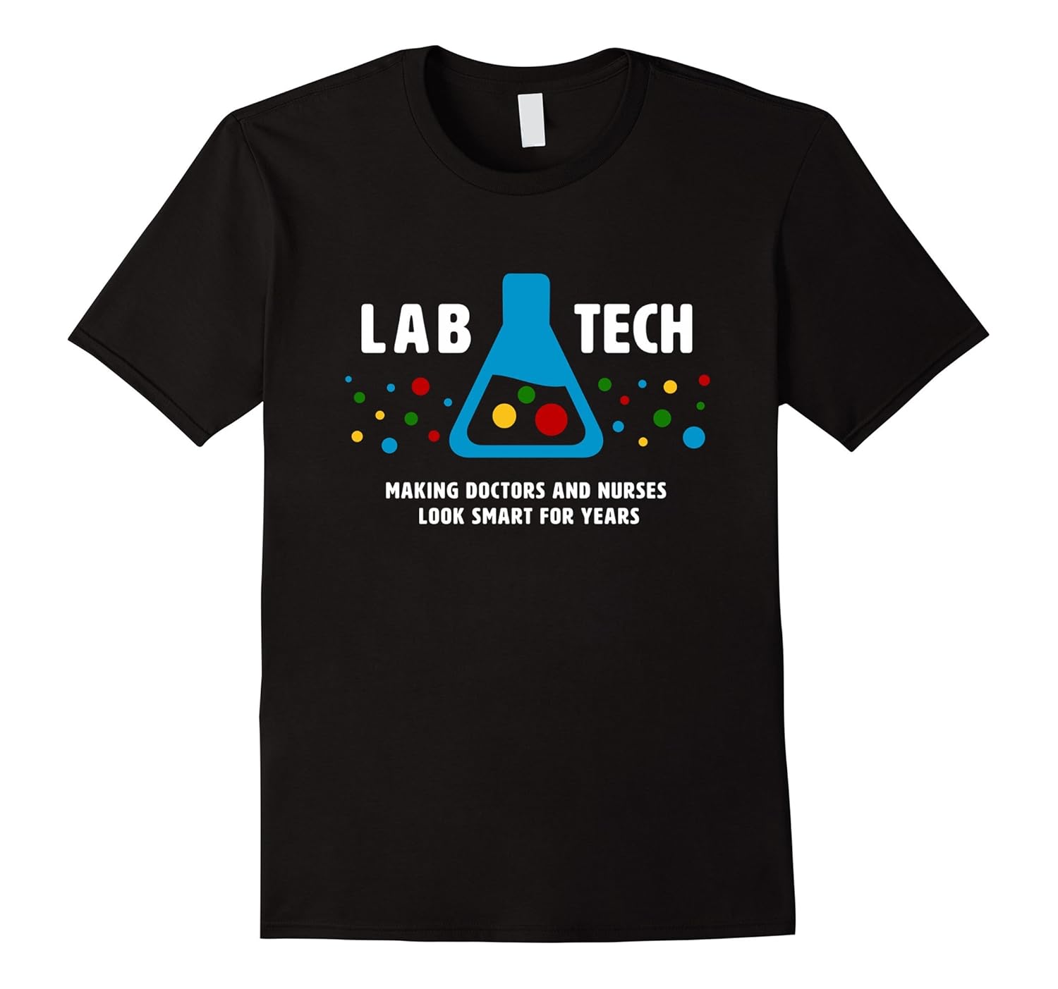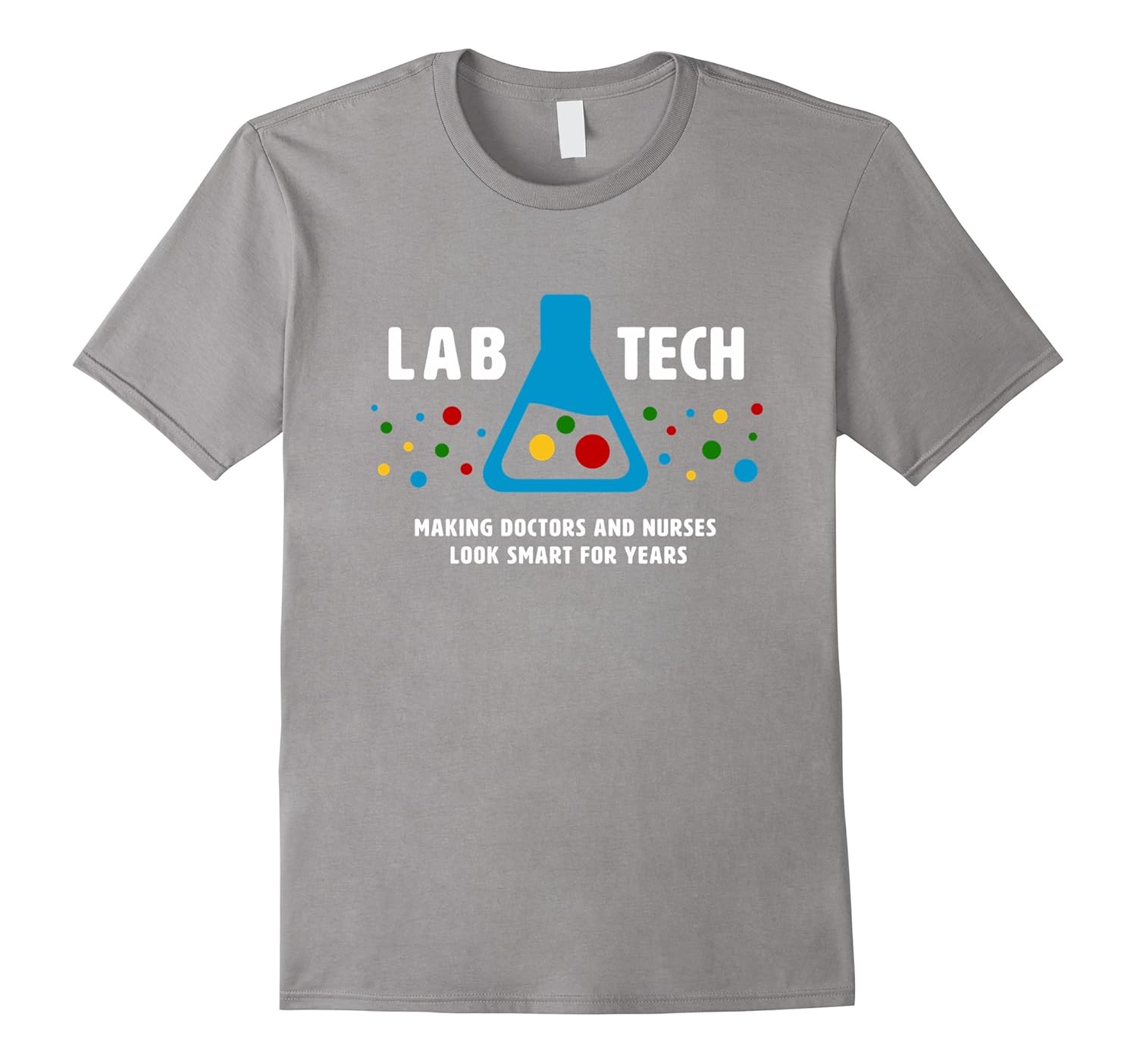 Solid colors: 100% Cotton; Heather Grey: 90% Cotton, 10% Polyester; All Other Heathers: 65% Cotton, 35% Polyester, Imported, Machine wash cold with like colors, dry low heat, Tee shirt text reads, “Lab Tech: Making Doctors and Nurses Look Smart For Years.” Includes colorful beaker image (but no test tubes). This is the perfect laboratory humor shirt to wear with scrubs and gloves for hospital lab week!, Know a laboratory technician or medical technologist who NEEDS this t-shirt. This tee is a perfect Christmas gift for all nerdy lab rats, clinical or medical laboratory scientists, and medical science students, professors, or instructors. Lightweight, Classic fit, Double-needle sleeve and bottom hem