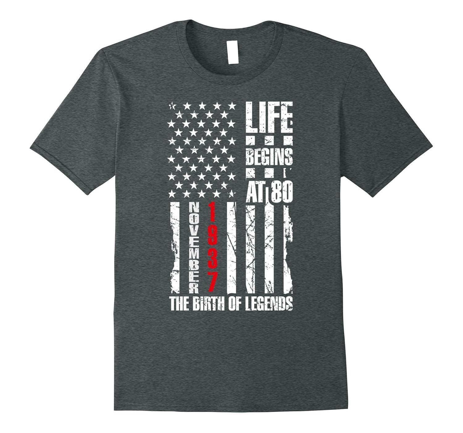 Solid colors: 100% Cotton; Heather Grey: 90% Cotton, 10% Polyester; All Other Heathers: 65% Cotton, 35% Polyester, Imported, Machine wash cold with like colors, dry low heat, Great gift for your 80-year-old mother and father or grandmother and grandfather born in November as a eightieth birthday or Christmas patriotic gift says Life Begins At 80 November 1937 The Birth of Legends seniors awesome T-Shirt. Patriotic 80 years old man or a woman birthday t-shirt gift for an adult men and women who like American Flag made in November 1937 year. The best birthday gift for adults for him and her turning 80 years old Funny eighty year old becoming a Legend. Lightweight, Classic fit, Double-needle sleeve and bottom hem