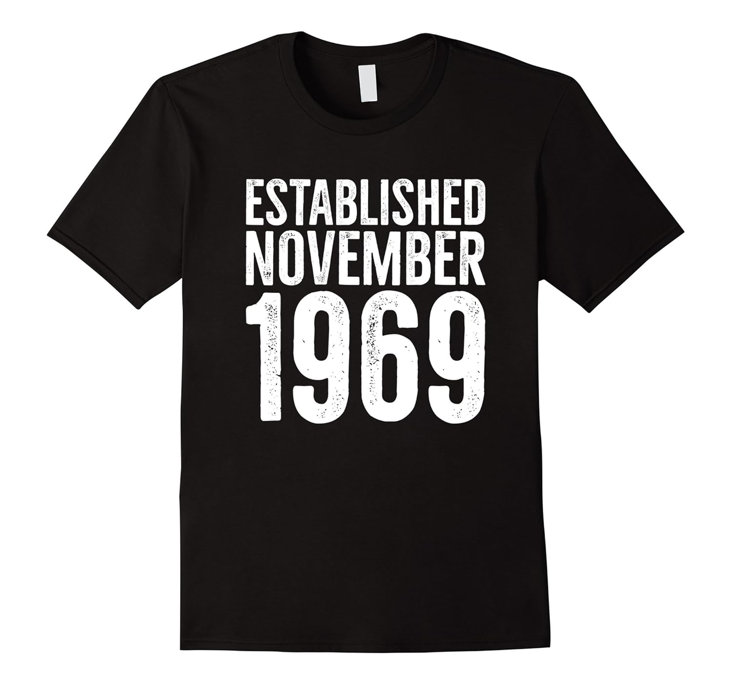 Solid colors: 100% Cotton; Heather Grey: 90% Cotton, 10% Polyester; All Other Heathers: 65% Cotton, 35% Polyester, Imported, Machine wash cold with like colors, dry low heat, Birthday party shirt gift for a boy, girl, man, woman, King, or Queen that was born and established in the month of November and in the year 1969. Retro vintage style distressed design. Established November 1969 shirt. Lightweight, Classic fit, Double-needle sleeve and bottom hem