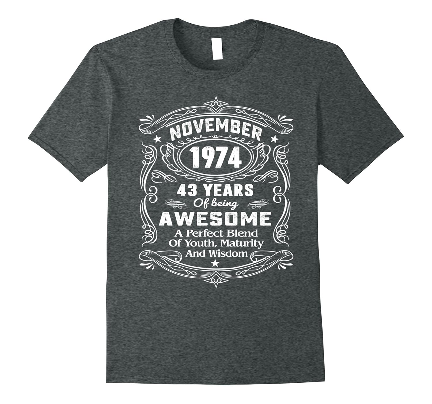 Solid colors: 100% Cotton; Heather Grey: 90% Cotton, 10% Polyester; All Other Heathers: 65% Cotton, 35% Polyester, Imported, Machine wash cold with like colors, dry low heat, Born In November 1974 43 years of being awesome a perfect blend of youth, maturity and wisdom T-Shirt, November 1974 t shirt, November t shirt, born in November 1974 shirt. . November birthday shirt, 43th birthday, 43th birthday t shirts, 43th birthday shirt, 1974 43th birthday shirt, Great 43th birthday gift ideas, 43th birthday party ideas, 1974 shirt. . Lightweight, Classic fit, Double-needle sleeve and bottom hem