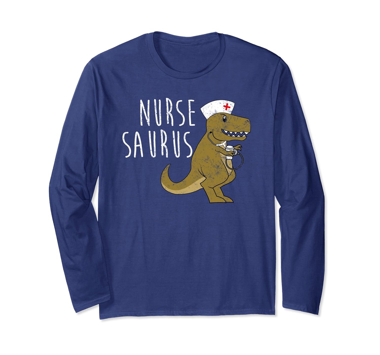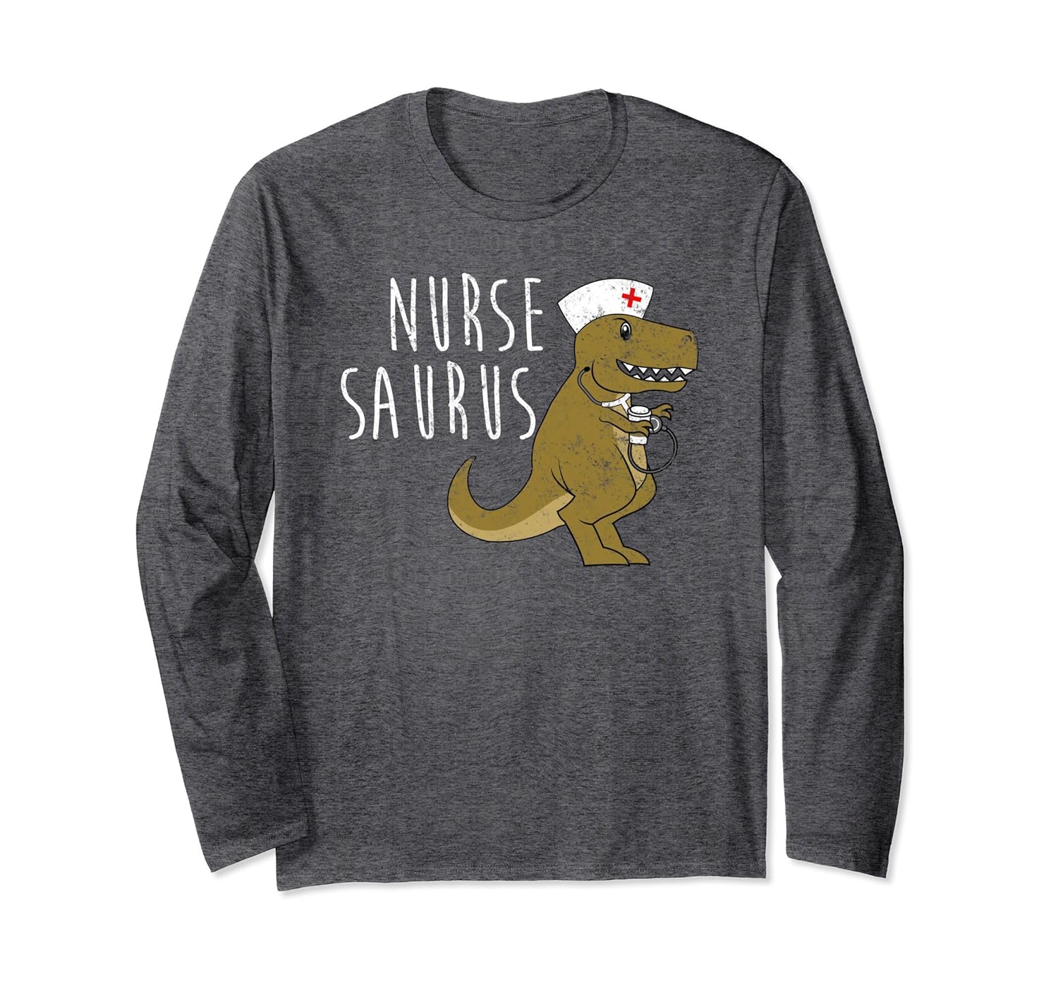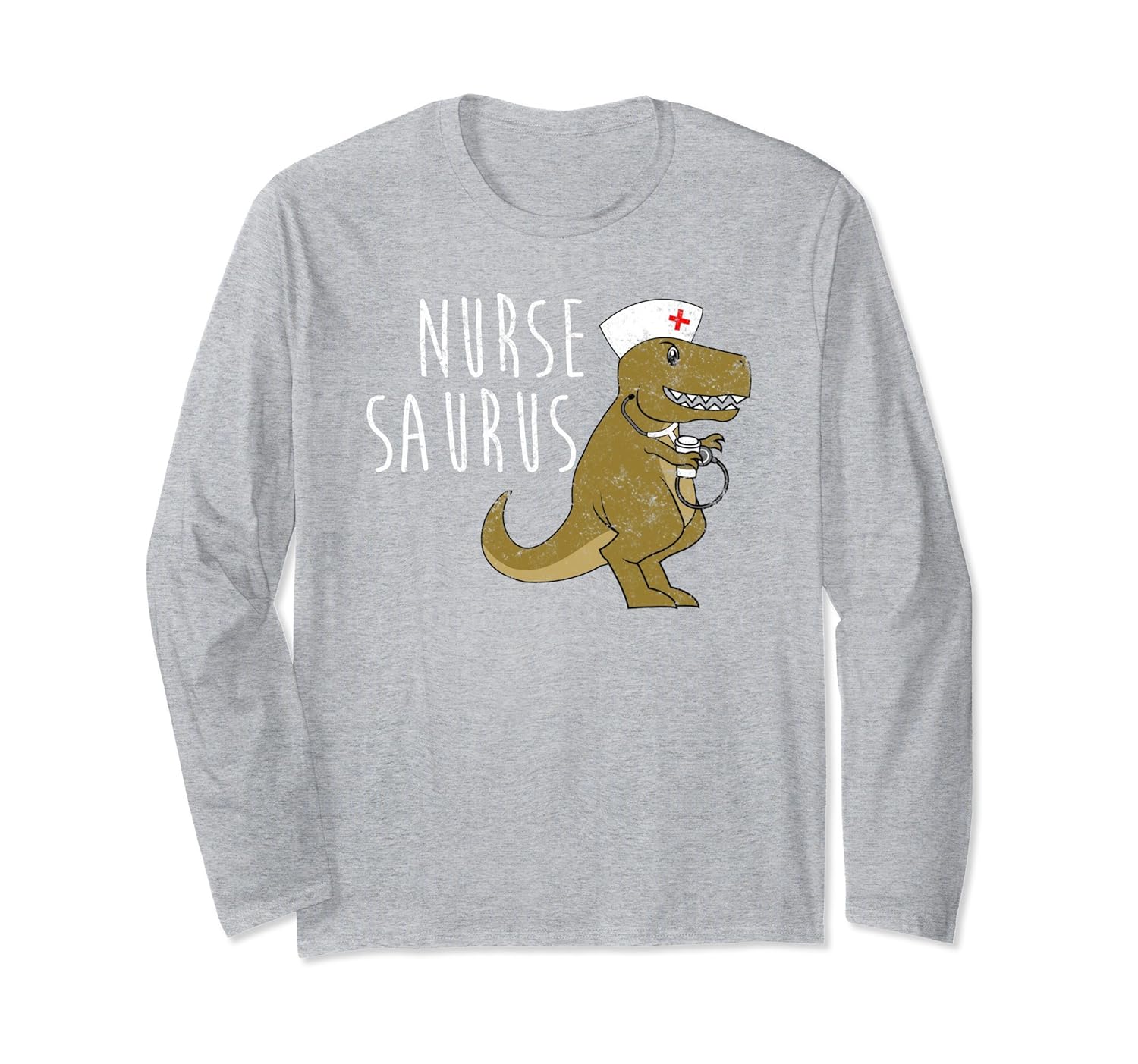 Solid colors: 100% Cotton; Heather Grey: 90% Cotton, 10% Polyester; All Other Heathers: 50% Cotton, 50% Polyester; Imported; Machine wash cold with like colors, dry low heat; Are you a nurse saurus? If so, then this distressed long sleeve t-shirt is for you! Get this cute medical long sleeves shirt as the perfect gift for any RN whod love this dinosaur!; Nurse Saurus RN Dinosaur Medical Distressed Long T-Shirt; Lightweight, Classic fit, Double-needle sleeve and bottom hem