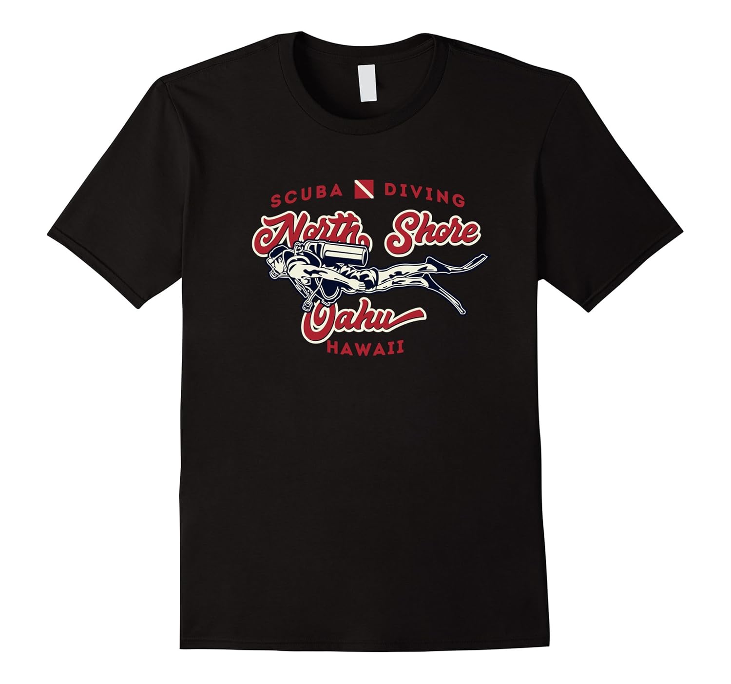 Solid colors: 100% Cotton; Heather Grey: 90% Cotton, 10% Polyester; All Other Heathers: 65% Cotton, 35% Polyester, Imported, Machine wash cold with like colors, dry low heat, The North Shore of Oahu, Hawaii is a fantastic scuba dive destination! Put on your wetsuit and travel to the water for snorkeling, diving, surfing or just hit the beach on your next vacation!, The ocean is calling! Dive or swim, this is a great shirt to change into before the beach party! Features a diver down flag, scuba diver with fins. A great gift for men, women, and; kids!, Lightweight, Classic fit, Double-needle sleeve and bottom hem