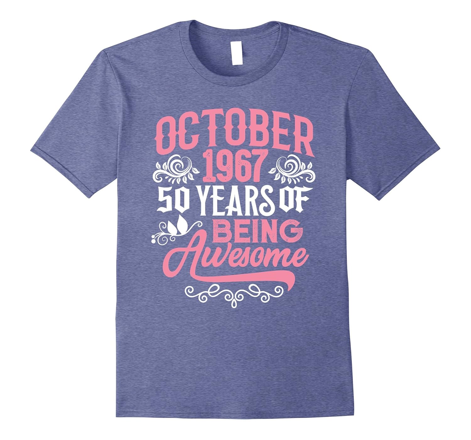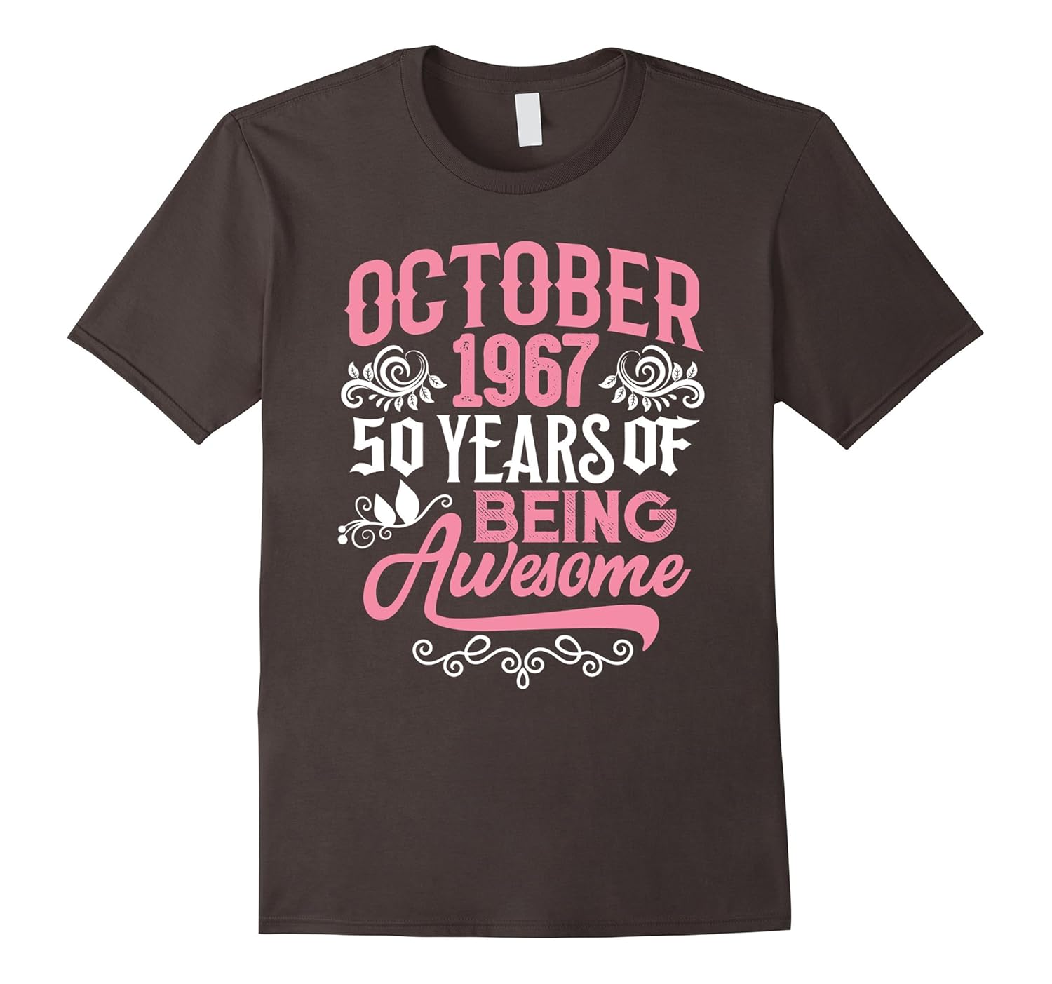 Solid colors: 100% Cotton; Heather Grey: 90% Cotton, 10% Polyester; All Other Heathers: 65% Cotton, 35% Polyester, Imported, Machine wash cold with like colors, dry low heat, 50th Birthday Gift T-Shirt. October 1967, 50 Years Of Being Awesome Birthday Shirt for Men and Women. Makes a perfect gift for him or her. Birthday gift idea for people born in October, 1967 or anyone who is turning 50 years old, vintage style graphic tee. Perfect for a birthday party. Lightweight, Classic fit, Double-needle sleeve and bottom hem
