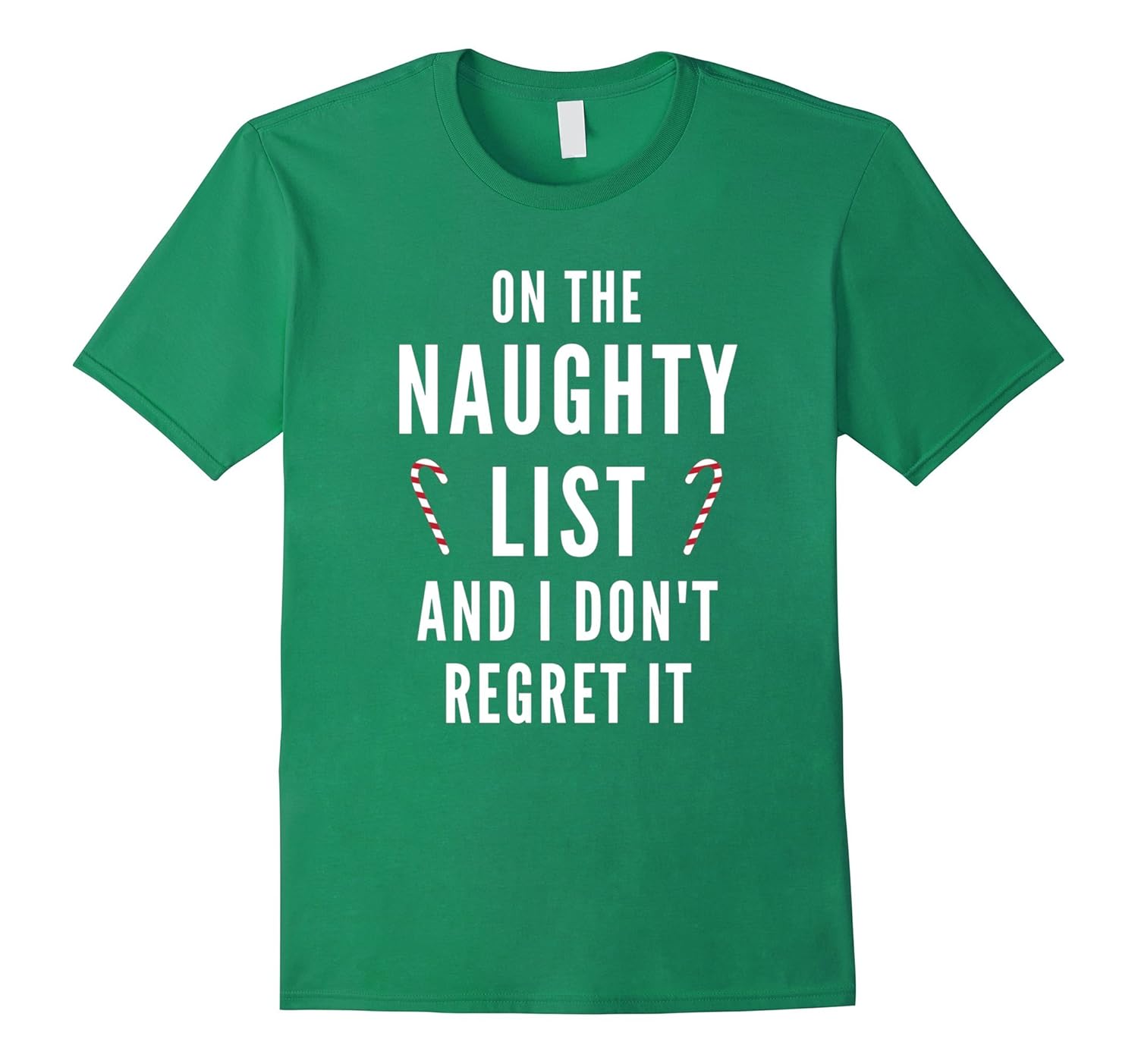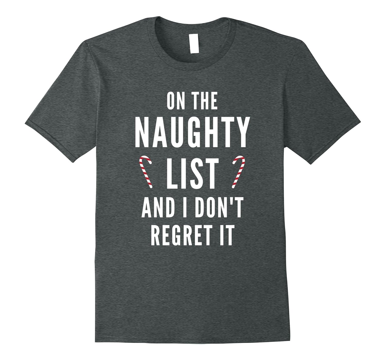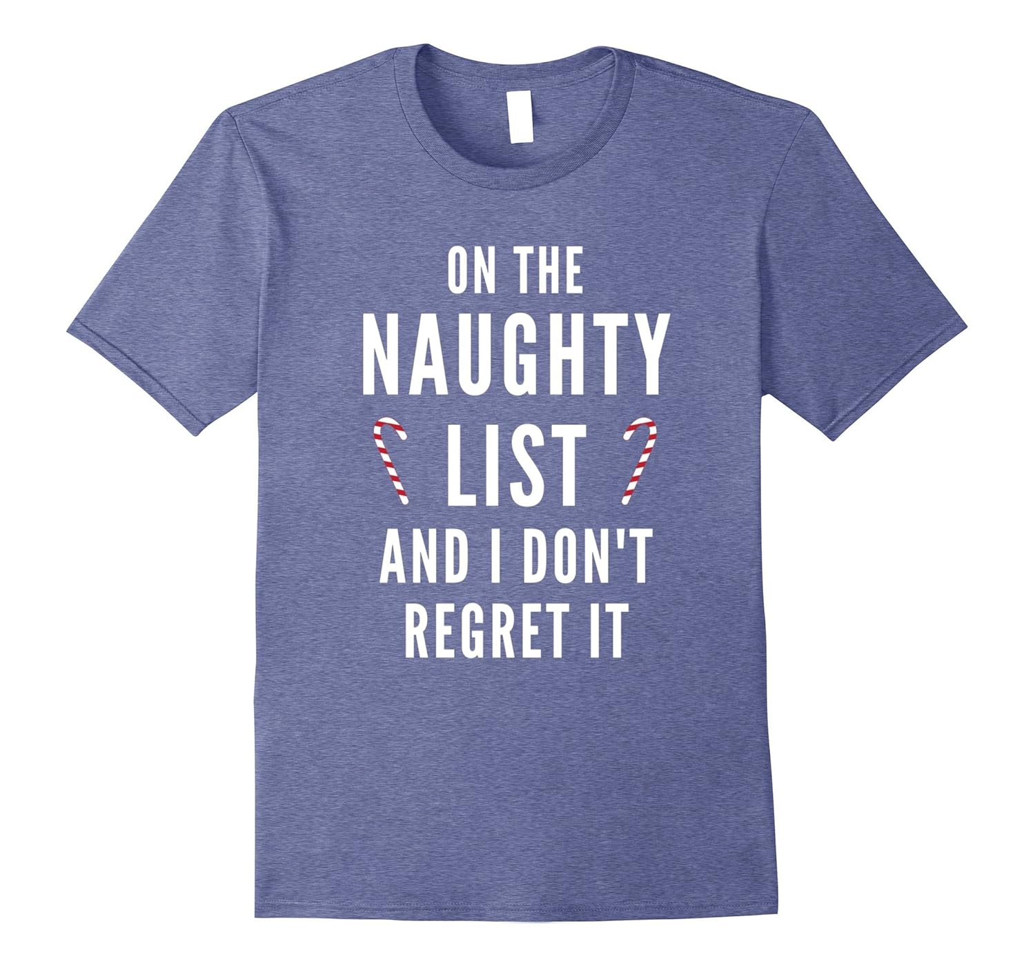 Solid colors: 100% Cotton; Heather Grey: 90% Cotton, 10% Polyester; All Other Heathers: 65% Cotton, 35% Polyester; Imported; Machine wash cold with like colors, dry low heat; On the naughty list and I dont regret it. This funny Santas list tshirt is great as a Christmas vacation tee shirt, Christmas pajamas, or to wear to an adult Christmas party. This tee is a great Christmas gift idea or a funny gift exchange.; This On The Naughty List Funny Christmas T-Shirt is designed and printed for a slim fit. For a looser fit, please order a size up. This tee is a great gift idea for men, women, kids, toddlers, teens, girls, and boys!; Lightweight, Classic fit, Double-needle sleeve and bottom hem