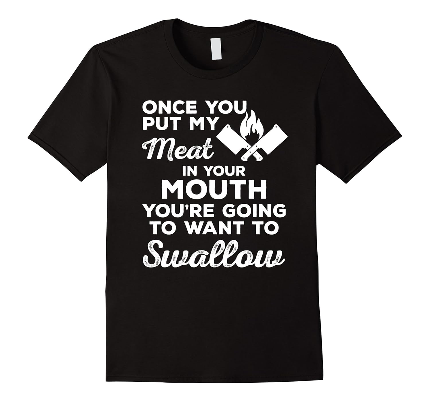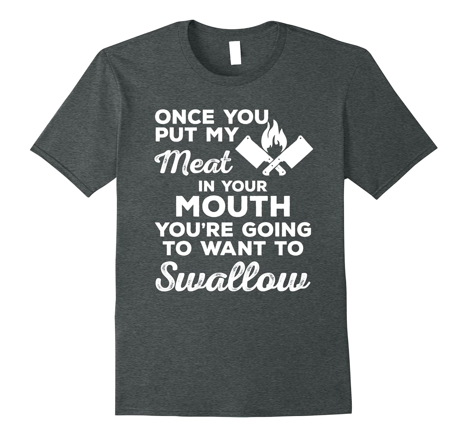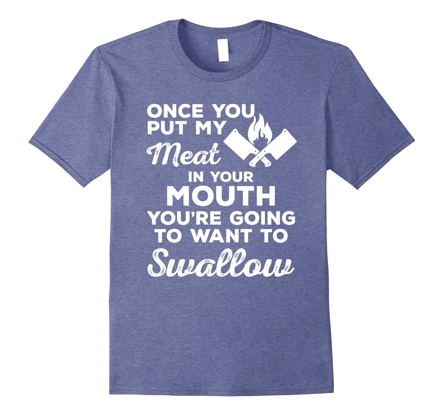 Solid colors: 100% Cotton; Heather Grey: 90% Cotton, 10% Polyester; All Other Heathers: 65% Cotton, 35% Polyester; Imported; Machine wash cold with like colors, dry low heat; Our funny Andamp; sarcastic BBQ tee makes a great gift for head chef waitress pastry chef food scientist technologist entrepreneur cookbook author or restaurant owner! Wear this with your sous chef hat commis cap coat apron or outfit.; Perfect for chefs or cooking related skilled workers like butchers coworkers top chefs passion for foods Andamp; culinary school graduate. Once you put my meat in your mouth youre going to want to swallow BBQ shirt is Fitted T Please Order a size up if unsure.; Lightweight, Classic fit, Double-needle sleeve and bottom hem