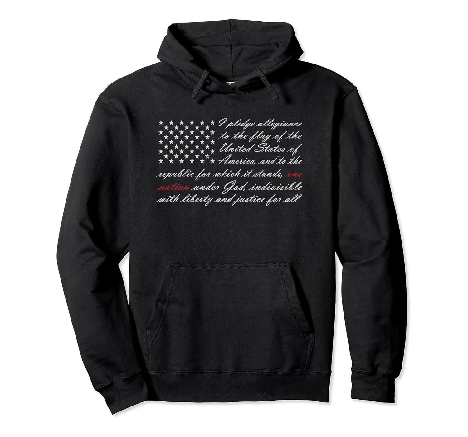 Solid colors: 80% Cotton, 20% Polyester; Heather Grey: 78% Cotton, 22% Poly; Dark Heather: 50% Cotton, 50% Polyester; Imported; Machine wash cold with like colors, dry low heat; For those that are proud of our country this is the perfect hoodie with the pledge of allegiance in the shape of the flag, with emphasis on One Nation. Stop the divisiveness and lets stay united.; During these times where it seems we are drifting apart we should stand as One Nation, indivisible! American flag with the words of the pledge within highlighting that we are one nation; 8.5 oz, Classic fit, Twill-taped neck