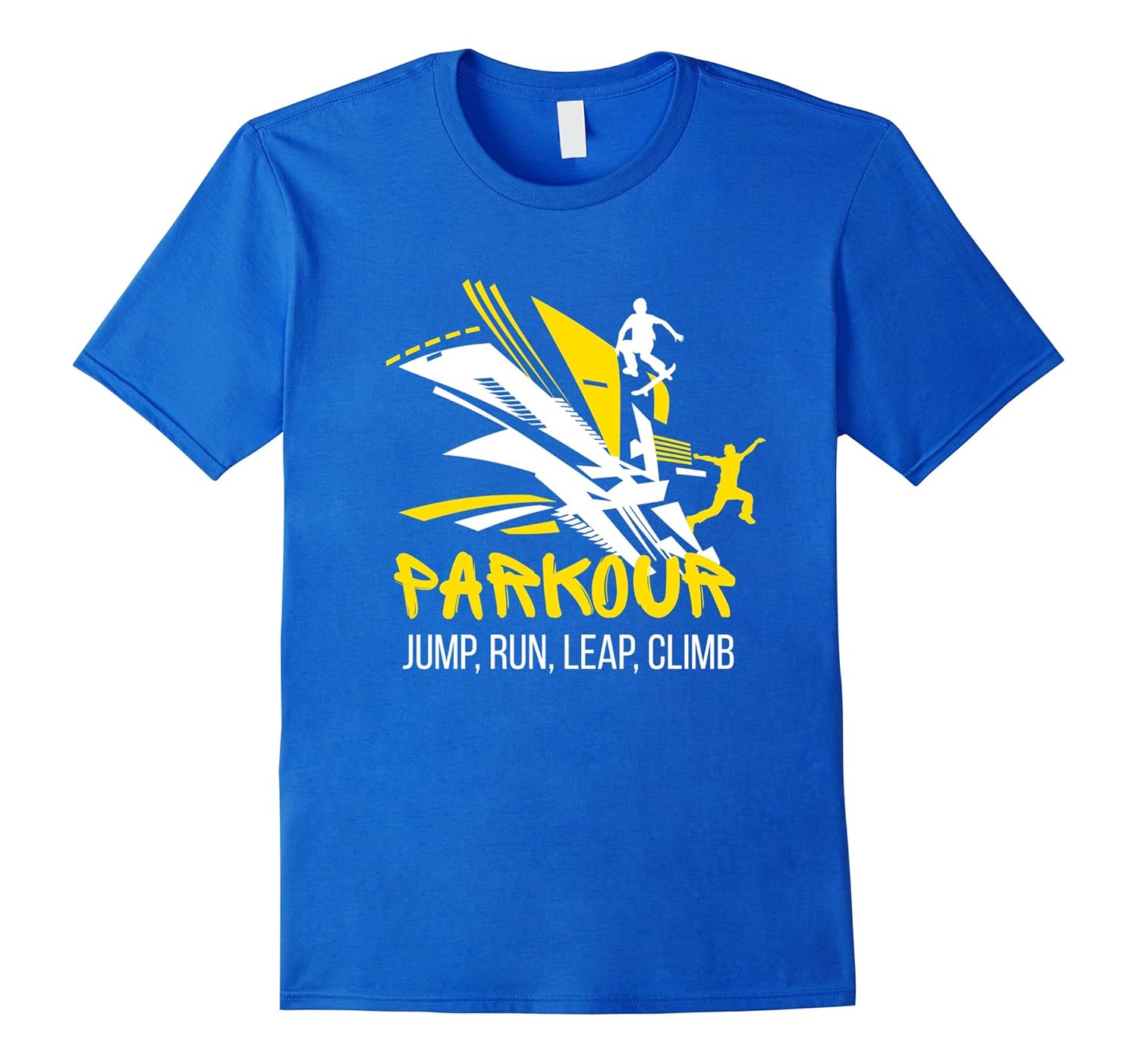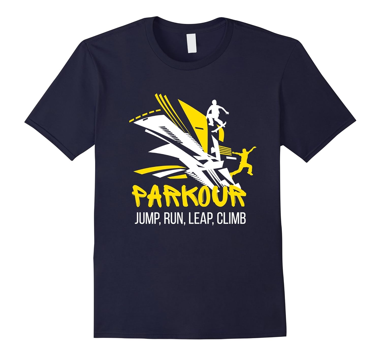 Solid colors: 100% Cotton; Heather Grey: 90% Cotton, 10% Polyester; All Other Heathers: 65% Cotton, 35% Polyester, Imported, Machine wash cold with like colors, dry low heat, Parkour T-shirt, Text on the shirt reads: Jump, run, leap, climb, Lightweight, Classic fit, Double-needle sleeve and bottom hem