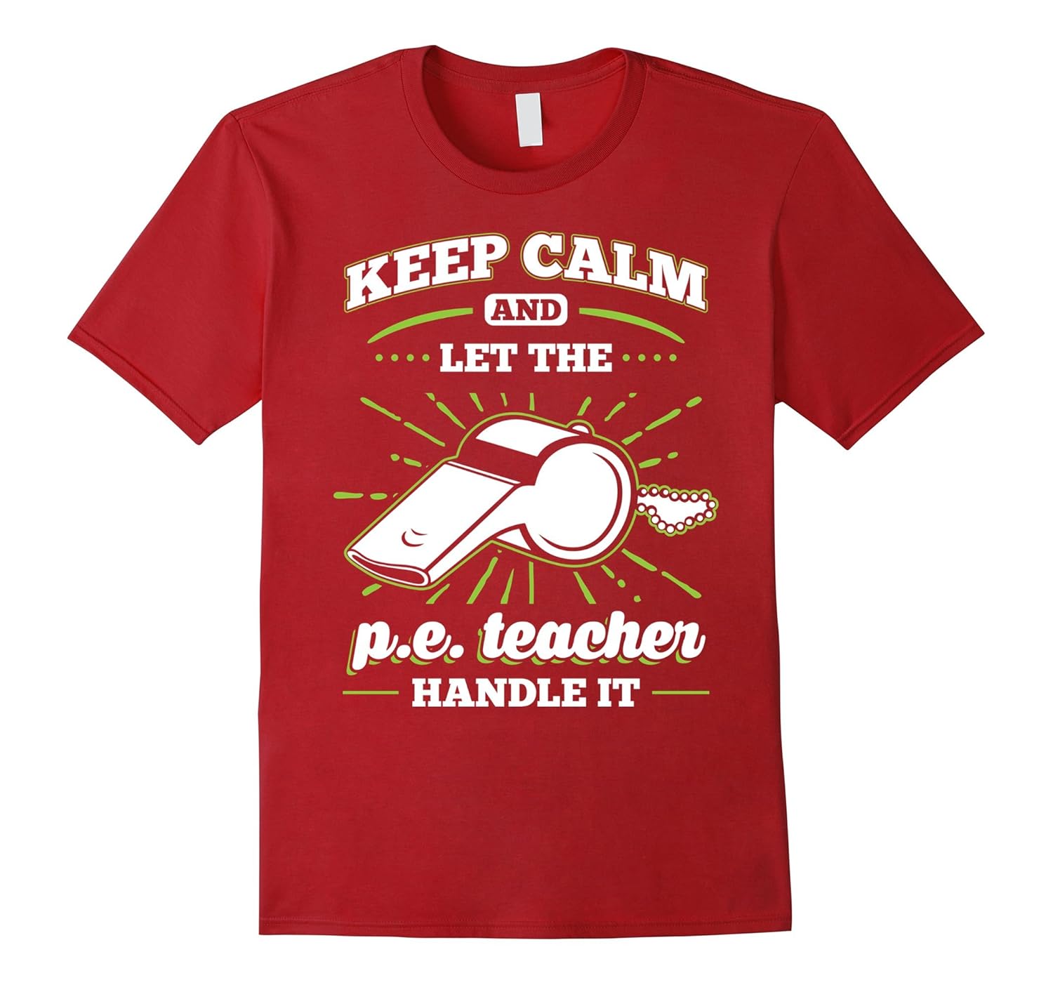 Solid colors: 100% Cotton; Heather Grey: 90% Cotton, 10% Polyester; All Other Heathers: 65% Cotton, 35% Polyester; Imported; Machine wash cold with like colors, dry low heat; Are You A P.E. Teacher Like We Are? Get This As A Birthday or Christmas Gift For A lovely P.E. Teacher , P.E. Teacher Mom, P.E. Teacher Volunteer Or Someone Who Just Loves Teaching Phys Ed!; KEEP CALM AND LET THE P.E. TEACHER HANDLE IT T-Shirt: P.E. Teacher Lovers T-Shirt For Men Or Woman Tee is Printed to Be Fitted. For a More Baggy Fit, Please Order Your Tee a Size Up; Lightweight, Classic fit, Double-needle sleeve and bottom hem