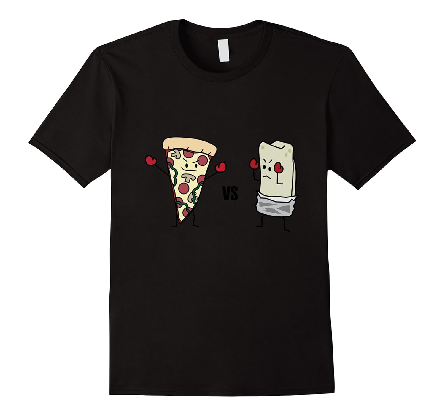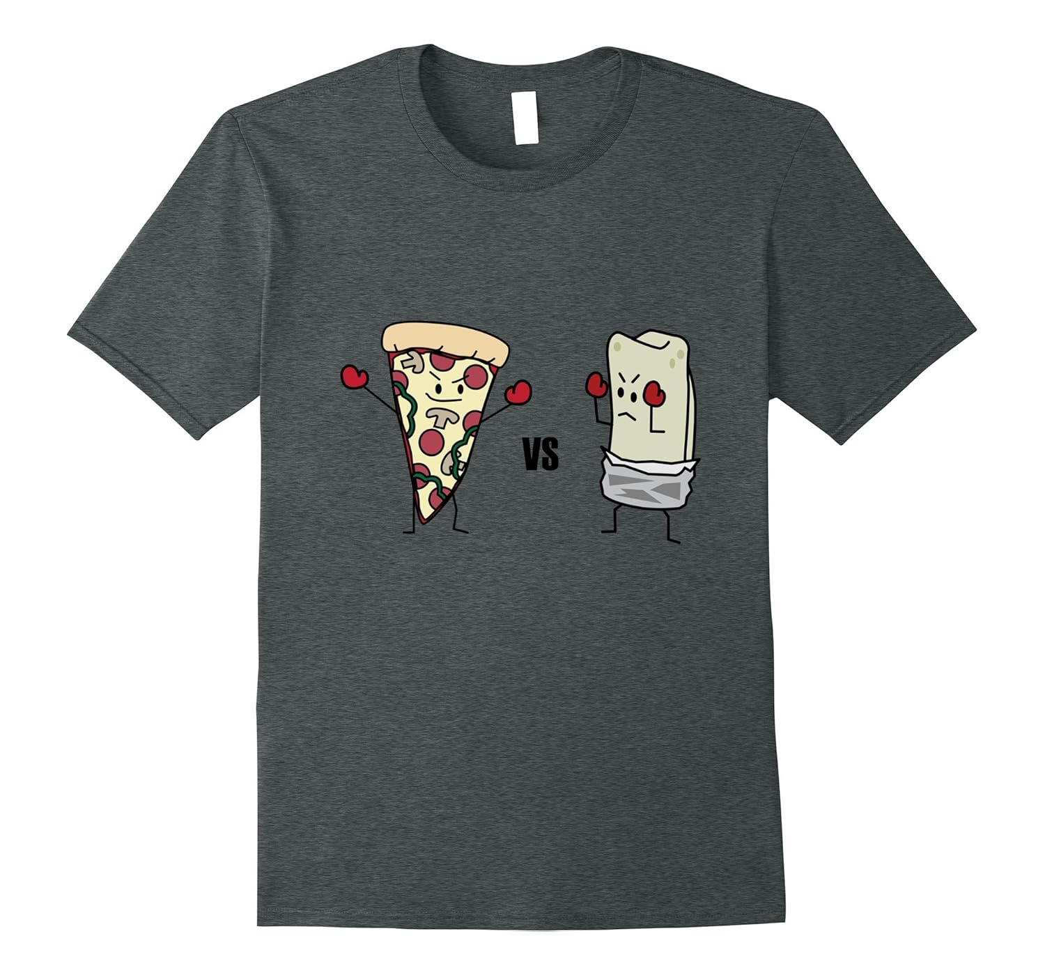 Solid colors: 100% Cotton; Heather Grey: 90% Cotton, 10% Polyester; All Other Heathers: 65% Cotton, 35% Polyester, Imported, Machine wash cold with like colors, dry low heat, burrito versus pizza, burrito vs pizza, pepperoni, pizza, burrito, fighter, versus, burritos, pepperoni pizza, slice, dark, black, Mexican, tortilla, flour tortilla, crust, delivered, cheese, Lightweight, Classic fit, Double-needle sleeve and bottom hem
