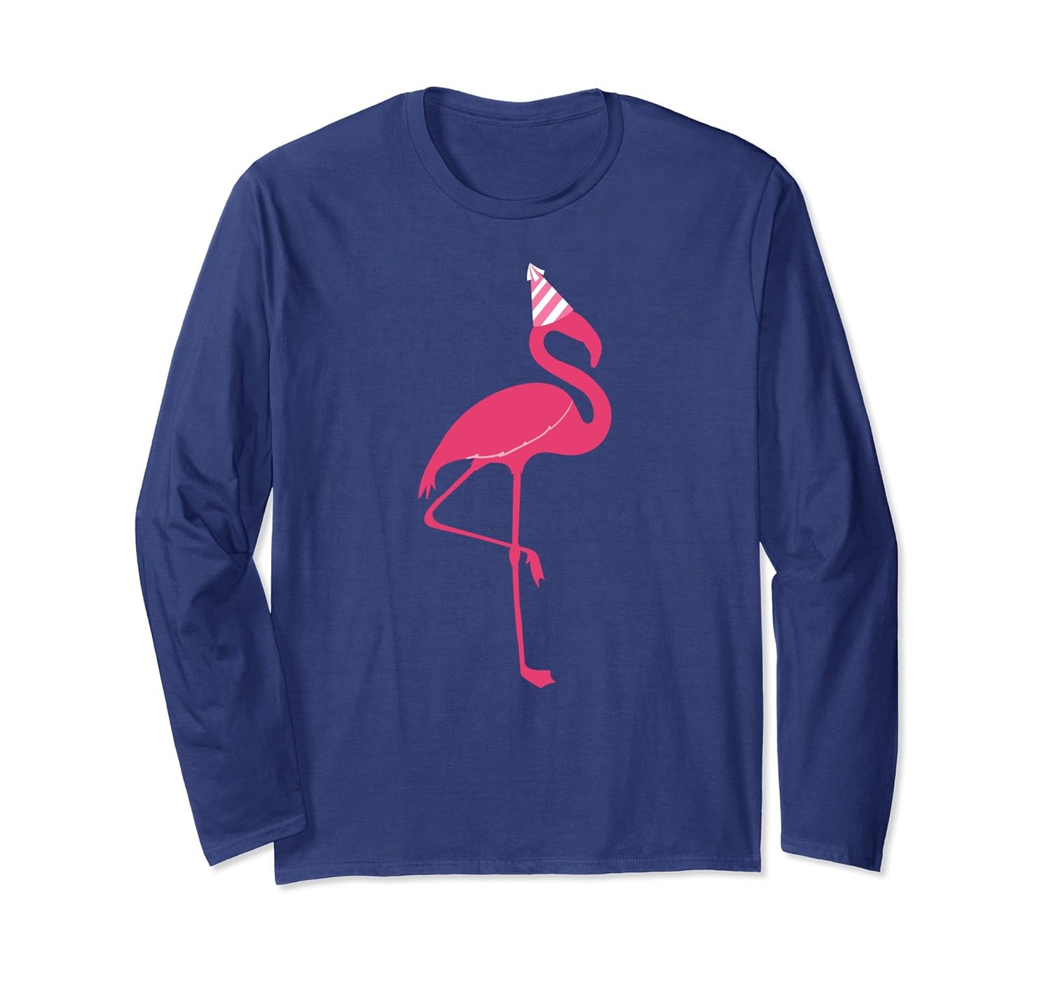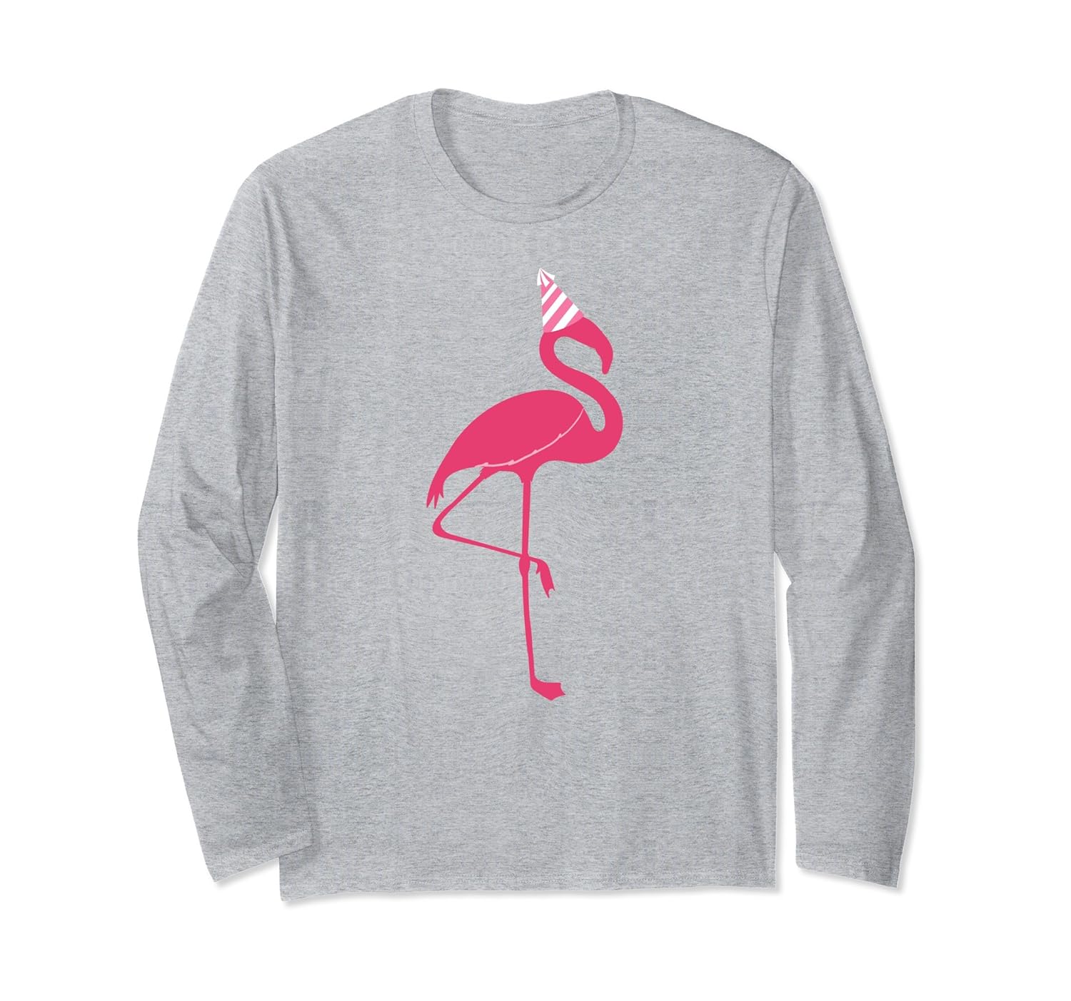 Solid colors: 100% Cotton; Heather Grey: 90% Cotton, 10% Polyester; All Other Heathers: 50% Cotton, 50% Polyester; Imported; Machine wash cold with like colors, dry low heat; Our Pink Flamingo at a Party Long Sleeve is the perfect long sleeved tshirt for flamingo fans. Its a great funny gift idea for a birthday, Mothers or Fathers Day.; Possibly the best pink flamingo wearing a party hat long sleeve t-shirt of all time. People who love beach, bbqs or summer parties will love this long sleeve tee shirt. Great present for family and friends.; Lightweight, Classic fit, Double-needle sleeve and bottom hem