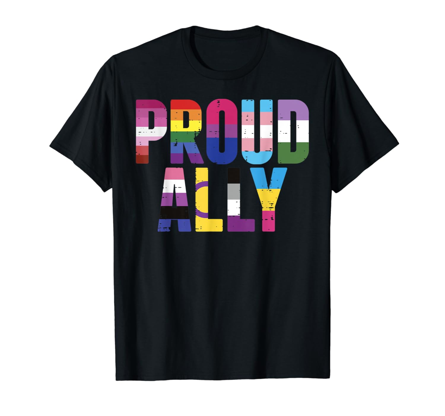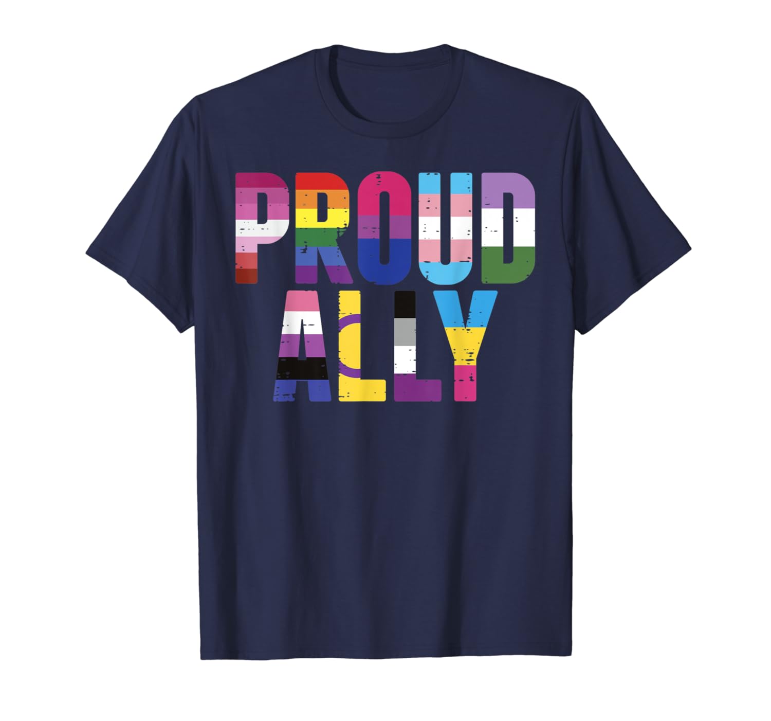 Solid colors: 100% Cotton; Heather Grey: 90% Cotton, 10% Polyester; All Other Heathers: 50% Cotton, 50% Polyester; Imported; Machine wash cold with like colors, dry low heat; Grab this retro Proud Ally LGBT T-Shirt for your genderqueer girlfriend, boyfriend, dad, mom, aunt, uncle, daughter, son, brother, sister, or bestfriend! Its the perfect gift for birthday, lgbt pride awareness month or christmas 2019; This retro vintage Proud Ally LGBT T-Shirt is a perfect gift idea Andamp; present for lesbian gay bisexual transgender nonbinary genderfluid intersex asexual and pansexual men, women who will proudly wear this lgbtq support flag colors apparel; Lightweight, Classic fit, Double-needle sleeve and bottom hem