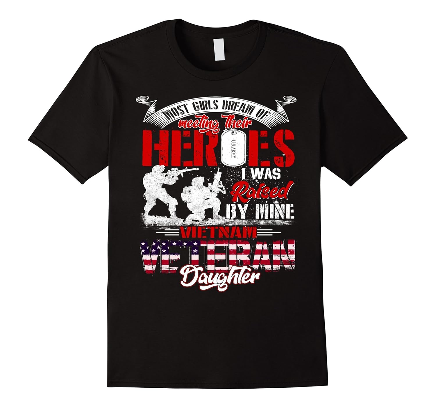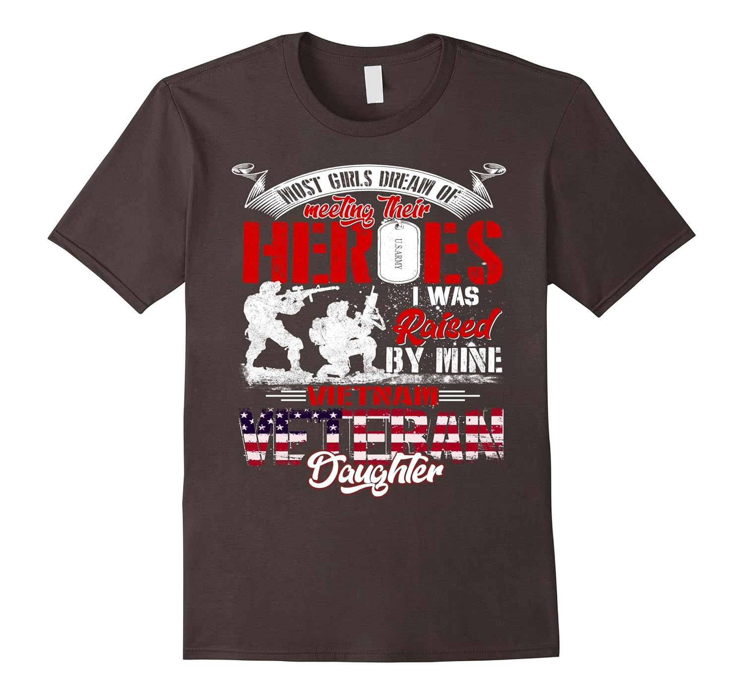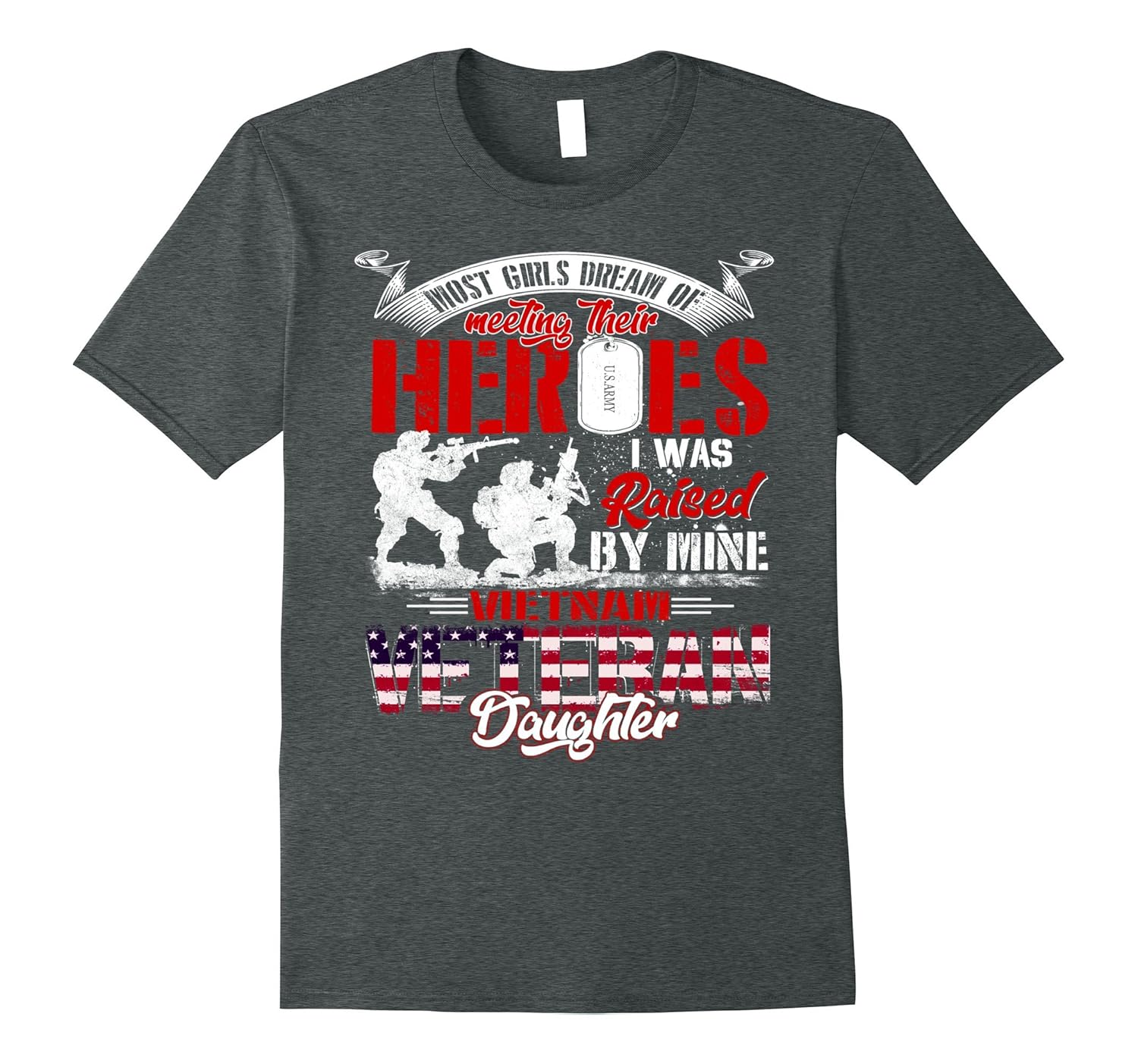 Solid colors: 100% Cotton; Heather Grey: 90% Cotton, 10% Polyester; All Other Heathers: 65% Cotton, 35% Polyester, Imported, Machine wash cold with like colors, dry low heat, You are a proud Vietnam veteran”s daughter and want a cool Veteran Day shirt to show to your pride, this Proud Vietnam Veteran Daughter I Was Raised By My Hero Tshirt is great for you. A great gift for daughter, niece or sister on birthday or Veteran Day. Proud Daughter Veteran Most Girls Dream Of Meeting Their Hero I Was Raised By Mine Vietnam Veteran Tshirt is a cool gift for any daughter whose dad is an Vietnam veteran on birthday, Veteran Day or Thanksgiving. Lightweight, Classic fit, Double-needle sleeve and bottom hem