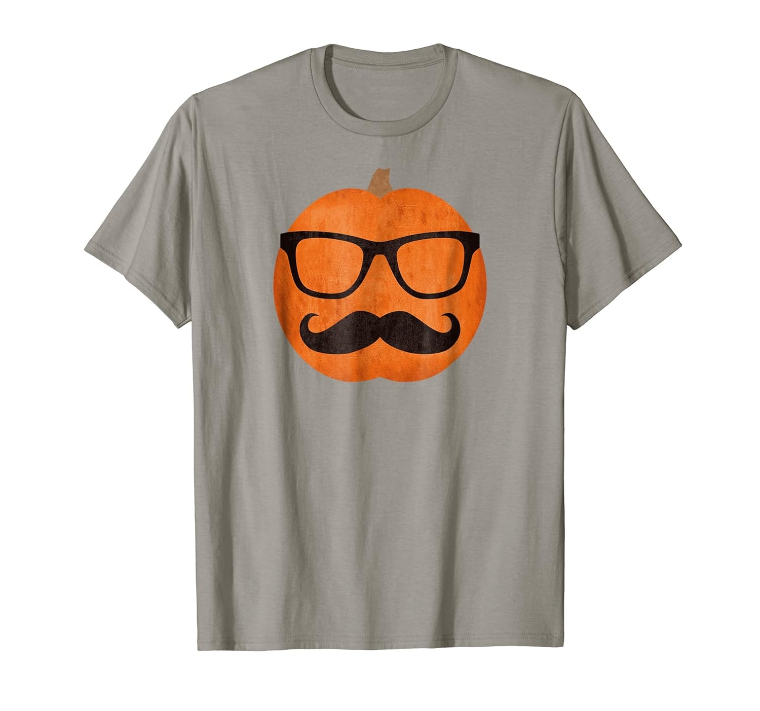 Solid colors: 100% Cotton; Heather Grey: 90% Cotton, 10% Polyester; All Other Heathers: 50% Cotton, 50% Polyester; Imported; Machine wash cold with like colors, dry low heat; Distressed design pumpkin wearing retro glasses and mustache cool Halloween tee shirt.; Lightweight, Classic fit, Double-needle sleeve and bottom hem