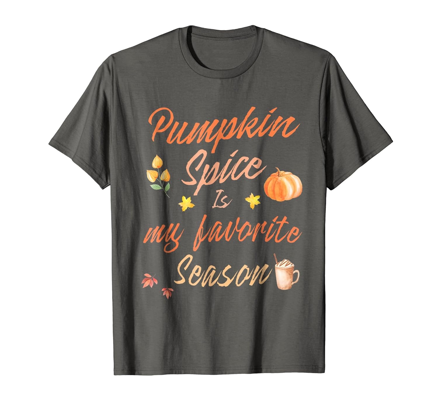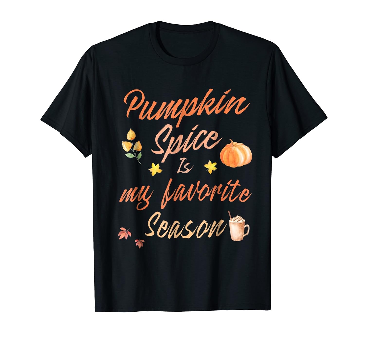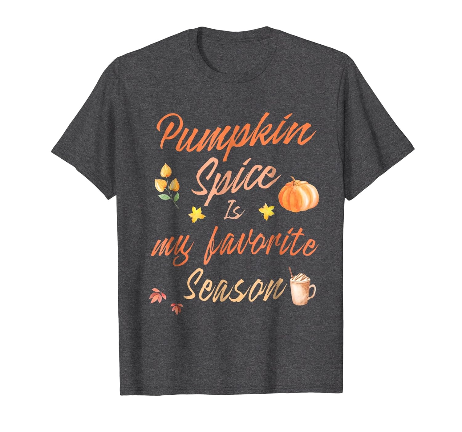 Solid colors: 100% Cotton; Heather Grey: 90% Cotton, 10% Polyester; All Other Heathers: 50% Cotton, 50% Polyester; Imported; Machine wash cold with like colors, dry low heat; Fun to wear for anyone who loves pumpkin spice with everything !; This cool pumpkin spice shirt makes a fun teeshirt to wear for the fall, halloween and holiday season.; Lightweight, Classic fit, Double-needle sleeve and bottom hem