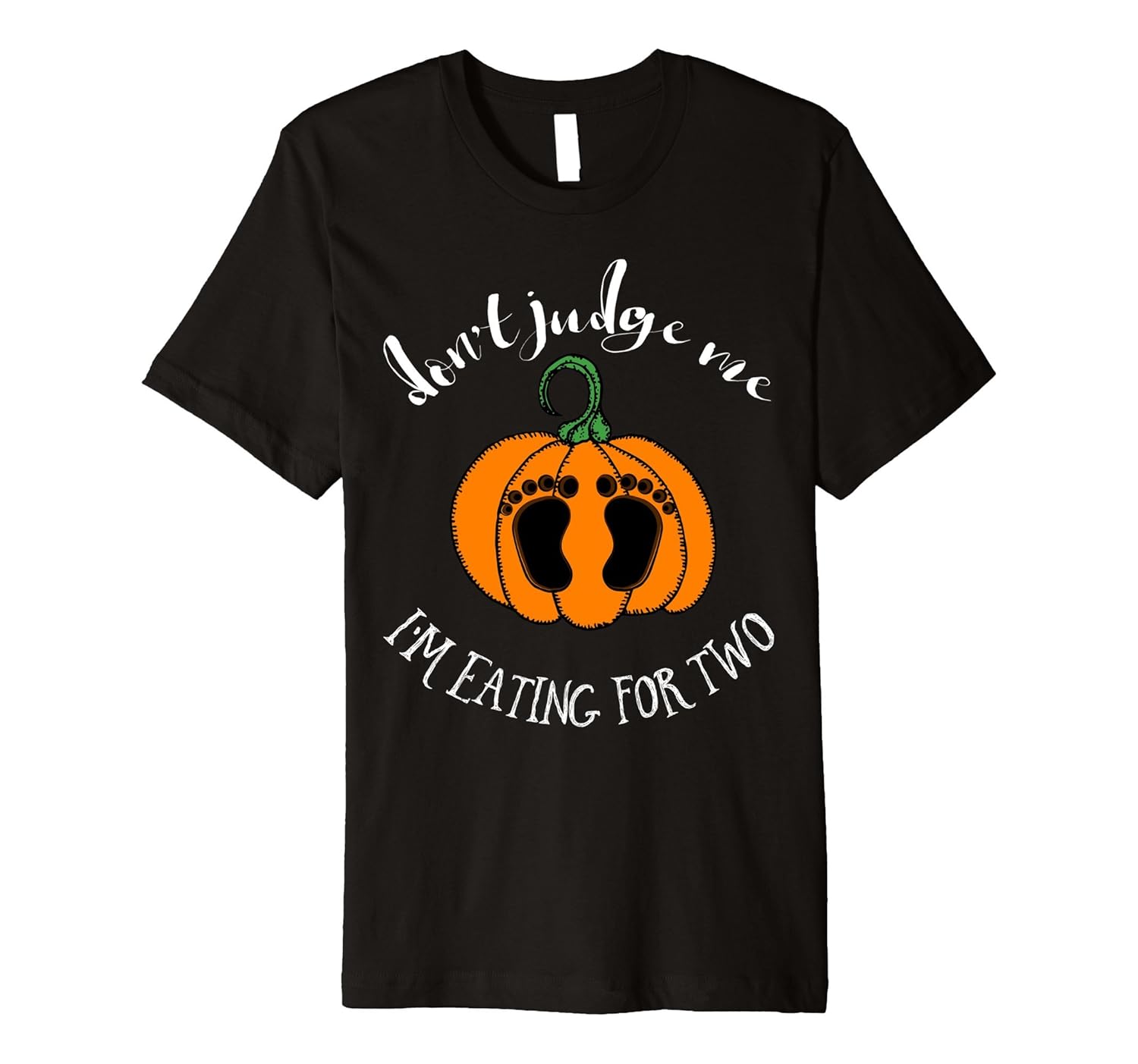 Solid colors: 100% Cotton; Heather Grey: 90% Cotton, 10% Polyester; All Other Heathers: 58% Cotton, 42% Polyester; Imported; Machine wash cold with like colors, dry low heat; Dont judge me Im eating for two is a funny Thanksgiving pregnancy announcement shirt to share your great news. Featuring a cute pumpkin graphic and two baby footprints this cute pregnancy reveal shirt is perfect for mothers to be.; Fit: Slim (consider ordering a larger size for a looser fit); This cute Thanksgiving pregnancy announcement shirt is a perfect gift for expectant mothers who plan on eating for two. Get your dont judge me Im eating for two Thanksgiving pregnancy announcement shirt to help you share your new addition.; This premium t-shirt is made of lightweight fine jersey fabric