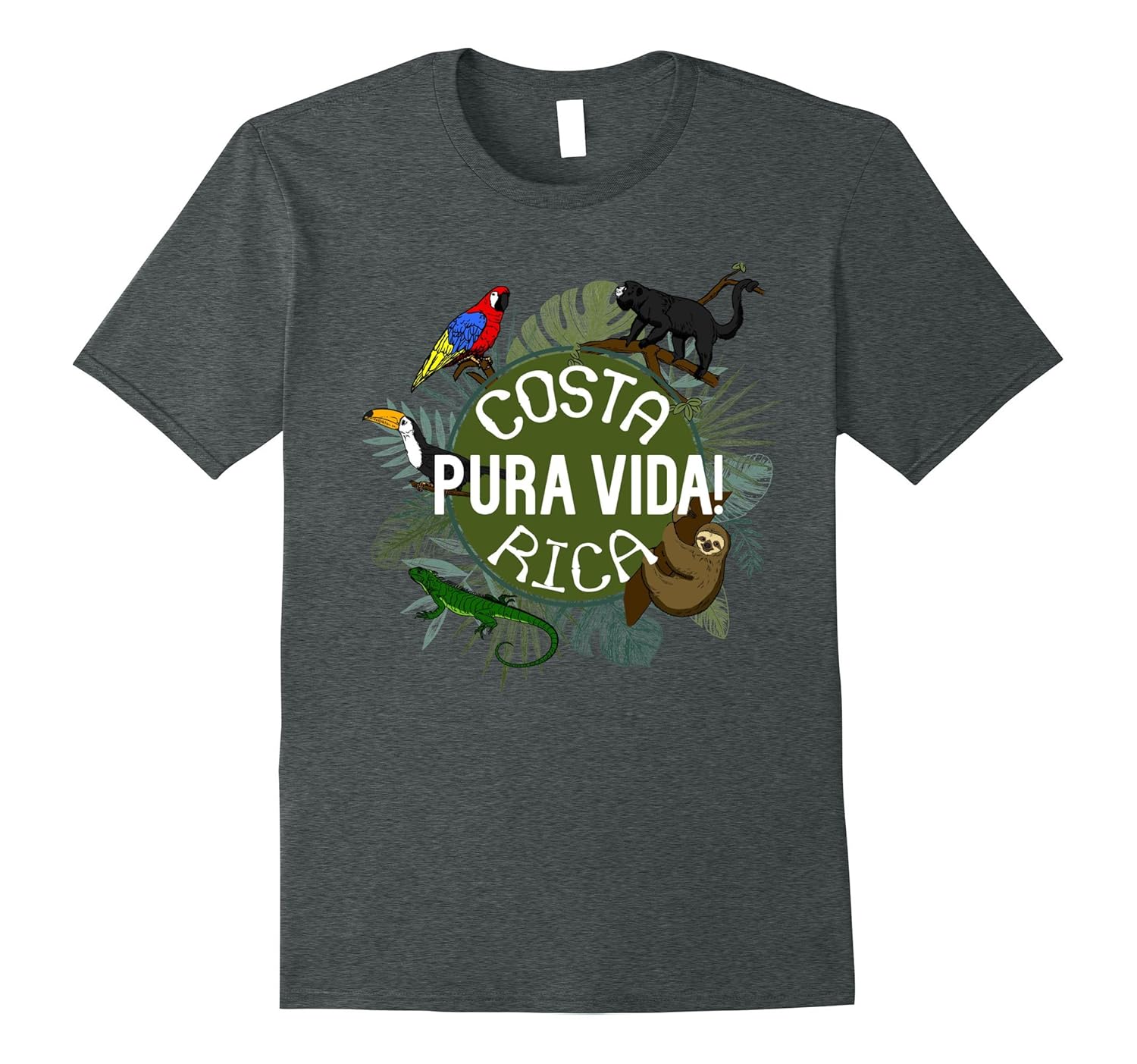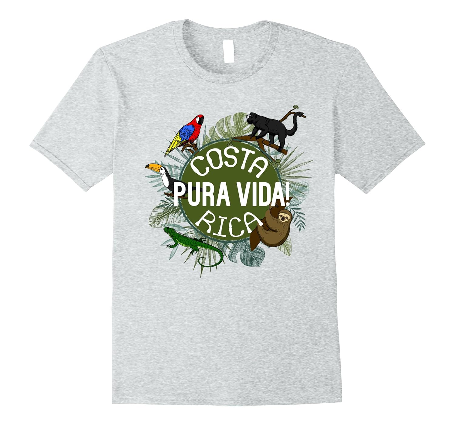 Solid colors: 100% Cotton; Heather Grey: 90% Cotton, 10% Polyester; All Other Heathers: 65% Cotton, 35% Polyester, Imported, Machine wash cold with like colors, dry low heat, Costa Rica Pura Vida Tee Shirt. Showcase The Pura Vida Lifestyle with this Great Looking Shirt!, Plush Costa Rica Jungle Plants With Local Costa Rican Animals, including: Parrot, Howler Monkey, Three fingered sloth, Iquana and Toucan!, Lightweight, Classic fit, Double-needle sleeve and bottom hem