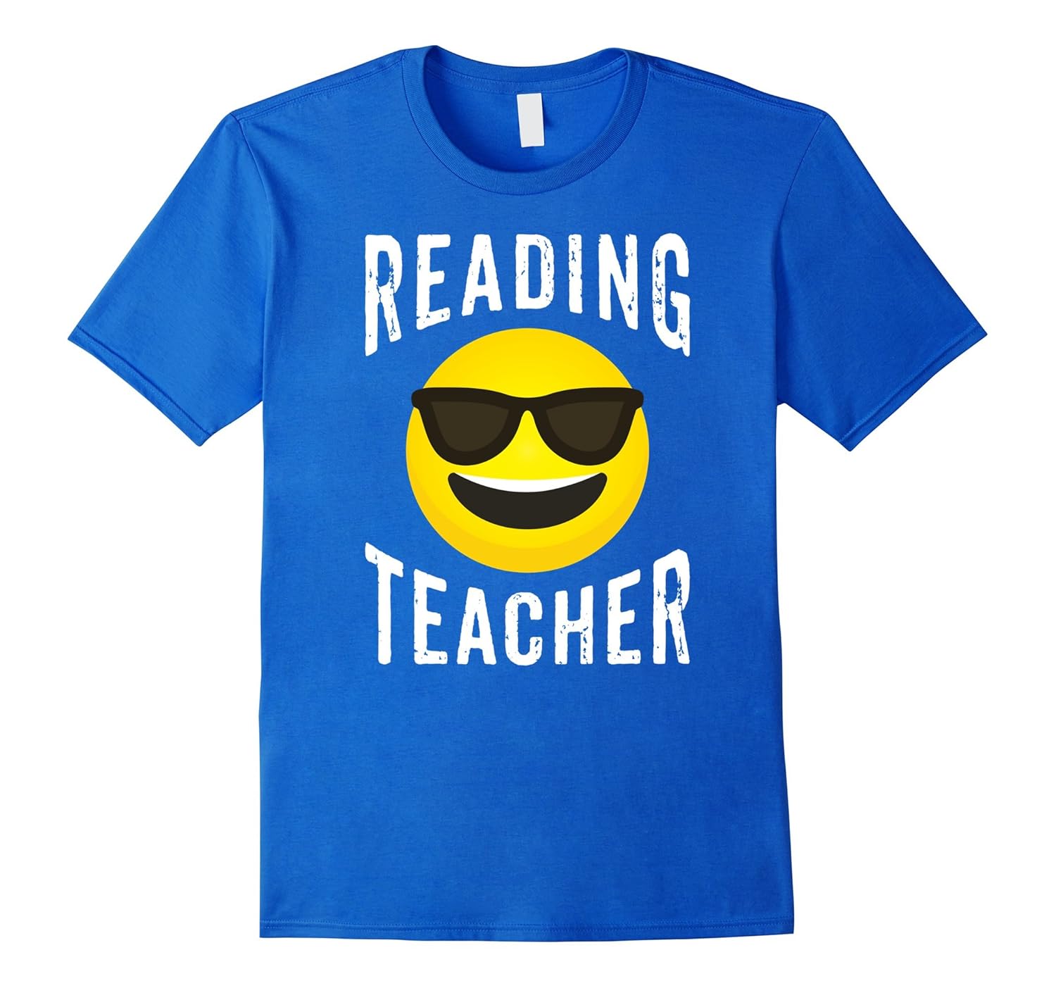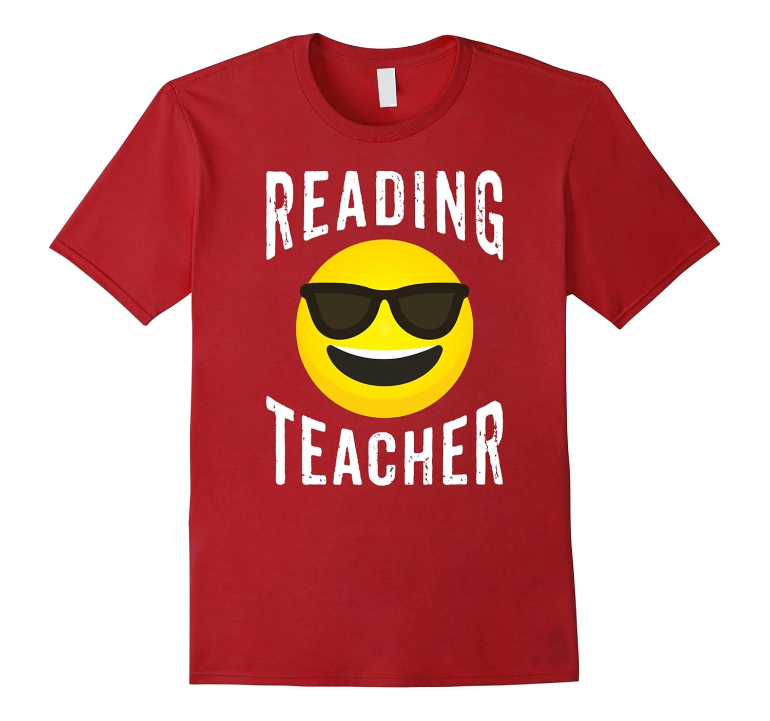 Solid colors: 100% Cotton; Heather Grey: 90% Cotton, 10% Polyester; All Other Heathers: 65% Cotton, 35% Polyester; Imported; Machine wash cold with like colors, dry low heat; Show your pride in teaching reading with this cool yellow smiley face shirt with sunglasses tee. Reading teachers work hard day in and day out helping students learn and grow. This distressed, novelty reading teacher t-shirt will emphasize their coolness.; This sunglass emoji reading teacher t-shirt is fitted. For a looser fit please order a size larger than typical. This emoticon smiley face reading teacher tee shirt is a perfect birthday or Christmas gift for any reading teacher.; Lightweight, Classic fit, Double-needle sleeve and bottom hem