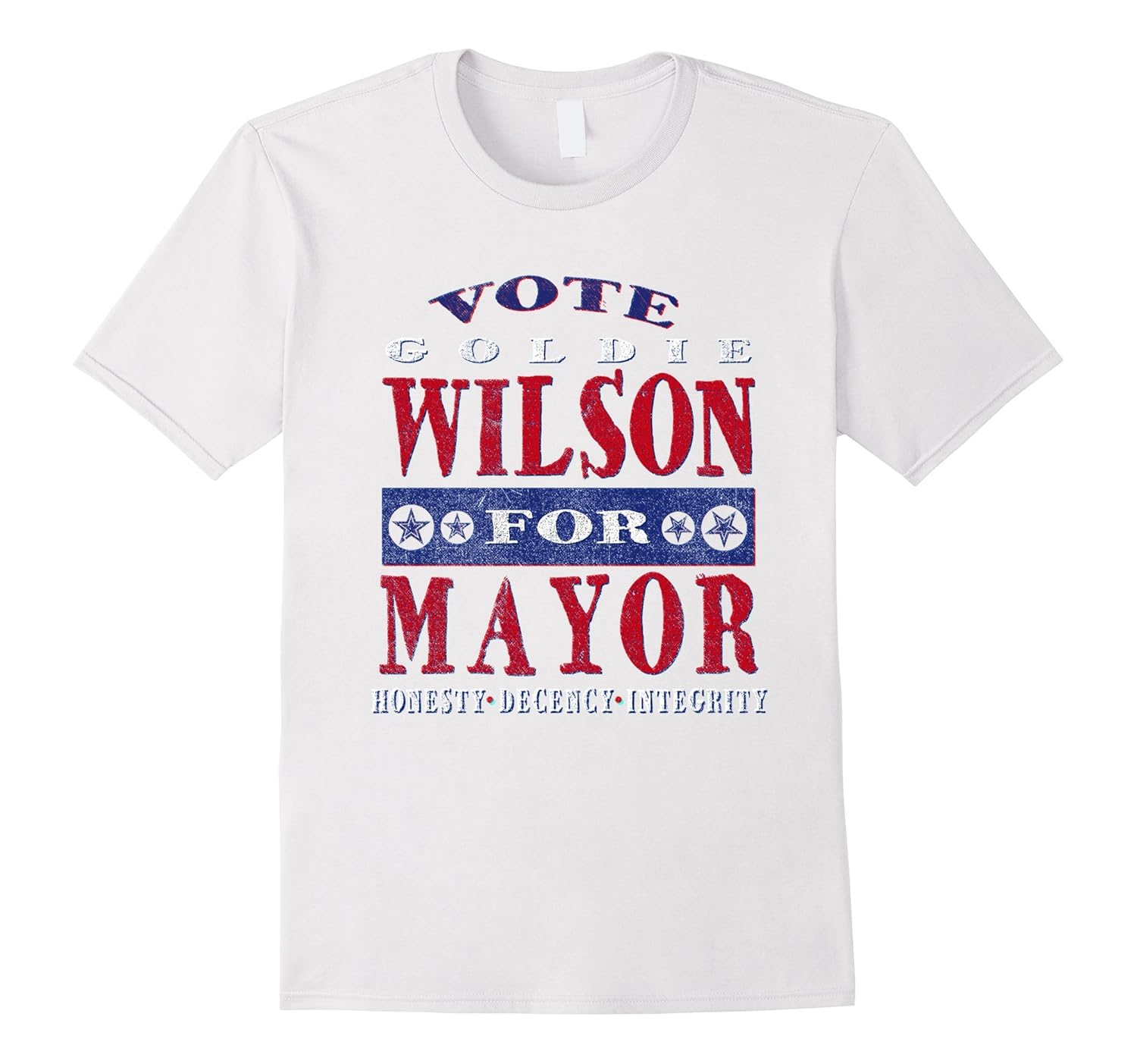 Solid colors: 100% Cotton; Heather Grey: 90% Cotton, 10% Polyester; All Other Heathers: 65% Cotton, 35% Polyester, Imported, Machine wash cold with like colors, dry low heat, Retro Classic Vote Mayor Goldie Wilson TShirt, Classic campaign style red, white and blue design. Lightweight, Classic fit, Double-needle sleeve and bottom hem