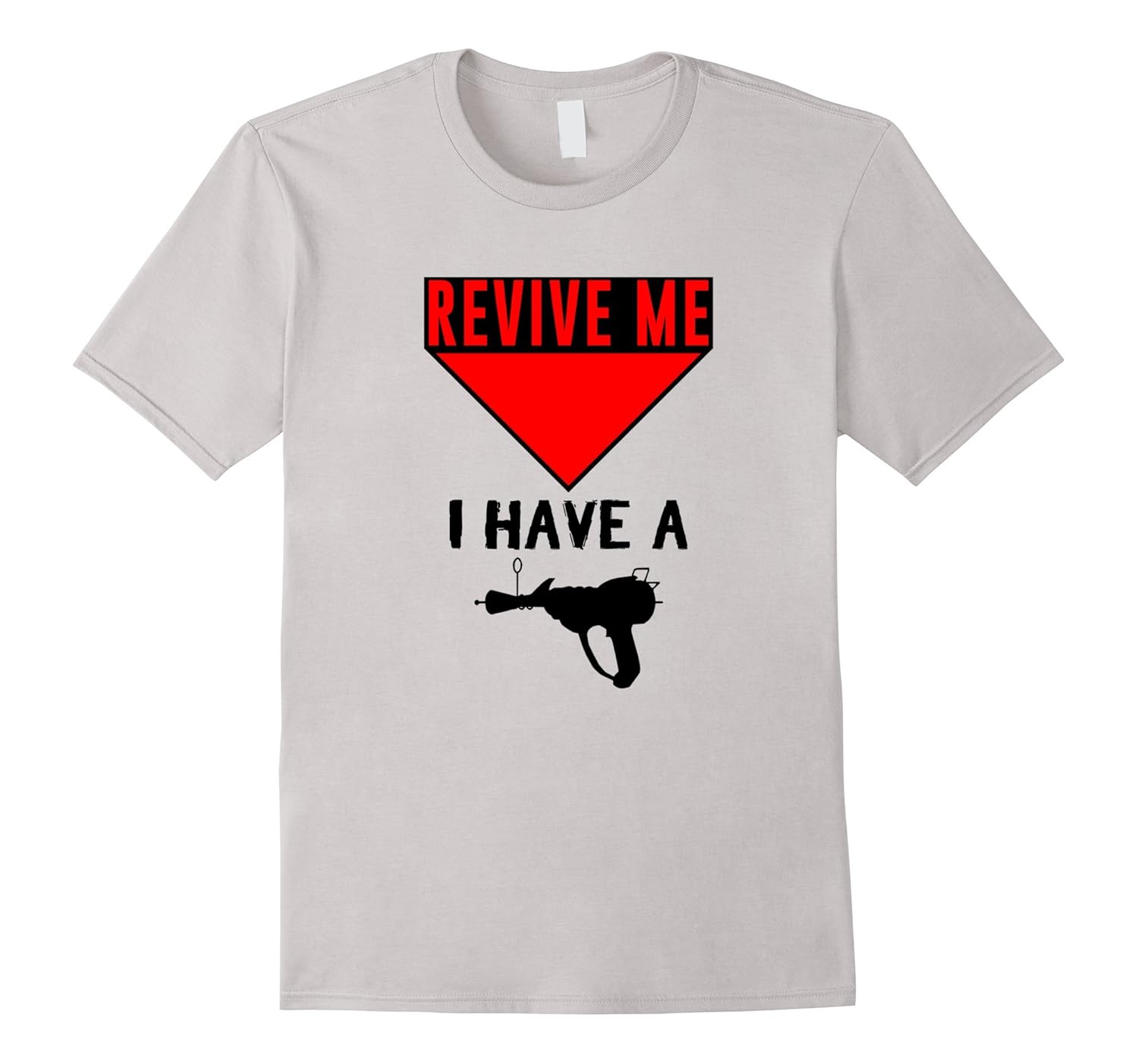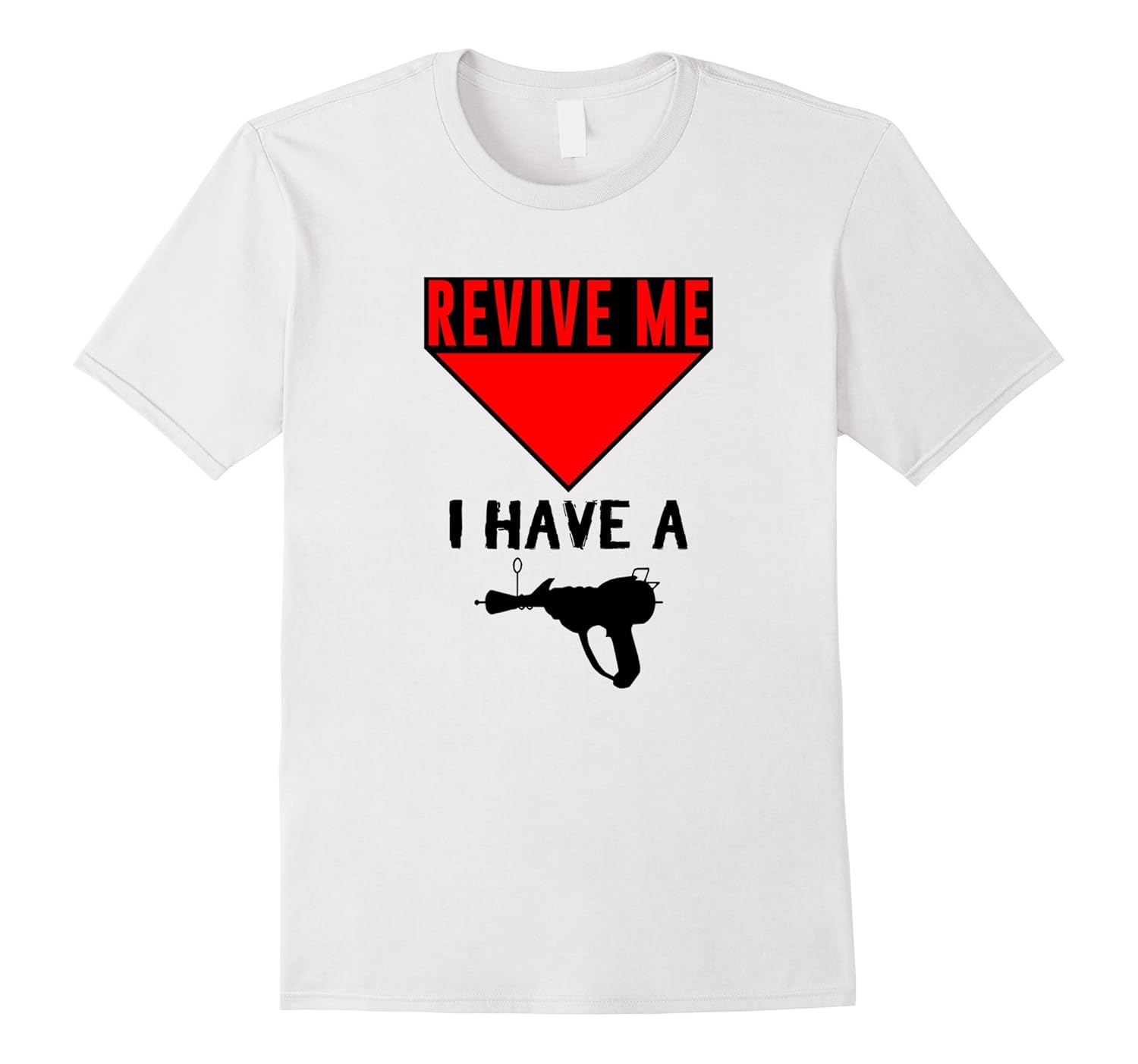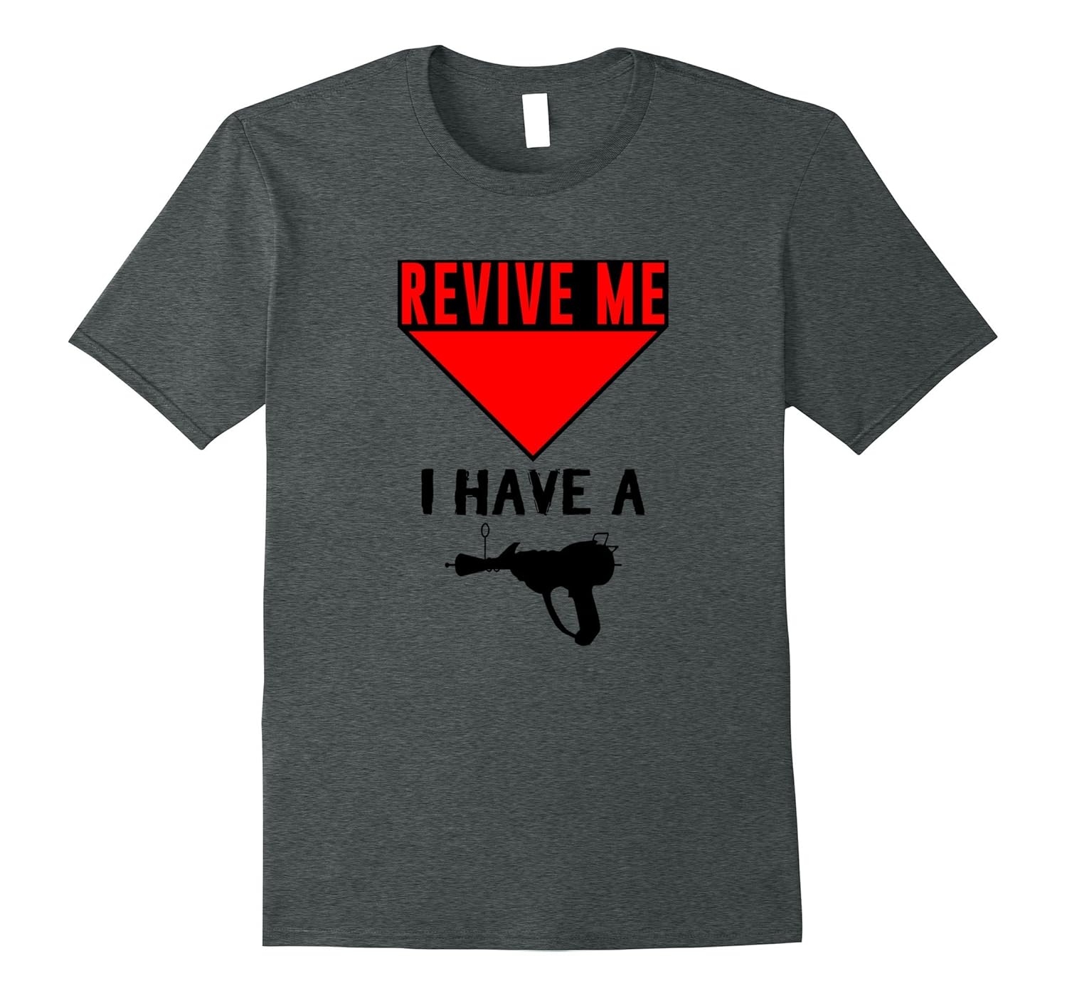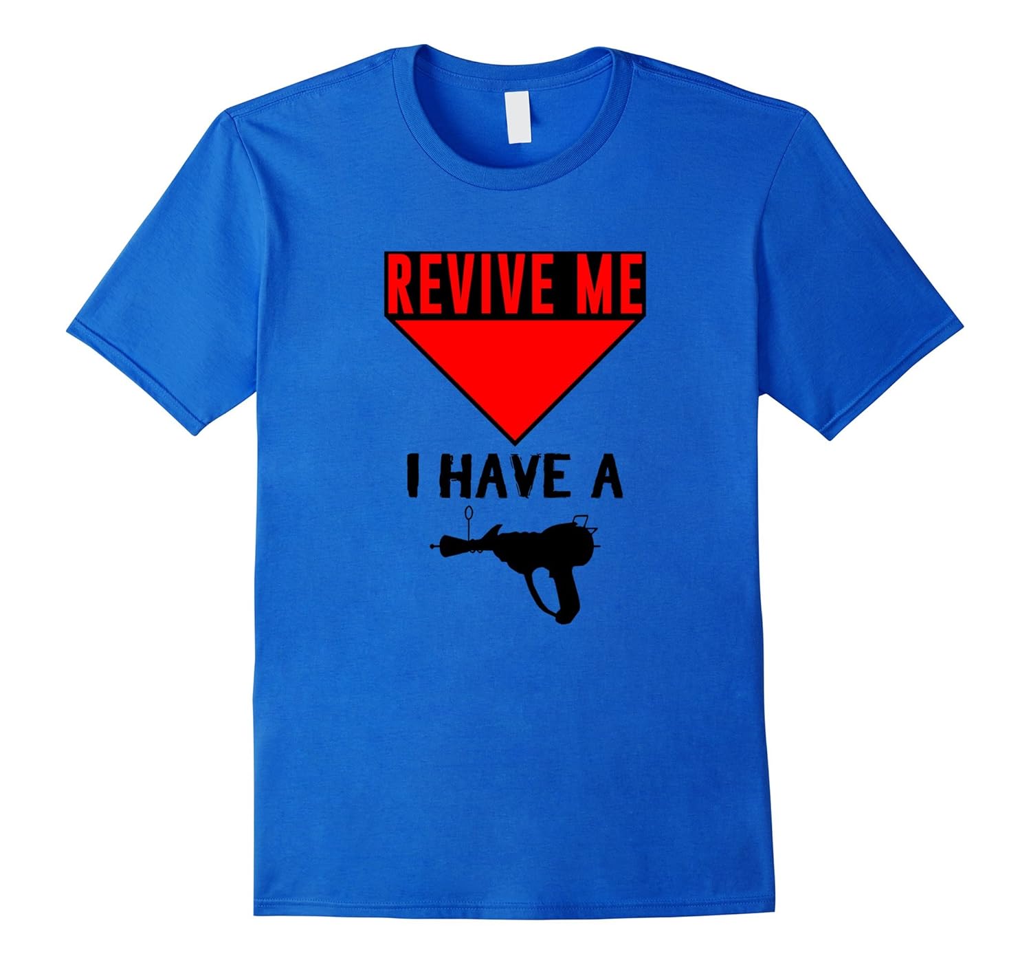 Solid colors: 100% Cotton; Heather Grey: 90% Cotton, 10% Polyester; All Other Heathers: 65% Cotton, 35% Polyester, Imported, Machine wash cold with like colors, dry low heat, Get your “Revive Me I Have A Ray Gun” meme t-shirt today!, For all those zombies lovers with a lot of downs or revives!, Lightweight, Classic fit, Double-needle sleeve and bottom hem