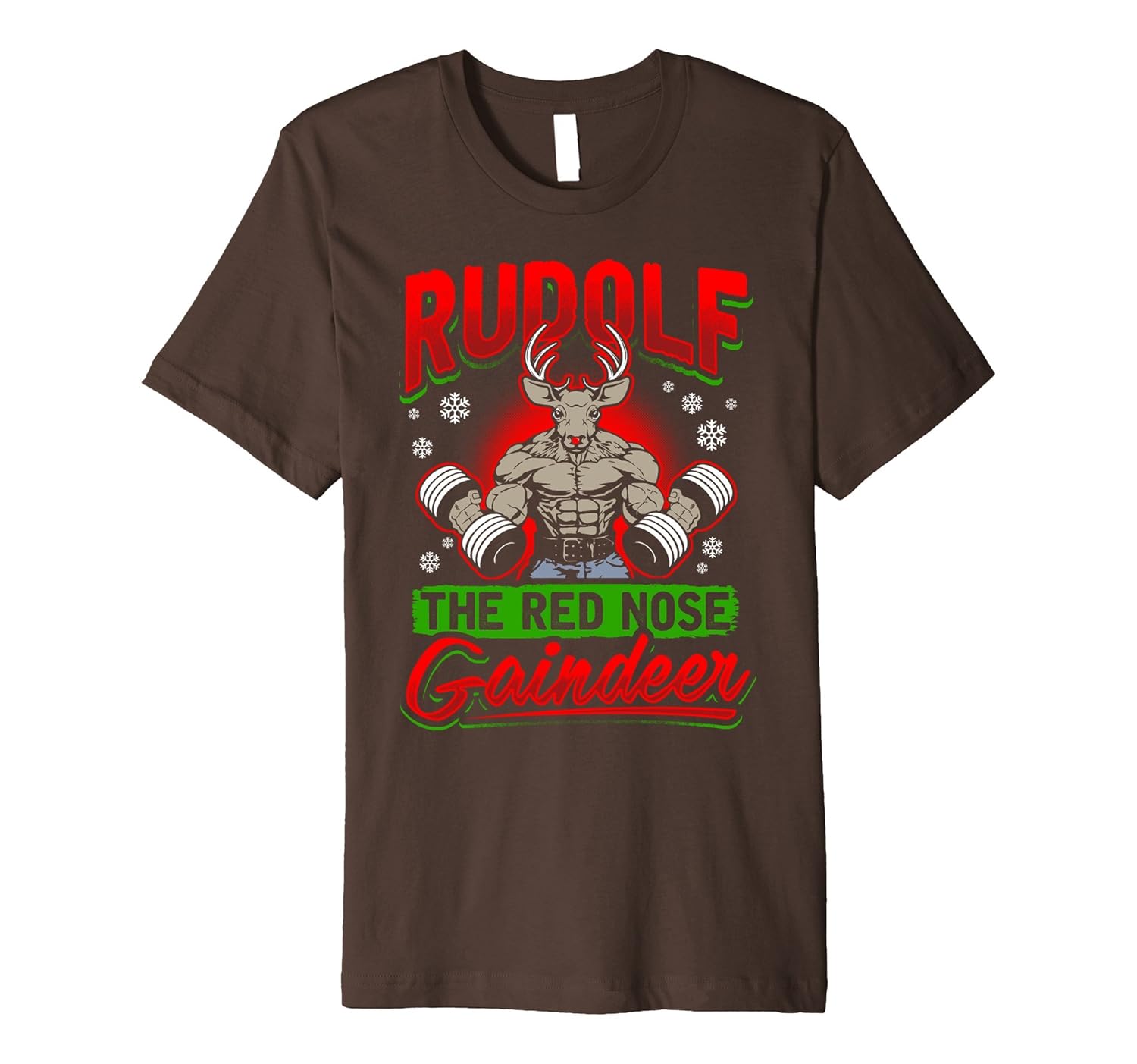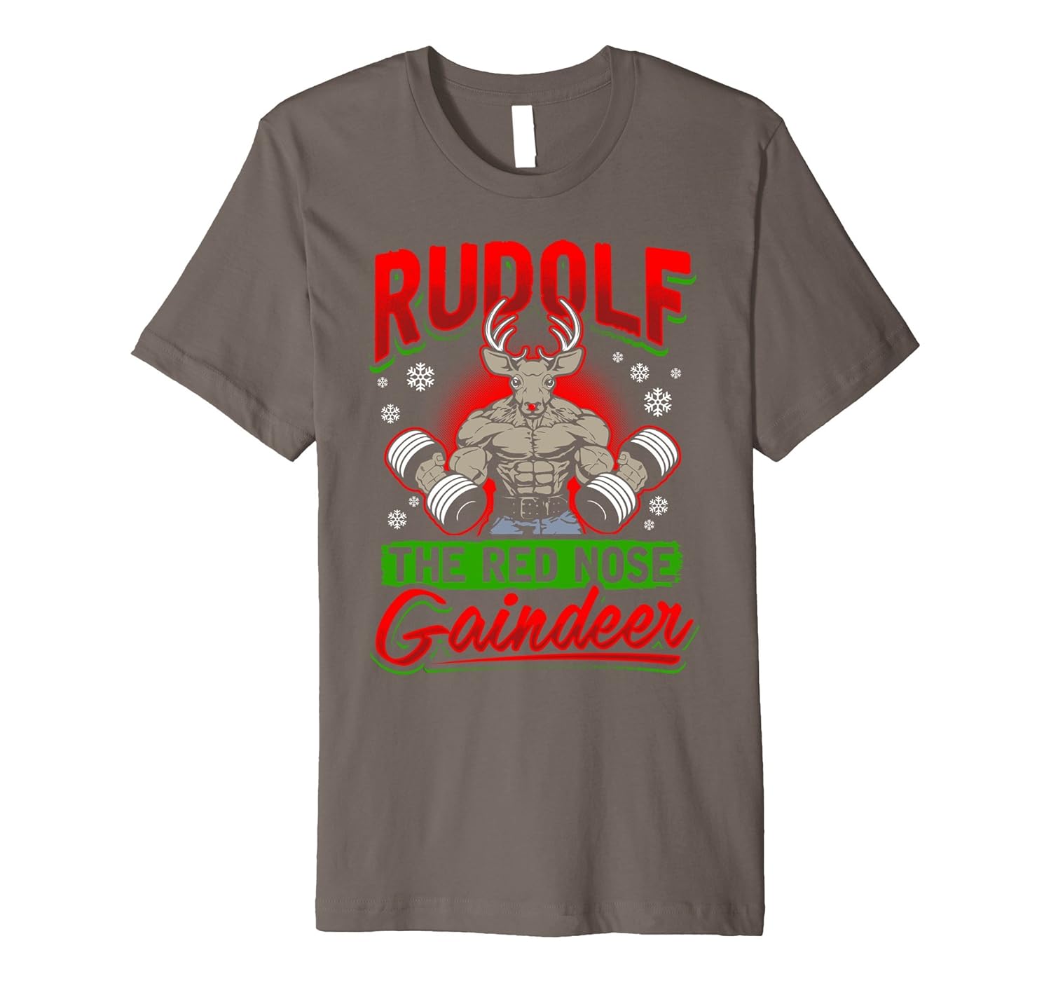 Solid colors: 100% Cotton; Heather Grey: 90% Cotton, 10% Polyester; All Other Heathers: 58% Cotton, 42% Polyester; Imported; Machine wash cold with like colors, dry low heat; Rudolf the red nose gaindeer reindeer funny weightlifting Christmas Tee Shirt. Body builders xmas apparel. Show your muscles for the Holidays in this cool Christmas wear. Perfect shirt for Christmas pictures with the family or girlfriend.; Fit: Slim (consider ordering a larger size for a looser fit); Awesome gift or present to anybody who loves bodybuilding, deadlifting, enjoys fitness and exercise muscle building, goes working out at the gym or weightlifting is his passion. Super cool dad or boyfriend Christmas gift.; This premium t-shirt is made of lightweight fine jersey fabric