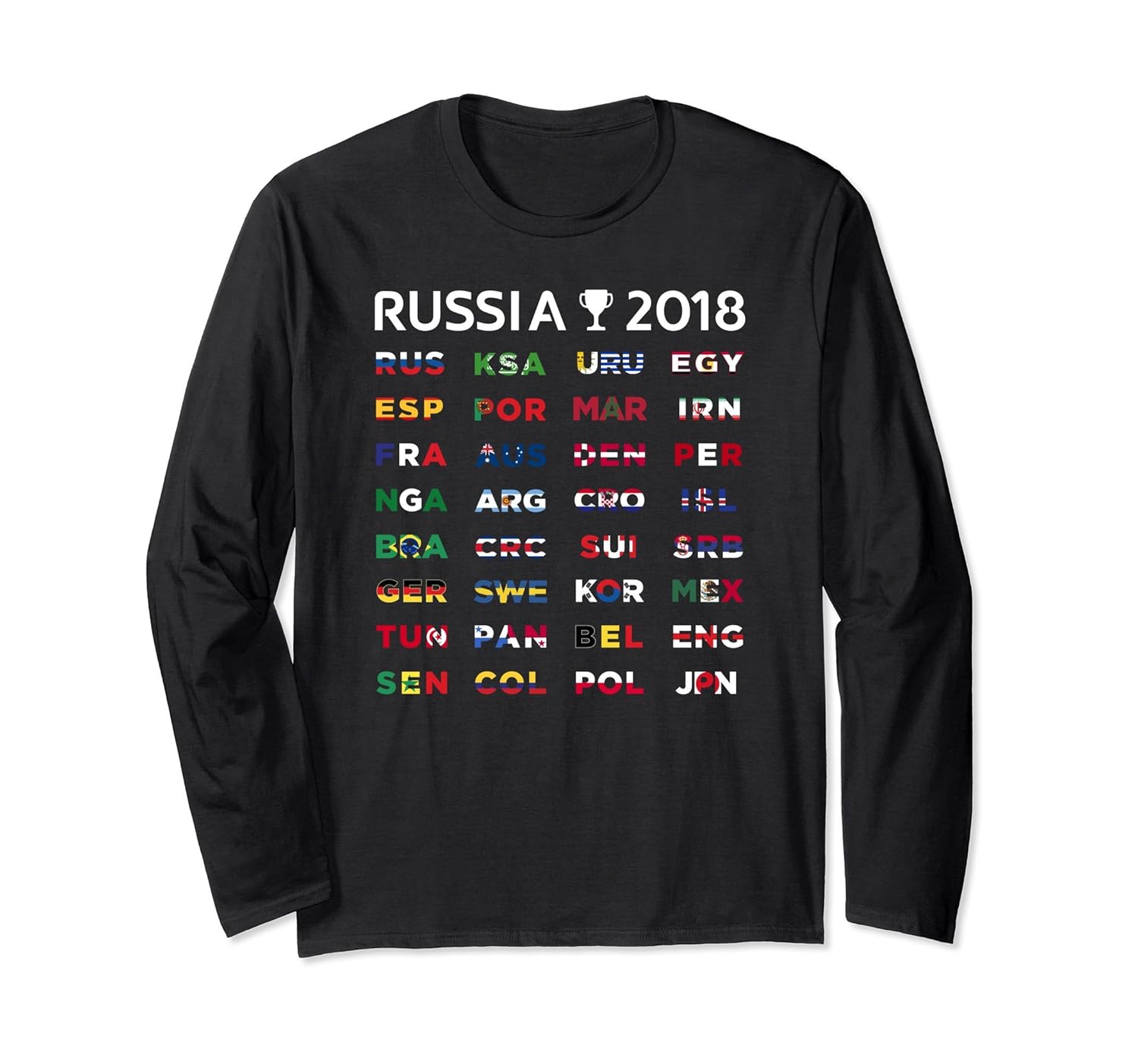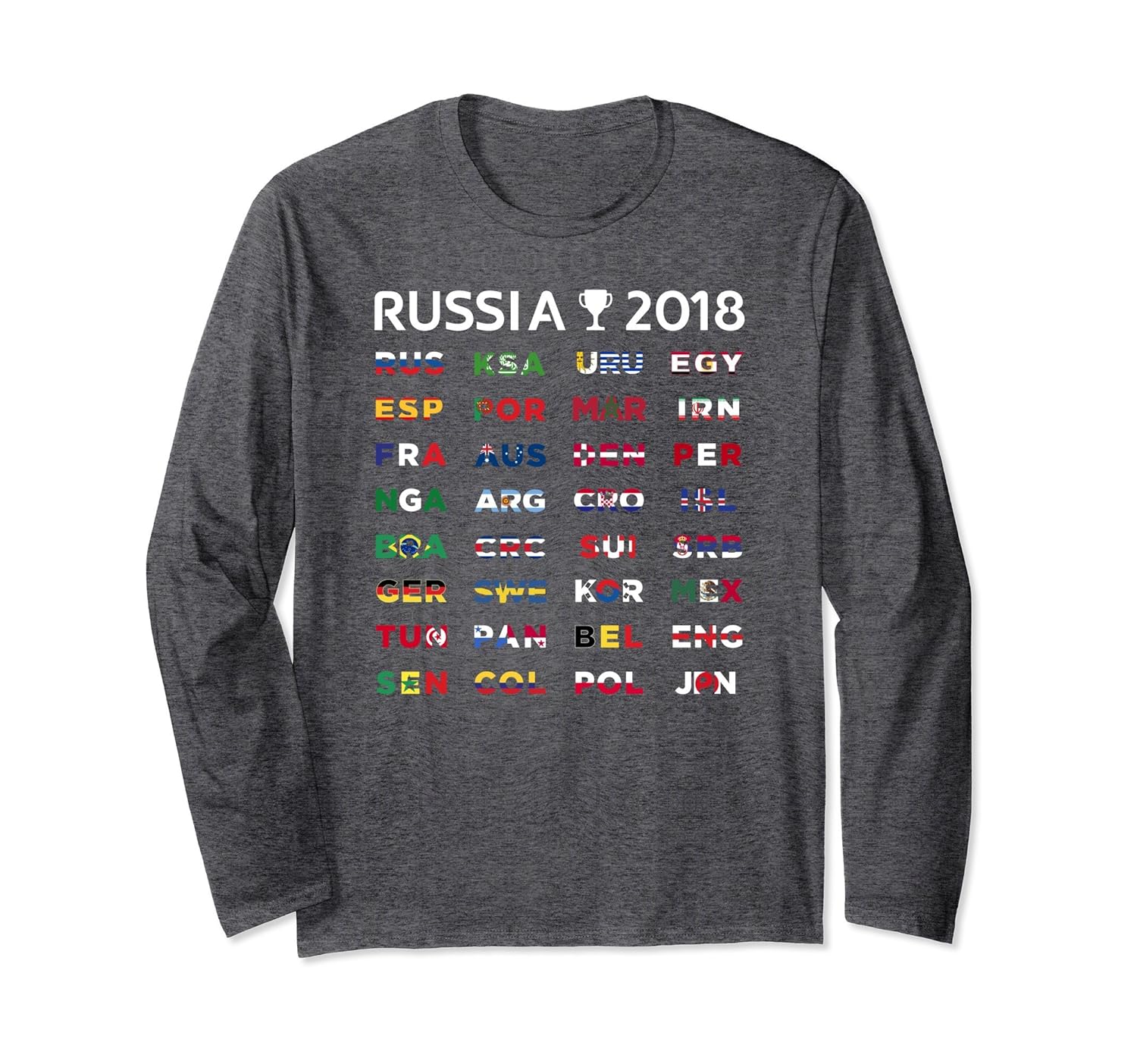 Solid colors: 100% Cotton; Heather Grey: 90% Cotton, 10% Polyester; All Other Heathers: 50% Cotton, 50% Polyester; Imported; Machine wash cold with like colors, dry low heat; Long Sleeve Shirt features 32 qualifying national teams in the Soccer World Futbol Team Cup 2018 in Russia. Each champion country flag is divided by groups. Show love for Russia Uruguay Portugal Spain Iran Morocco France Peru Australia Argentina Croatia; Nigeria Brazil Costa Rica Germany Mexico Sweden South Korea Belgium England Tunisia Poland Colombia Senegal Japan Tunisia Saudi Arabia Panama Colombia Denmark Switzerland Belgium Poland Egypt Iran Iceland Serbia Japan. Purchase as a great soccer fan gift!; Lightweight, Classic fit, Double-needle sleeve and bottom hem