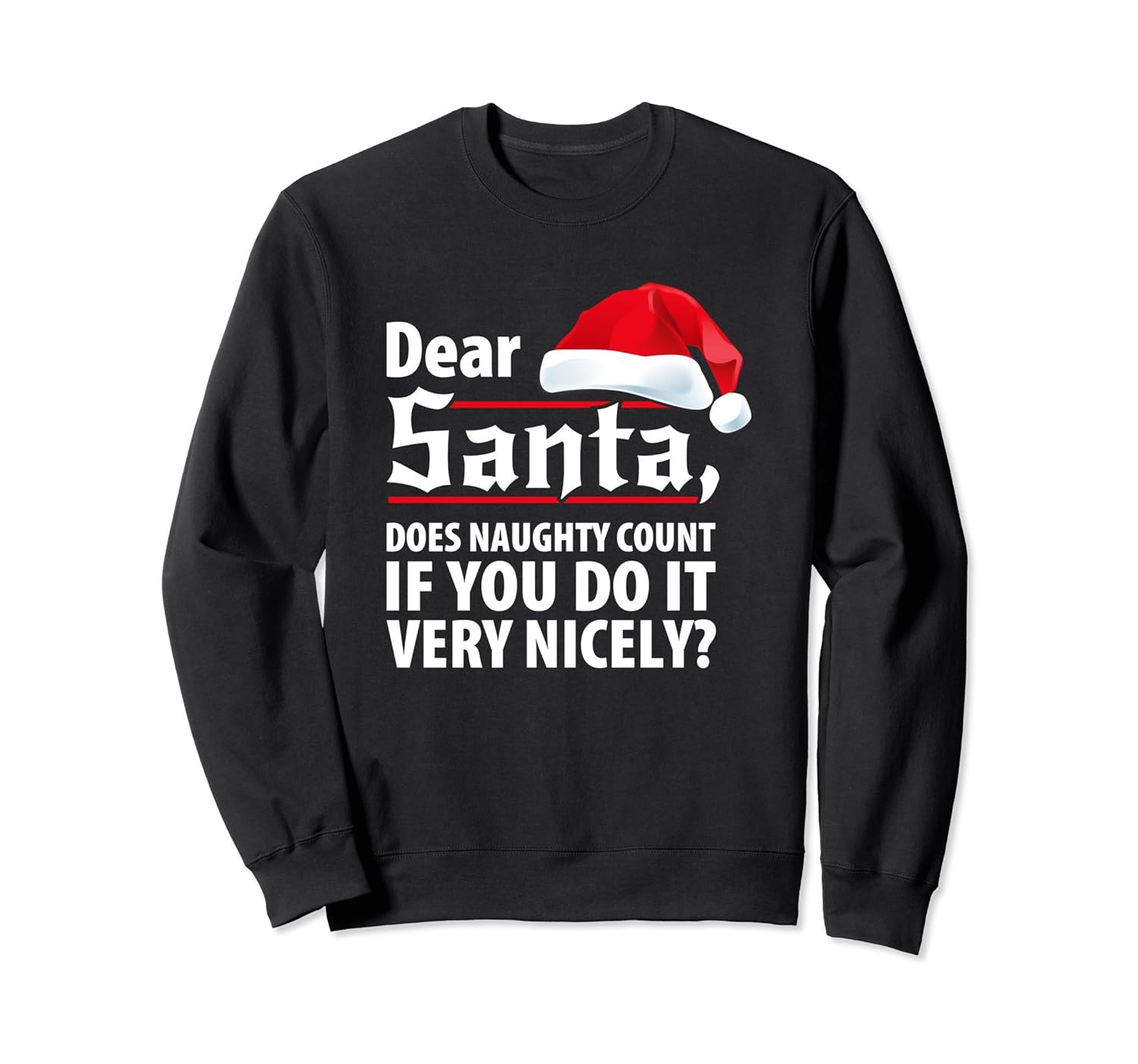 Solid colors: 80% Cotton, 20% Polyester; Heather Grey: 78% Cotton, 22% Poly; Dark Heather: 50% Cotton, 50% Polyester; Imported; Machine wash cold with like colors, dry low heat; Coworkers, family members or friends who love a good laugh will get a kick out of this humorous holiday Sweatshirt. Dear Santa Does Naughty Count If You Do It Very Nicely shirt will make a great Christmas gift.; Order your funny, festive Sweatshirt to wear to the office Christmas Party, the mall for your holiday shopping, at a special Christmas Event or wear it just through the Xmas holidays for fun! A must have for family pictures for the holiday season.; 8.5 oz, Classic fit, Twill-taped neck