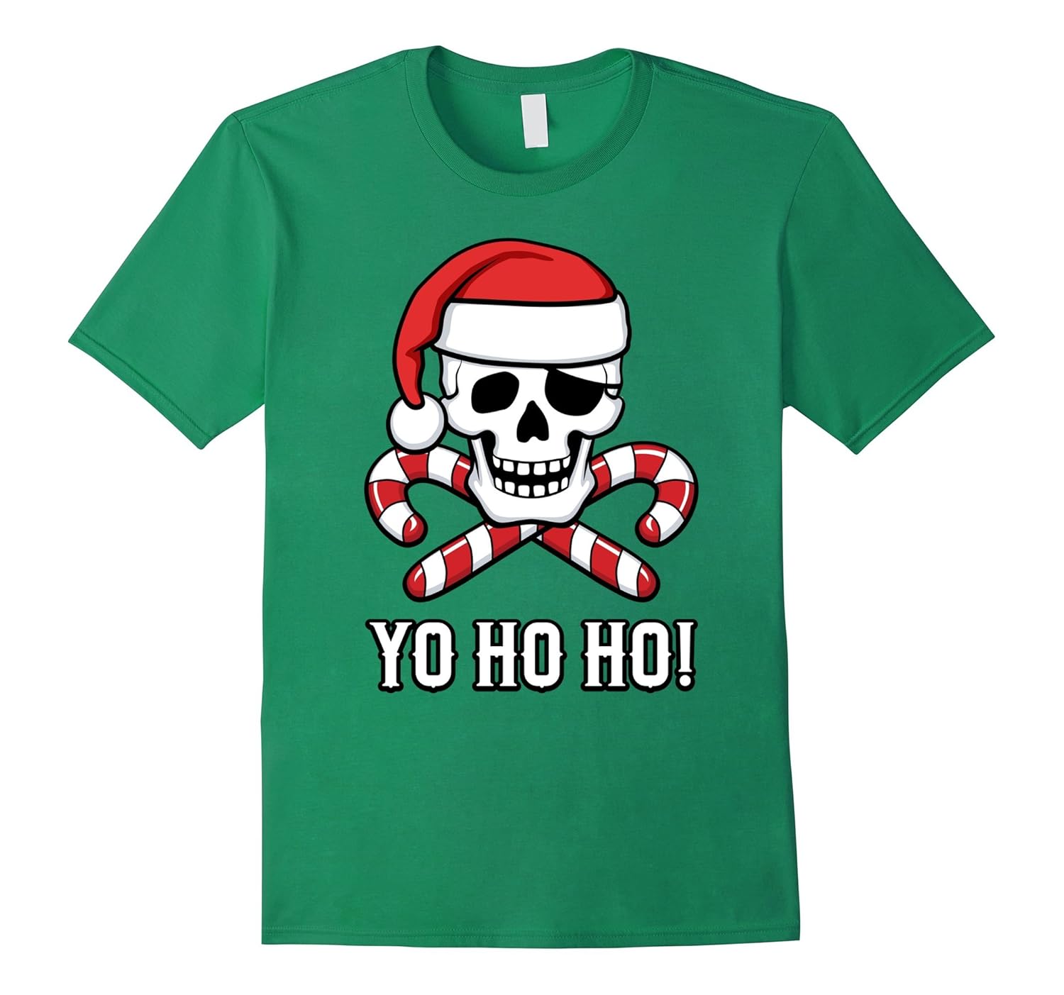 Solid colors: 100% Cotton; Heather Grey: 90% Cotton, 10% Polyester; All Other Heathers: 65% Cotton, 35% Polyester; Imported; Machine wash cold with like colors, dry low heat; Fun Christmas tee shirt. Yo Ho Ho! skull wearing Santa hat and crossed candy canes. Humorous holiday gift.; Lightweight, Classic fit, Double-needle sleeve and bottom hem