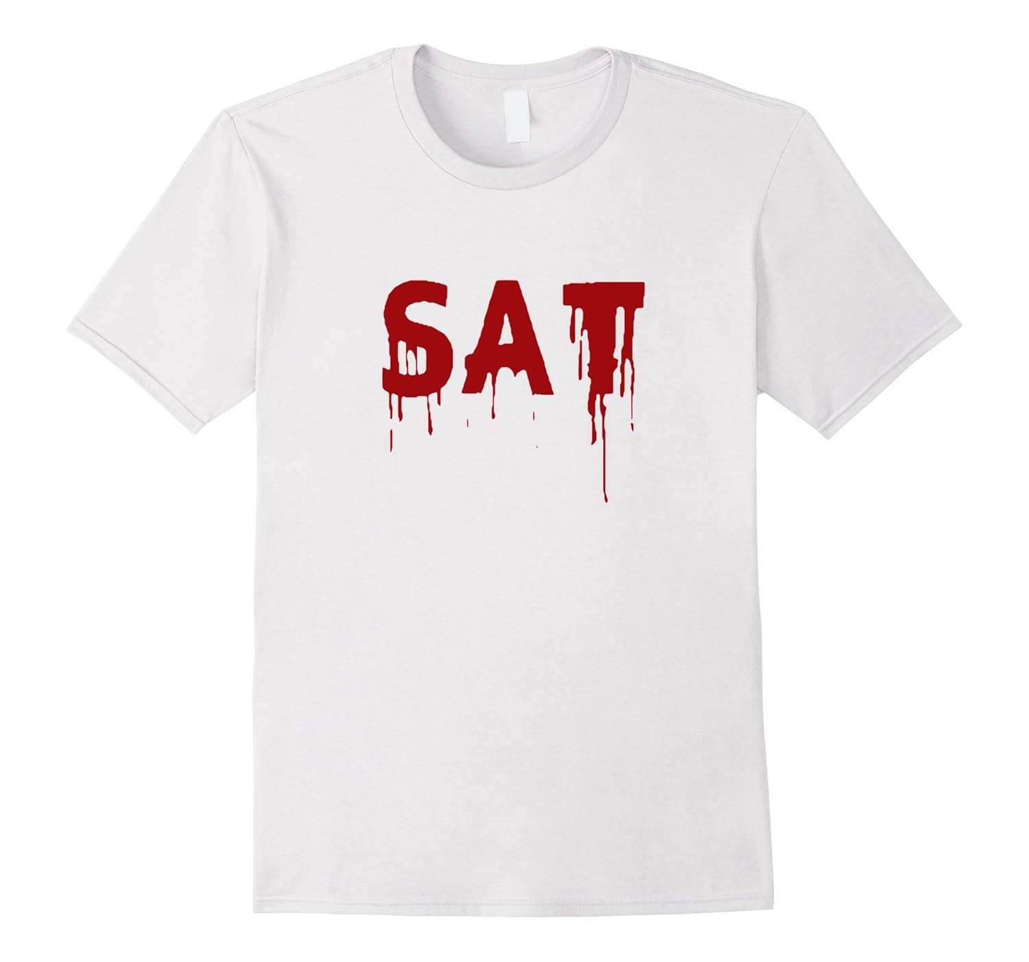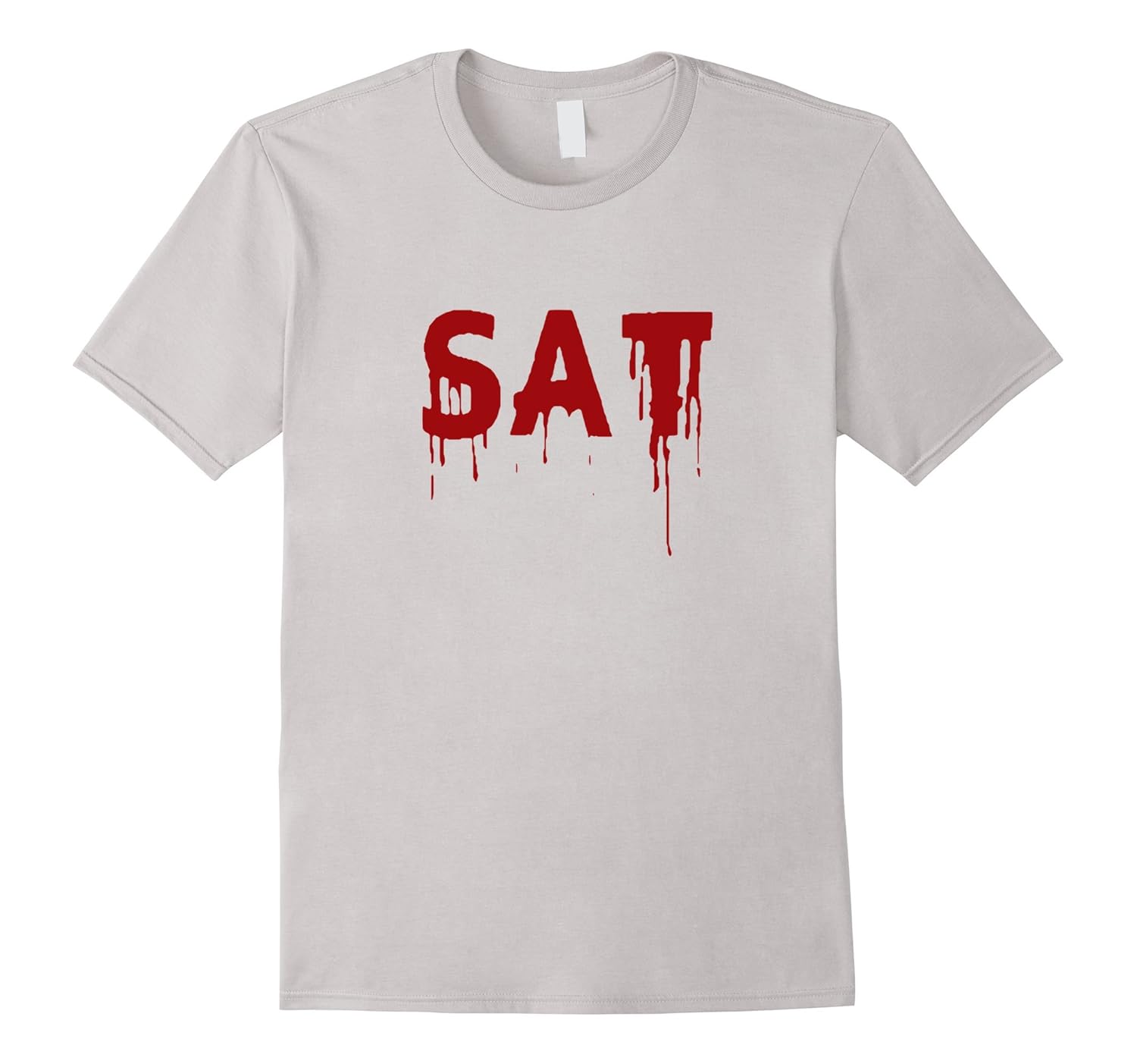 Solid colors: 100% Cotton; Heather Grey: 90% Cotton, 10% Polyester; All Other Heathers: 65% Cotton, 35% Polyester, Imported, Machine wash cold with like colors, dry low heat, Looking for a shark attack costume. Tee shirt is printed with SAT to represent Saturday. Great for a group days of the week costume matching set or for a week of sharks. Classic blood font for blood enthusiasts. All of the matching set by clicking on “Days of the Week Shark Attack T-shirts” above. Easy, last minute costume. Complete your Halloween outfit today. Awesome group Halloween costume for families, sororities, fraternities, adults, kids, teens, and women. Lightweight, Classic fit, Double-needle sleeve and bottom hem