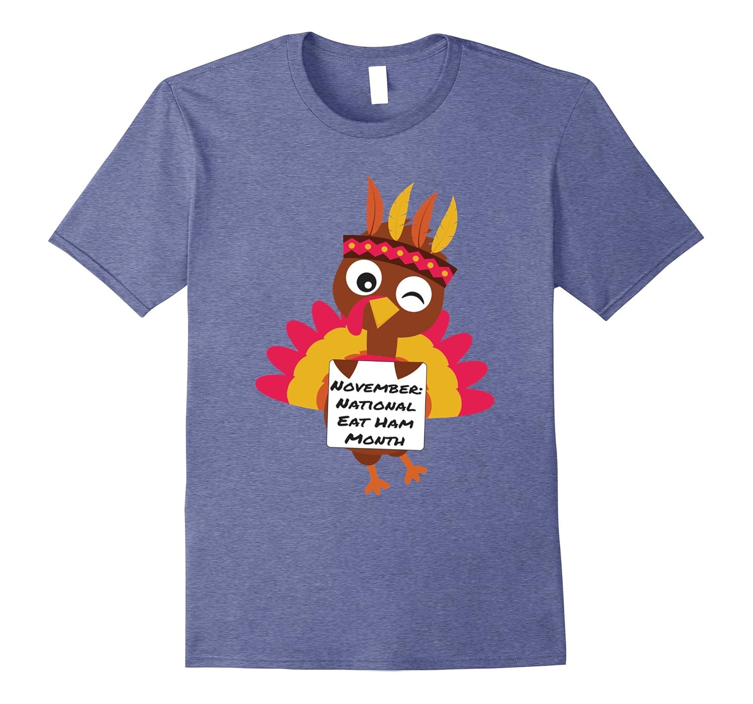 Solid colors: 100% Cotton; Heather Grey: 90% Cotton, 10% Polyester; All Other Heathers: 65% Cotton, 35% Polyester, Imported, Machine wash cold with like colors, dry low heat, Fun design for both adults and kids to wear this fall and on Thanksgiving Day. Features a cute turkey trying to convince you that November is National Eat Ham Month. Cute birthday gift, Christmas gift, white elephant gift or for any other gift giving occasion. Can be worn for Halloween, Thanksgiving, Christmas or any other fun occasion that requires a funny t-shirt. Lightweight, Classic fit, Double-needle sleeve and bottom hem