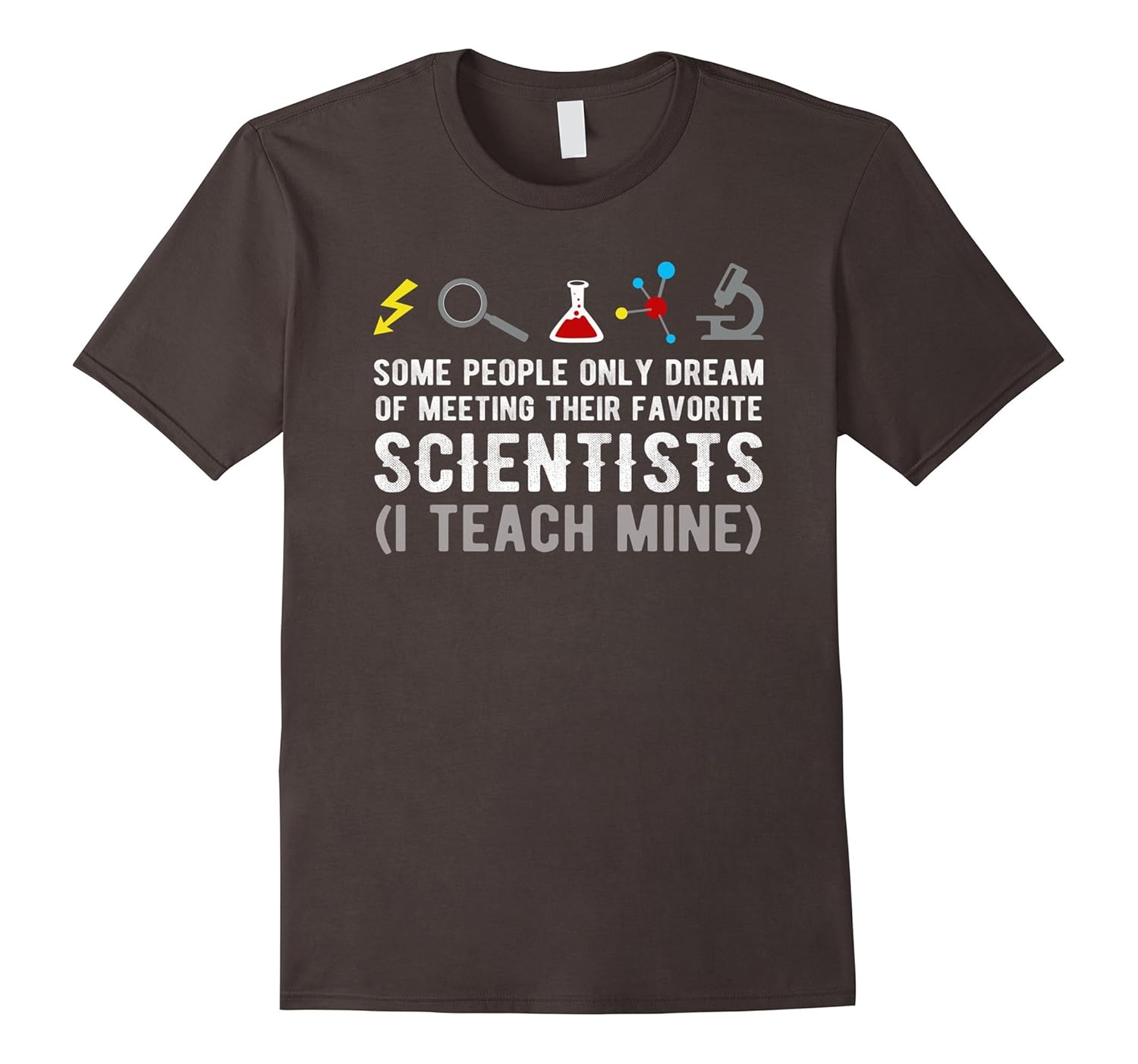 Solid colors: 100% Cotton; Heather Grey: 90% Cotton, 10% Polyester; All Other Heathers: 65% Cotton, 35% Polyester; Imported; Machine wash cold with like colors, dry low heat; A cool humor graphic design tee that reads Some People Only Dream Of Meeting Their Favorite Scientists I Teach Mine in distressed English text! If you freaking love funny English quotes, sarcastic sayings or a science geek, then this outfit is for you!; Makes the perfect birthday gift for your awesome family, friends Andamp; science teachers! This trendy, novelty graphic shirt will be a hilarious present that will bring a smile to kids Andamp; adults! Comfortable to wear casually at school, work or any occasion!; Lightweight, Classic fit, Double-needle sleeve and bottom hem